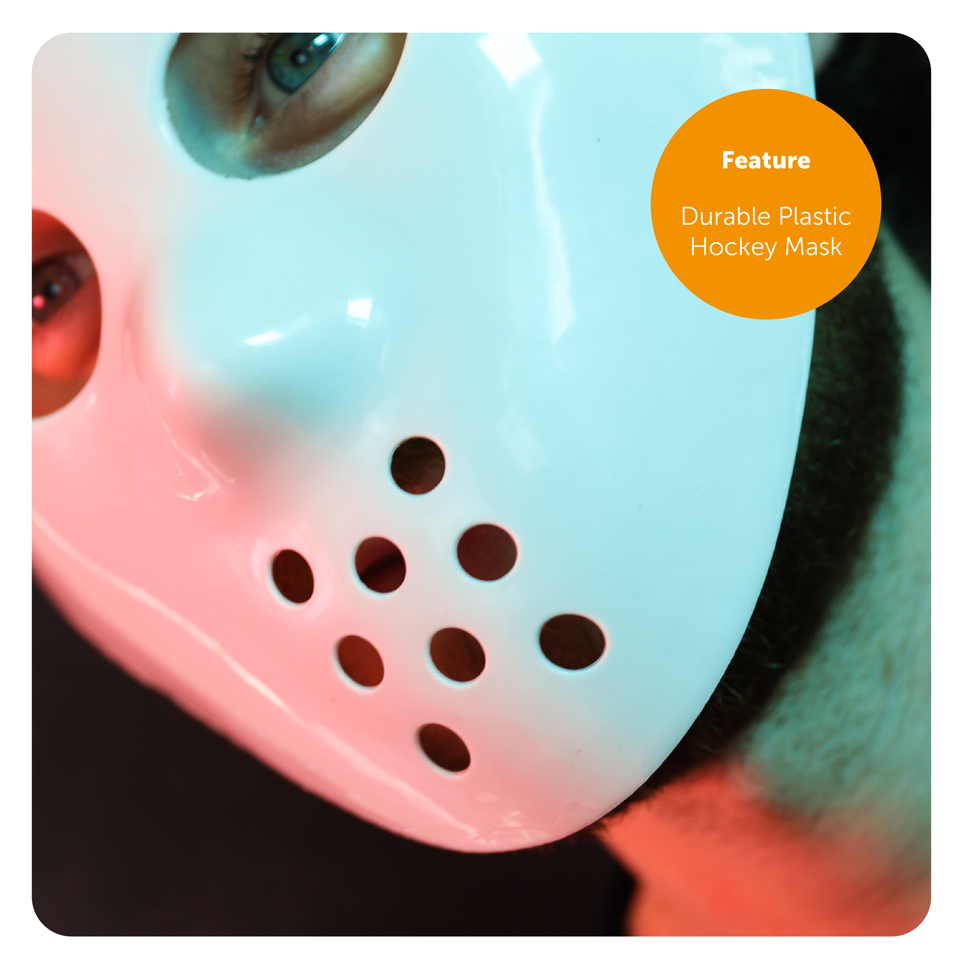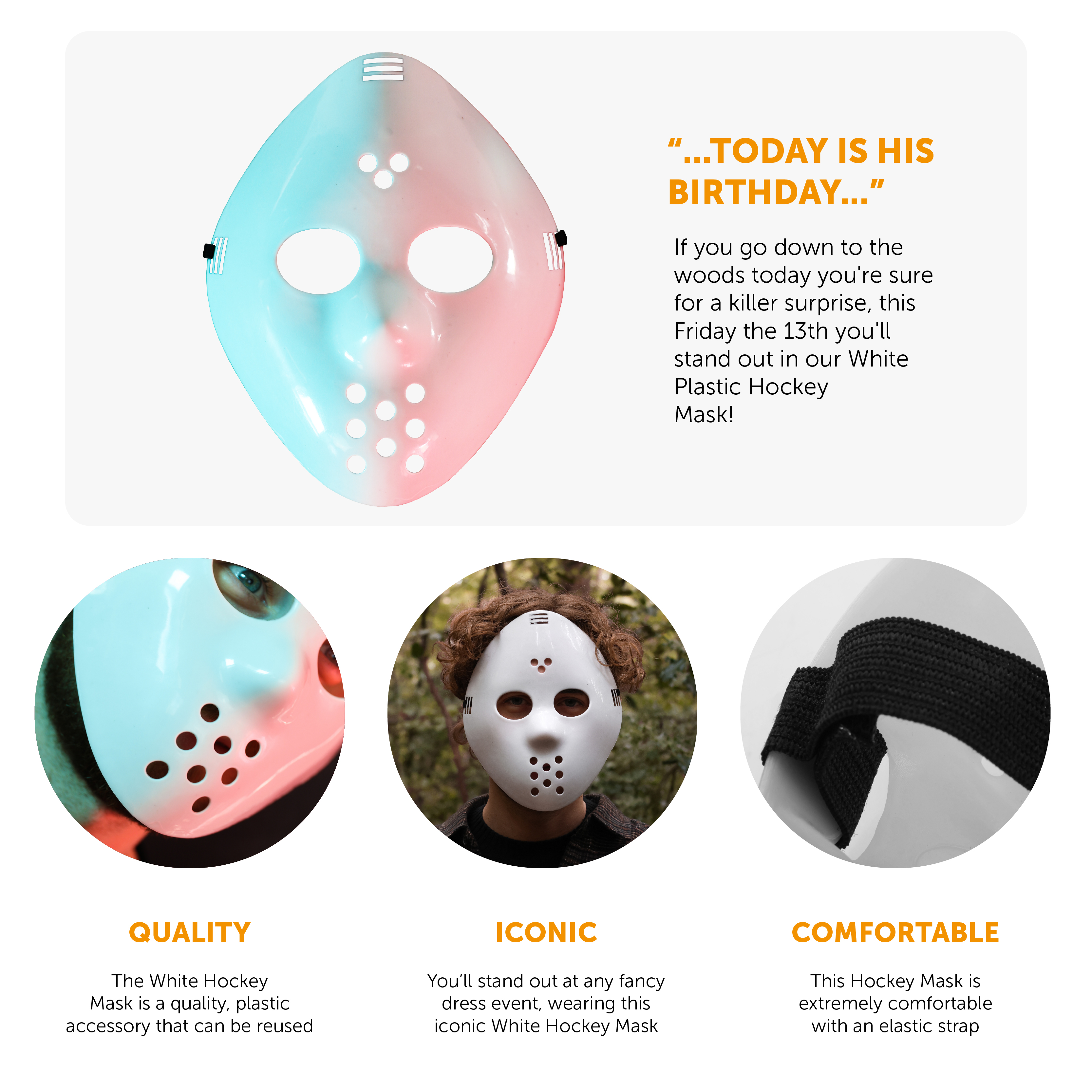 MASK DETAILS: An iconic quality White Hockey Mask, made with a durable plastic and with a comfortable elastic strap, the perfect accessory to your Halloween Costume!