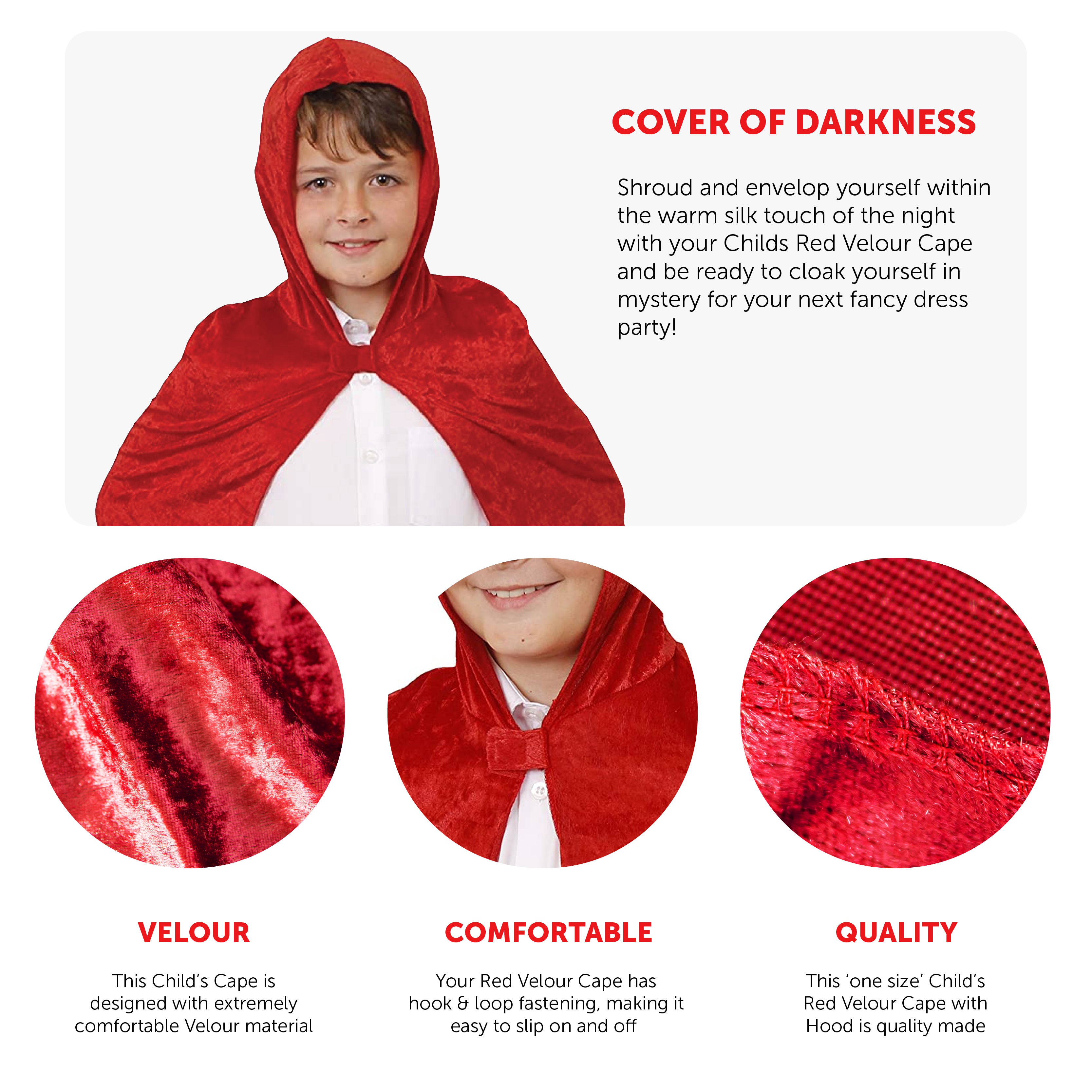 ONE SIZE FITS ALL CHILDS: Regardless of your height or size, our Childs Red Velour Cape is a suitable and perfect size for any child to wear comfortably throughout the night and day for their fancy dress parties and events!