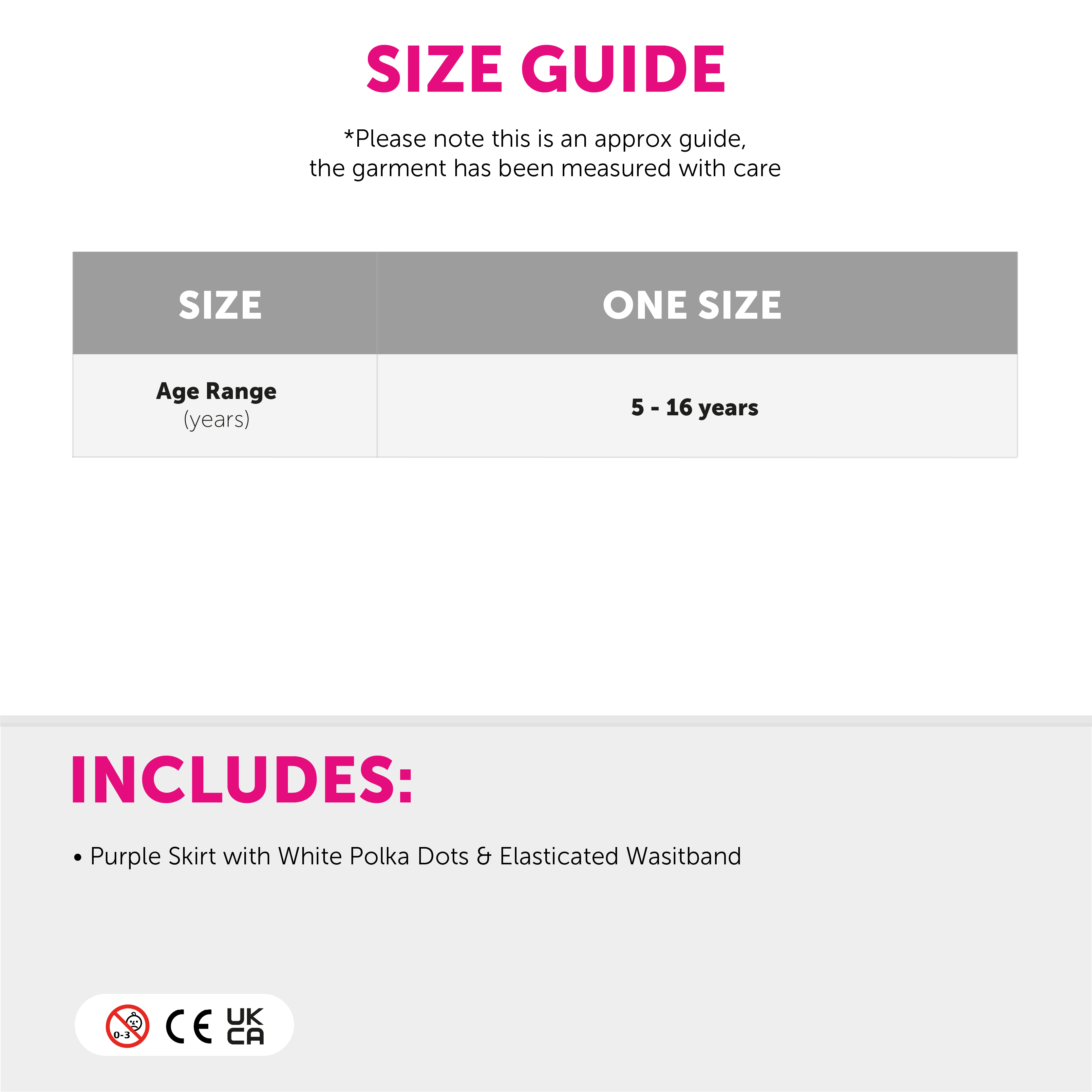 AVAILABLE IN ONE SIZE: Your Girls Purple Polka Dot Skirt is available in one size only; Age Range 8 - 14 years, Waist 22/30" (56/76cm), Length 25" (63.5cm)