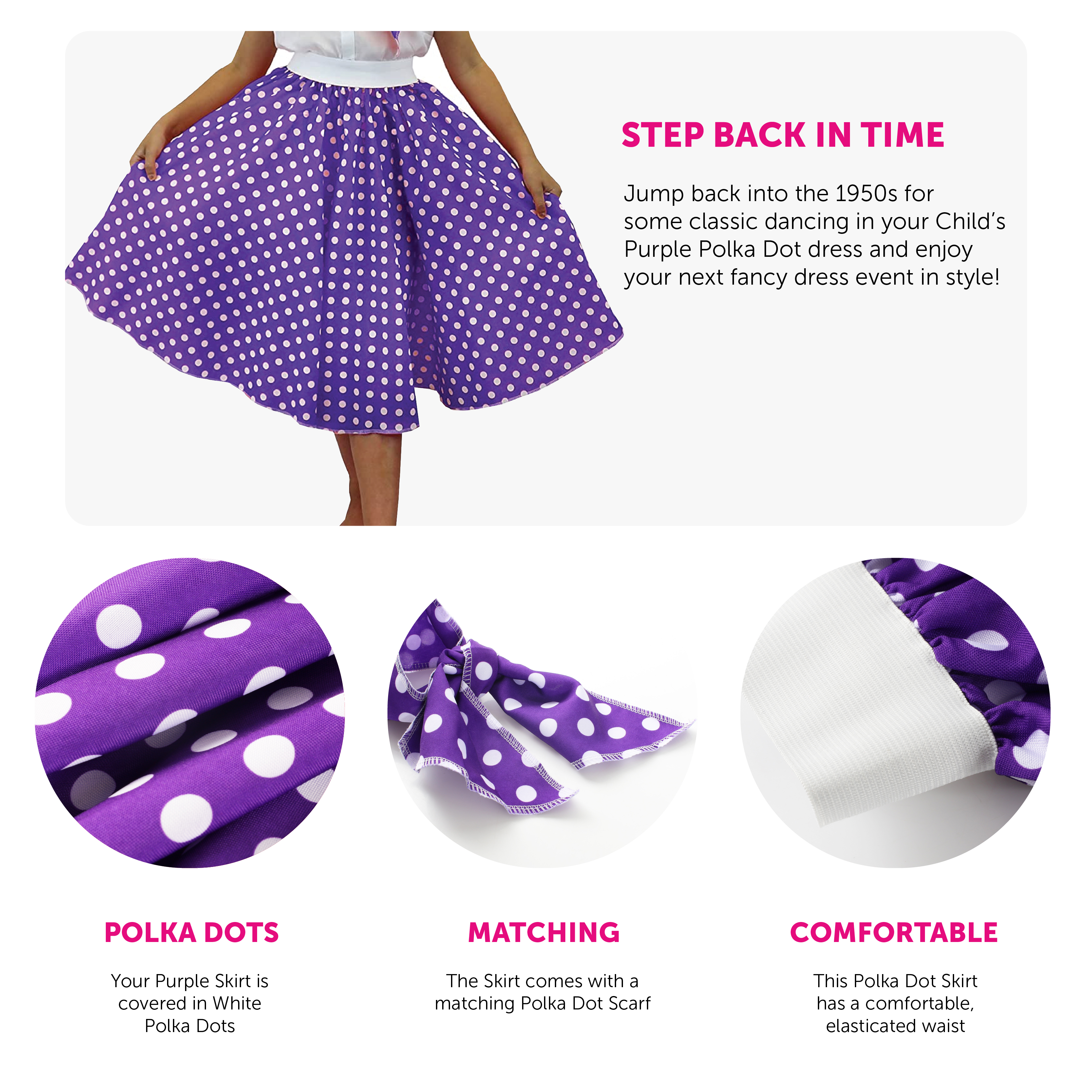 PERFECT FOR 1950'S & DANCE FANCY DRESS: Whether you’re dressing up for the times in the 1950's or in need of a dancing outfit for a stage production, then our Girls Purple Polka Dot Skirt is the perfect selection for you!