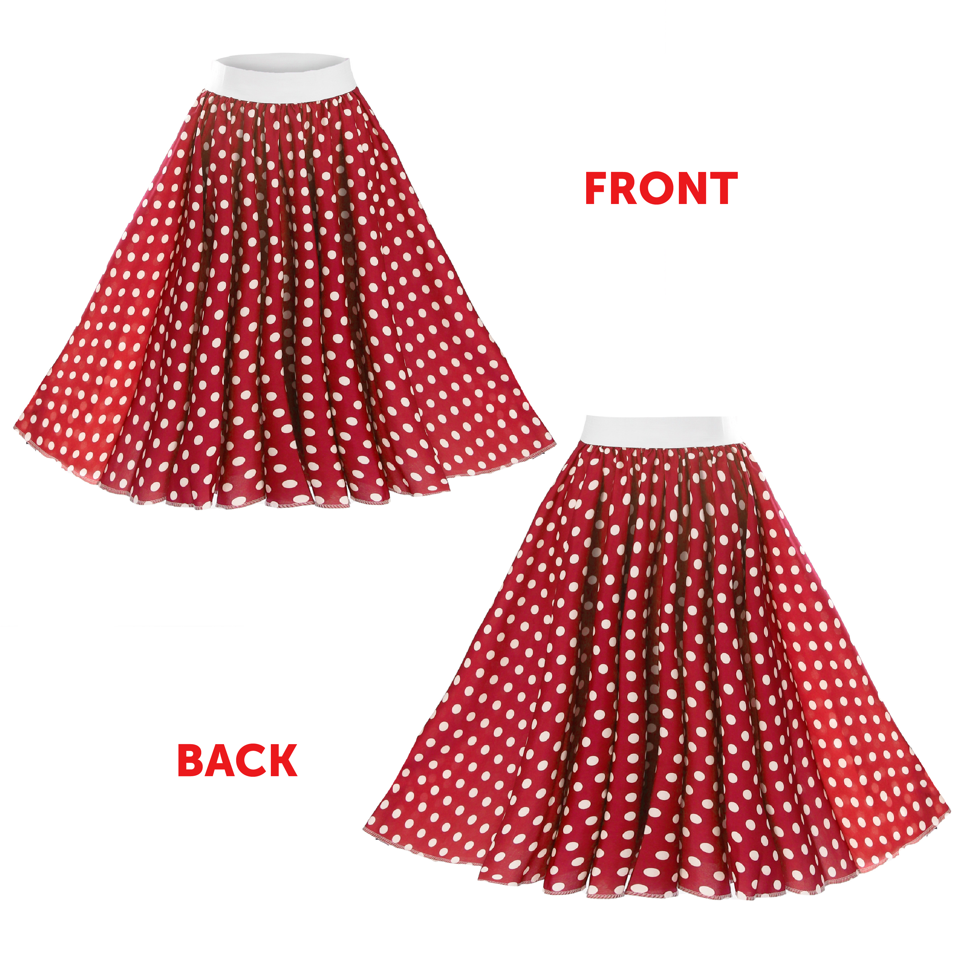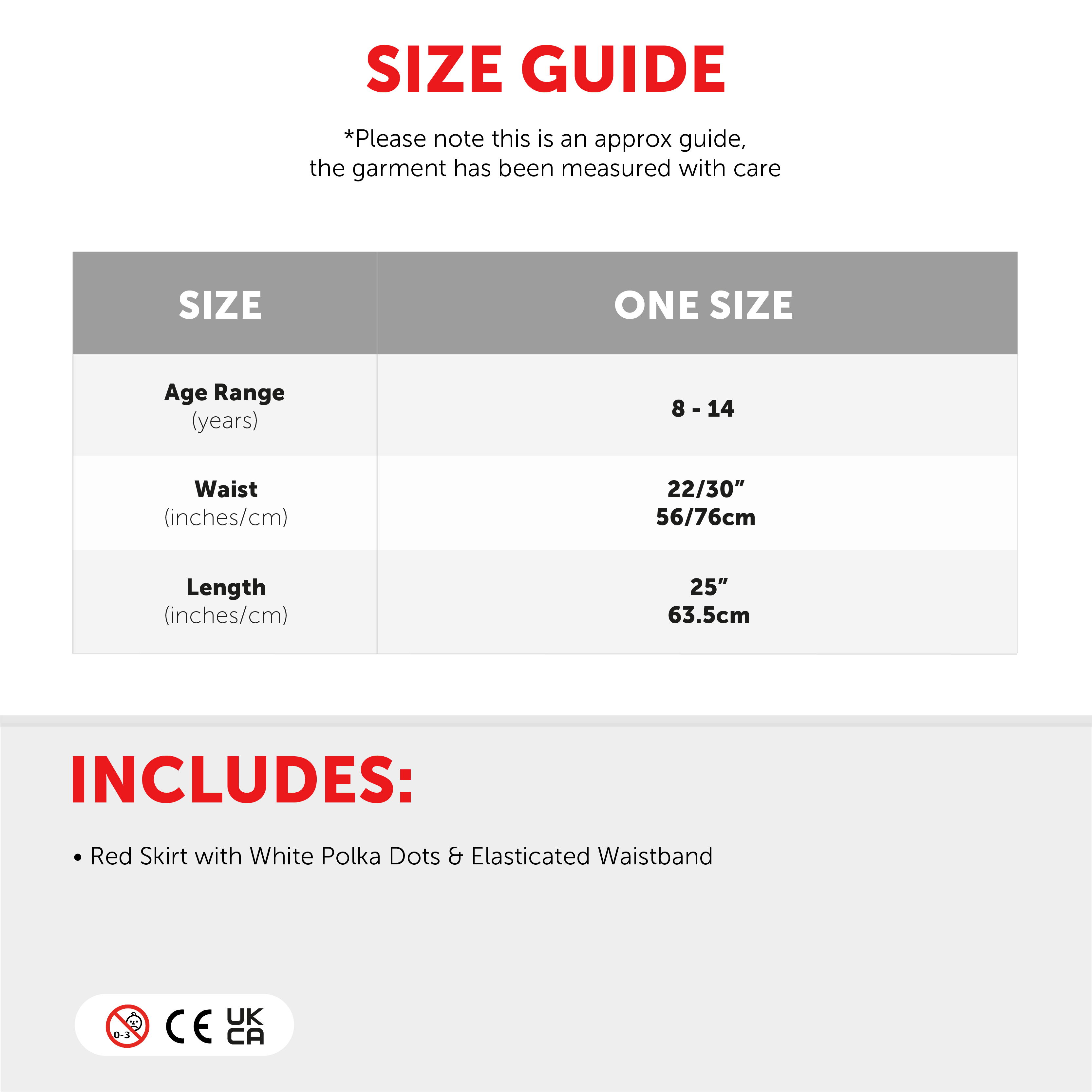 AVAILABLE IN ONE SIZE: Your Girls Red Polka Dot Skirt is available in one size only; Age Range 8 - 14 years, Waist 22/30" (56/76cm), Length 25" (63.5cm)
