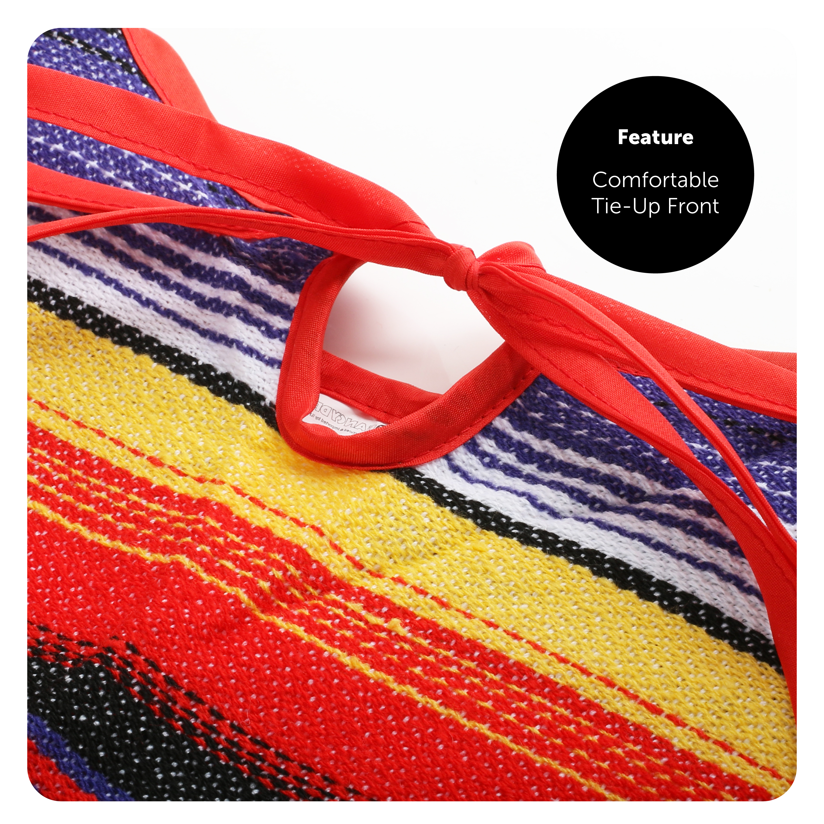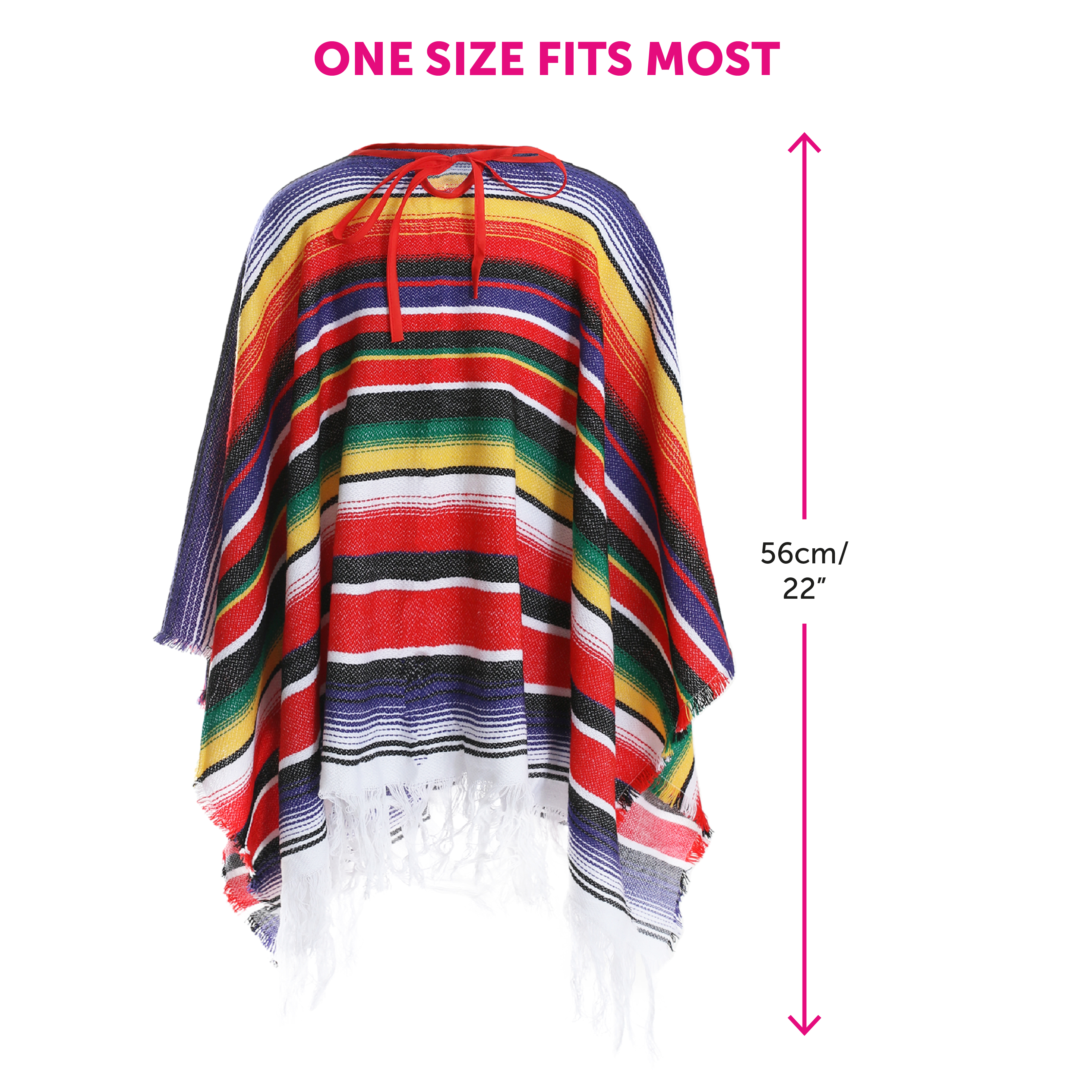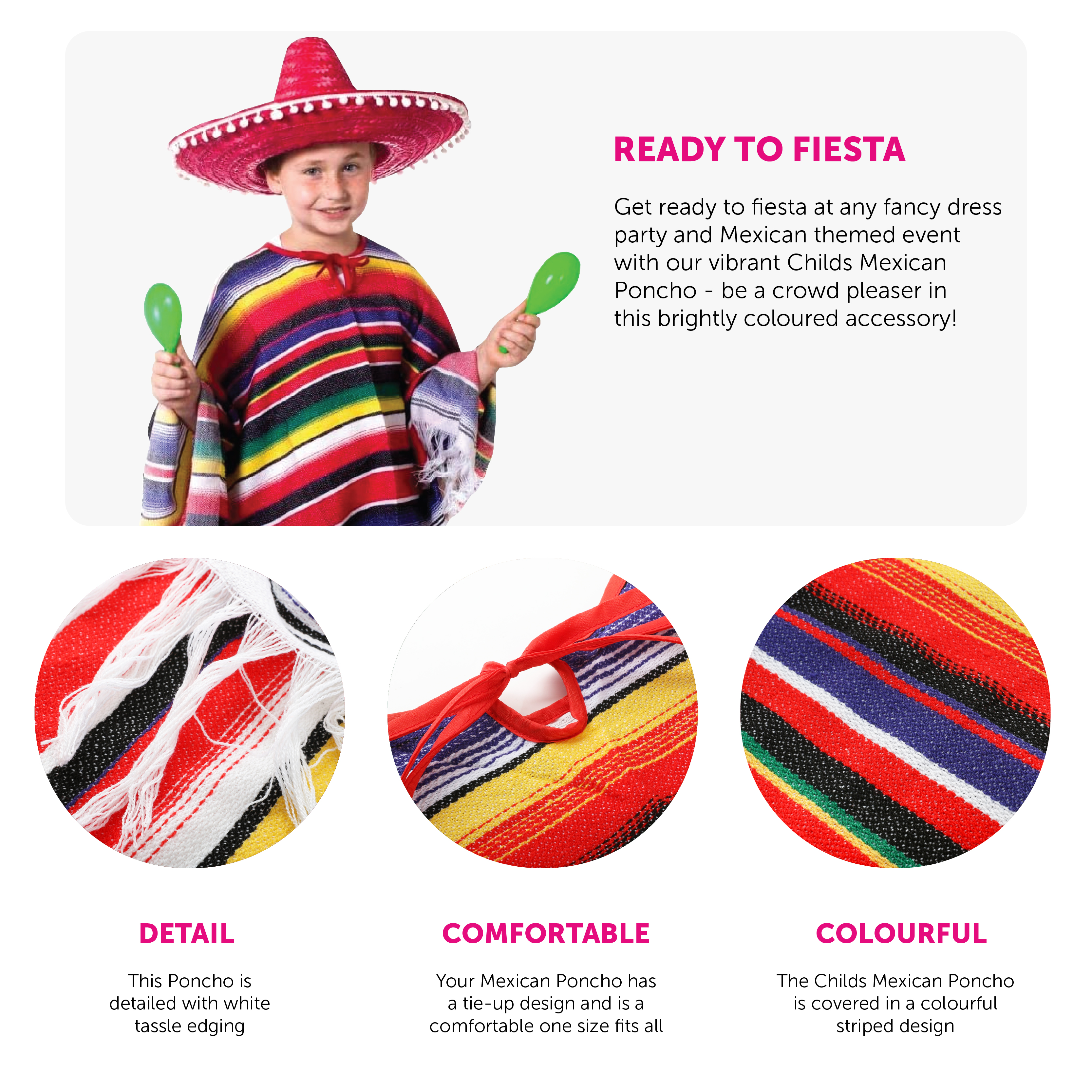 COMPLETE ANY MEXICAN OR COWBOY LOOK: Whether you have a Mexican Sombrero with Maracas or moustache ready, or a Cowboy Hat and costume prepped, complete your look with our Child’s Multi-Coloured Striped Poncho!