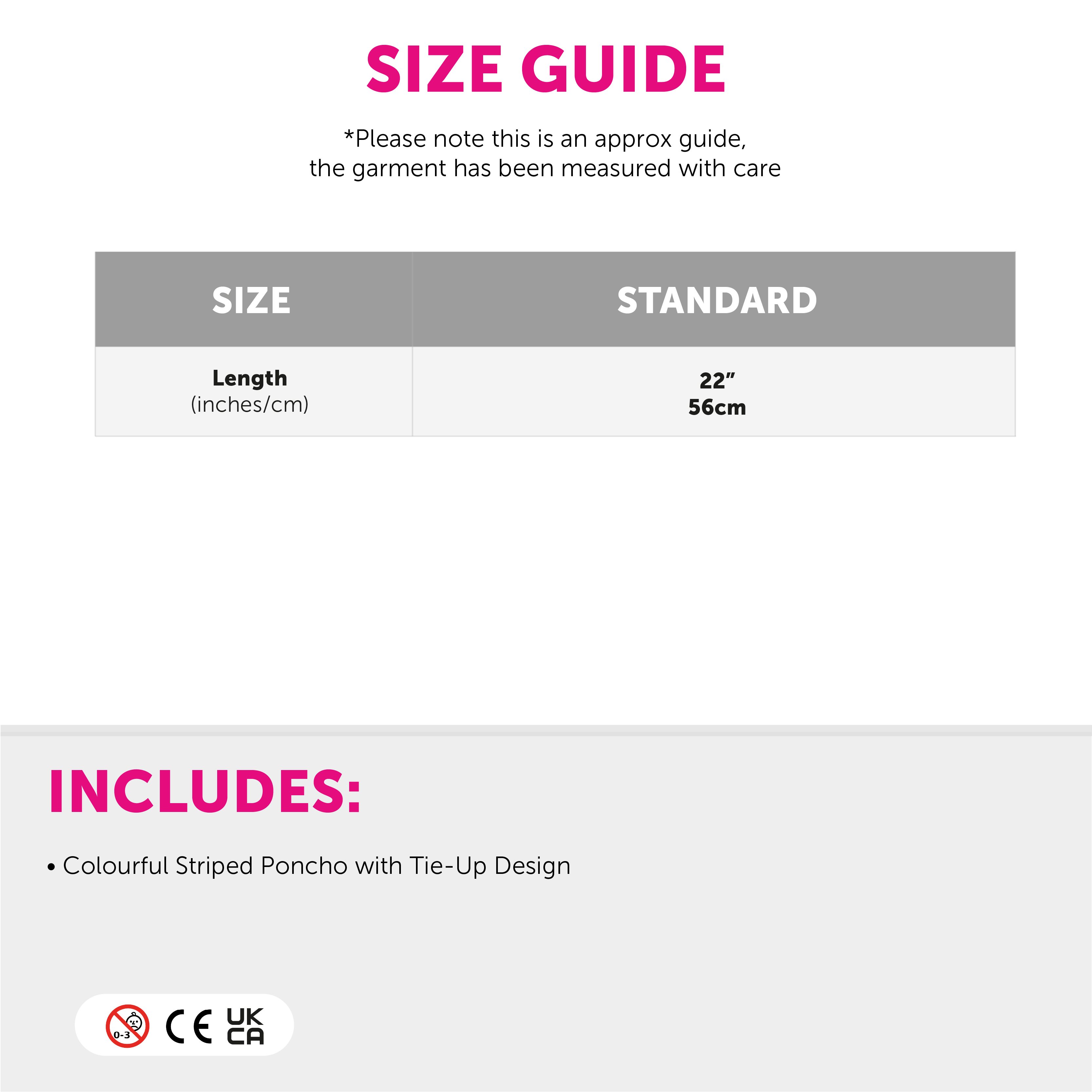 CHILD’S MULTI-COLOURED STRIPED PONCHO: Strike out with a classic, stylish, and iconic look with our Child’s Multi-Coloured Striped Poncho and make your next fancy dress outing a memorable event!