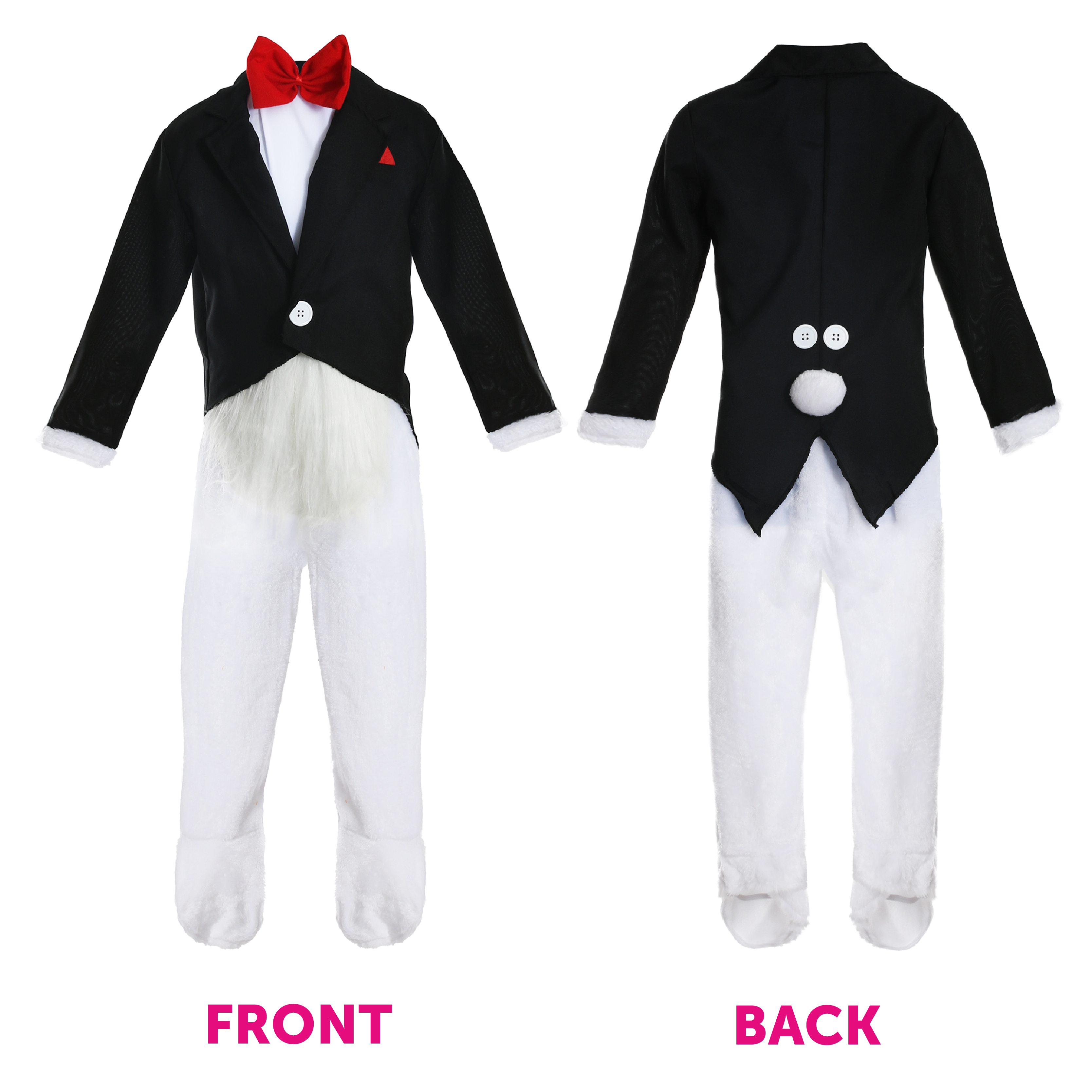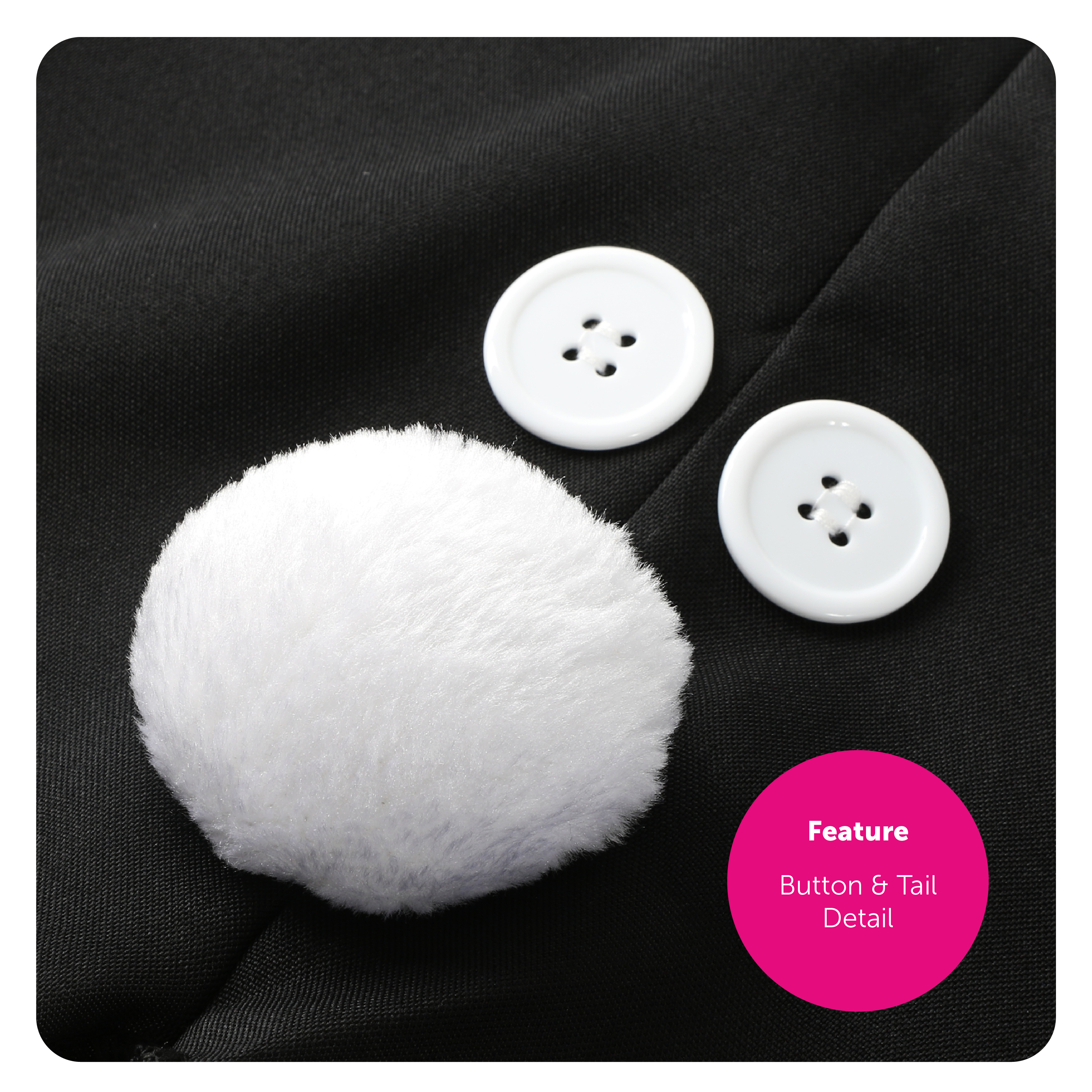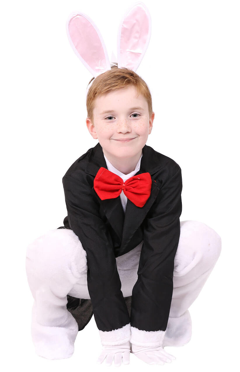 COSTUME INCLUDES: A Black Frock Coat with a White Rabbit Tail attached, White Plush Pinafore Trousers with Faux-Fur tummy, Attached Front shirt with Red Bowtie, Attached Shoe Covers, White Gloves, Rabbit Ears, and a Rabbit Nose!