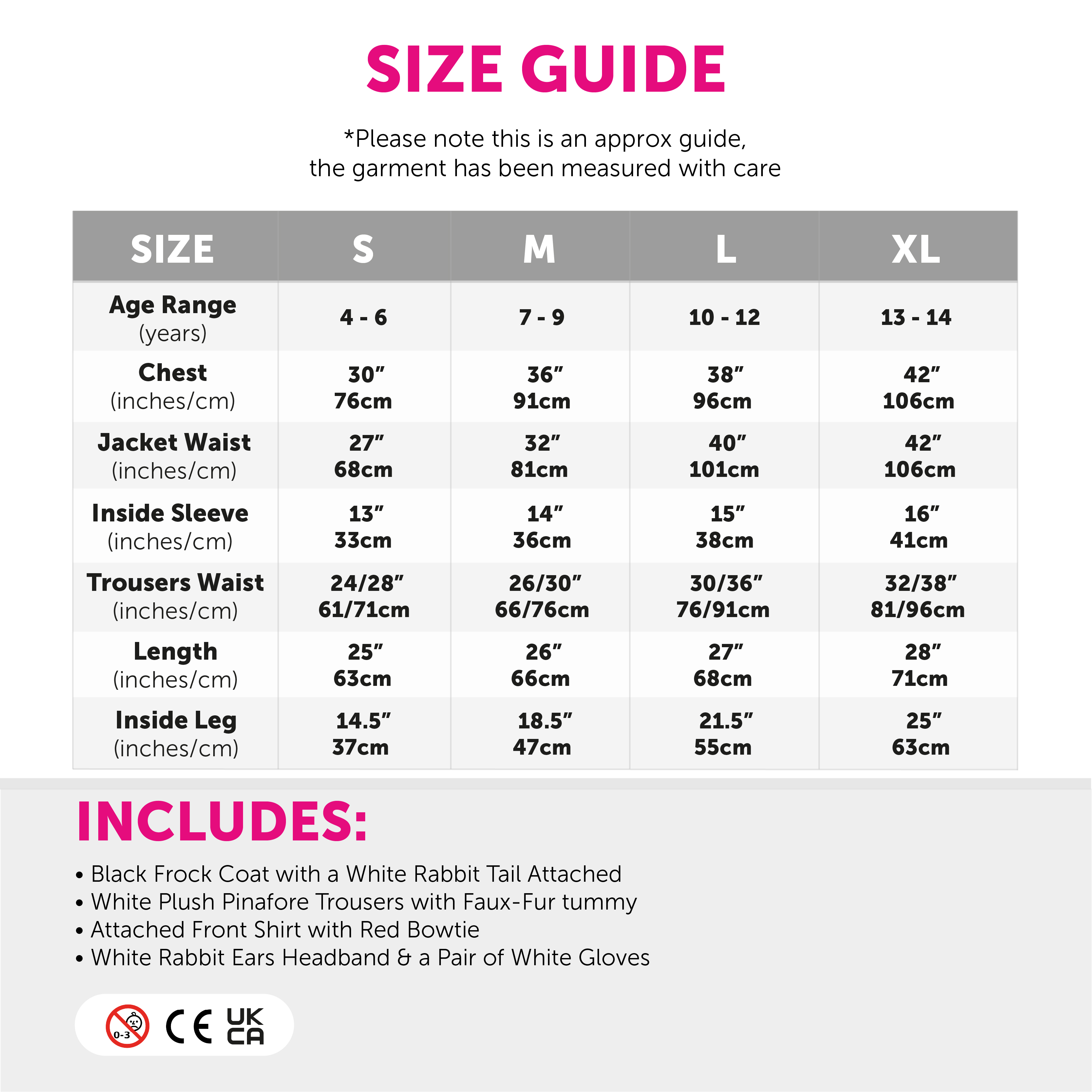 AVAILABLE IN MULTIPLE SIZES: Our Rabbit Costumes are available in multiple sizes from Small to X-Large: Small - 4-6 Years: Trousers: Inside Leg: 14.5”/37cm | Waist: 24-28”/61-71cm | Neck To Crotch: 25”/63cm | Jacket: Inside Sleeve: 13”/33cm | Chest: 30”/76cm | Waist: 27”/68cm | Medium - 7-9 Years: Trousers: Inside Leg: 18.5”/47cm | Waist: 26-30”/66-76cm | Neck To Crotch: 26”/66cm | Jacket: Inside Sleeve: 14”/36cm | Chest: 36”/91cm | Waist: 32”/81cm | Large | 10-12 Years: Trousers: Inside Leg: 21.5”/55cm | Waist: 30-36”/76-91cm | Neck To Crotch: 27”/68cm | Jacket: Inside Sleeve: 15”/38cm | Chest: 38”/96cm | Waist: 42”/106cm | X-Large | 13-14 Years: Trousers: Inside Leg: 25”/63cm | Waist: 32-38”/81-96cm | Neck To Crotch: 28”/71cm | Jacket: Inside Sleeve: 16”/41cm | Chest: 42”/106cm | Waist: 40”/101cm