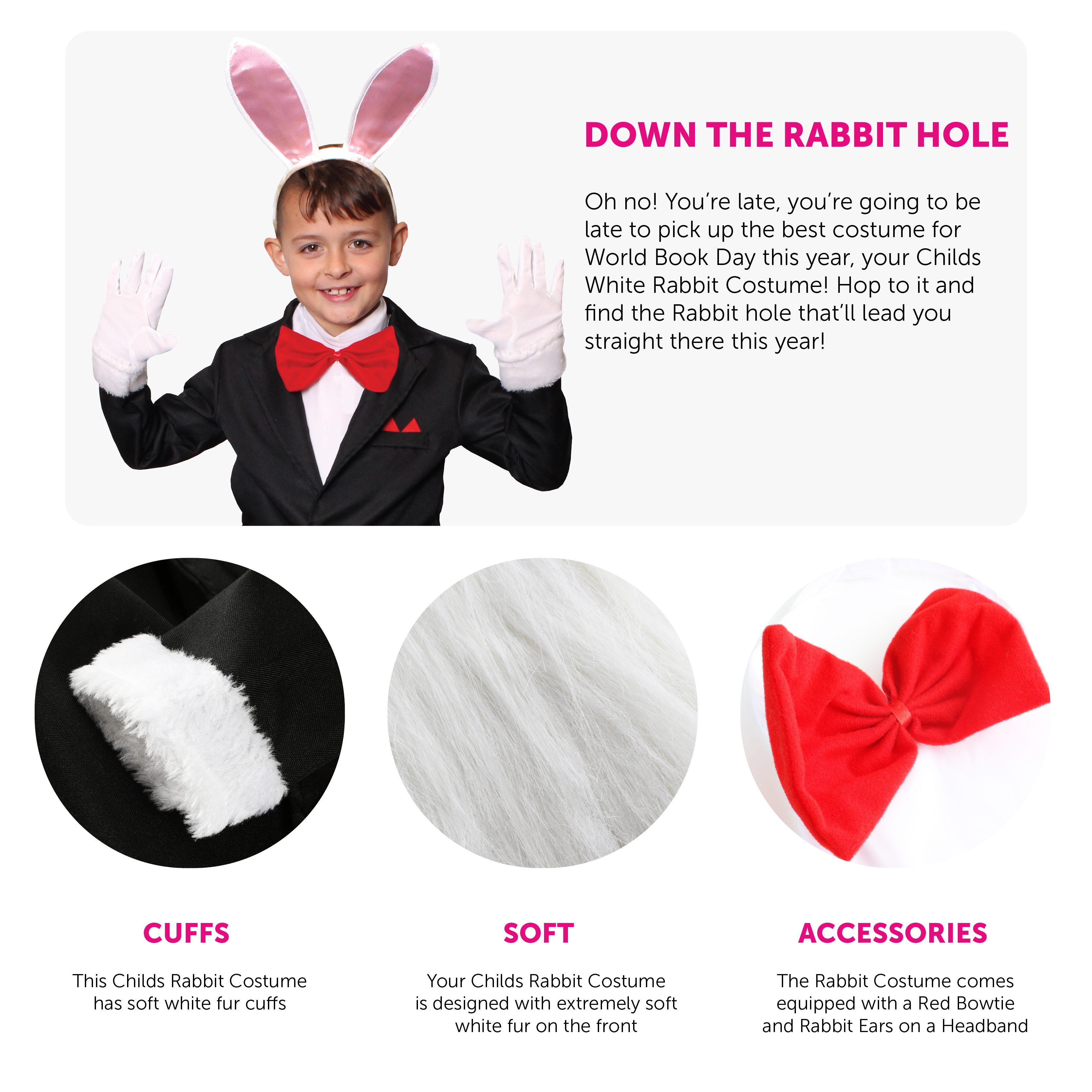 CHILD'S WHITE RABBIT COSTUME: Oh no! You’re late, you’re going to be late to pick up the best costume for World Book Day this year, your Childs White Rabbit Costume! Hop to it and find the Rabbit hole that’ll lead you straight there this year!
