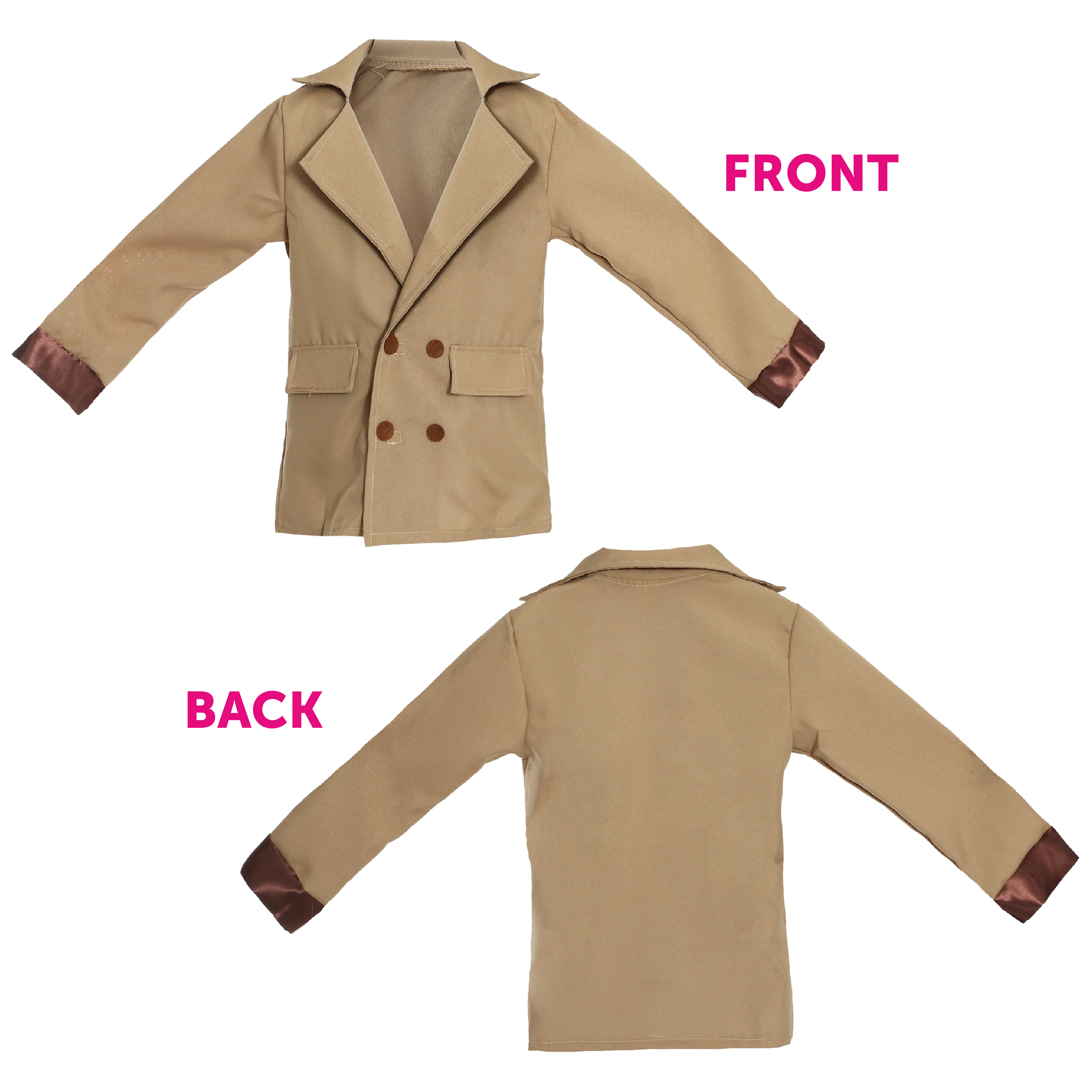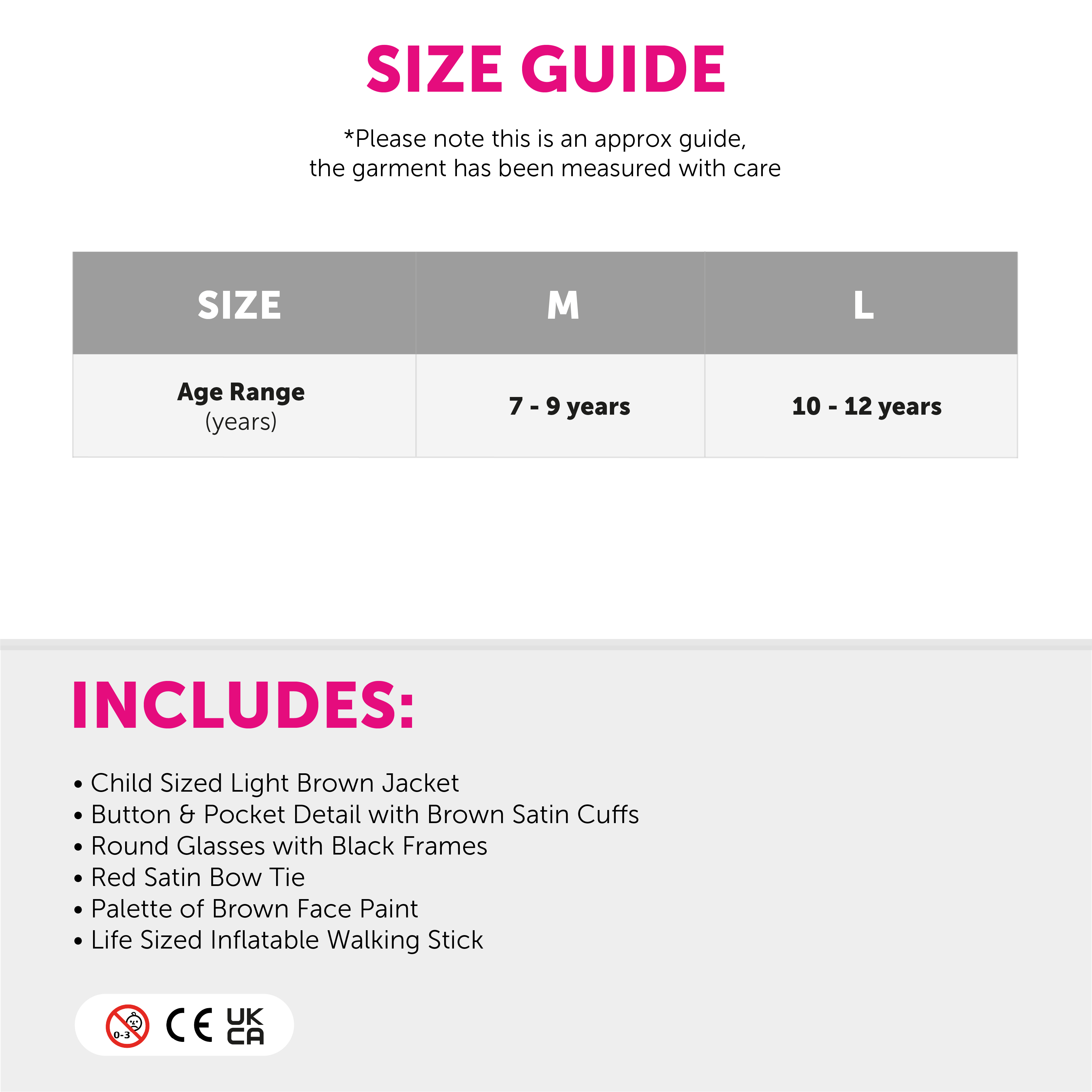 CHILD'S MR SMELLY COSTUME DETAILS: Your Child's Mr Smelly Costume includes a Light Brown Jacket detailed with dark Brown Satin Sleeve Cuffs, a Red Satin Bow Tie, a pair of Black Framed Round Glasses, a palette of Brown Face Paint and a life sized Inflatable Walking Stick, to finish off your look!