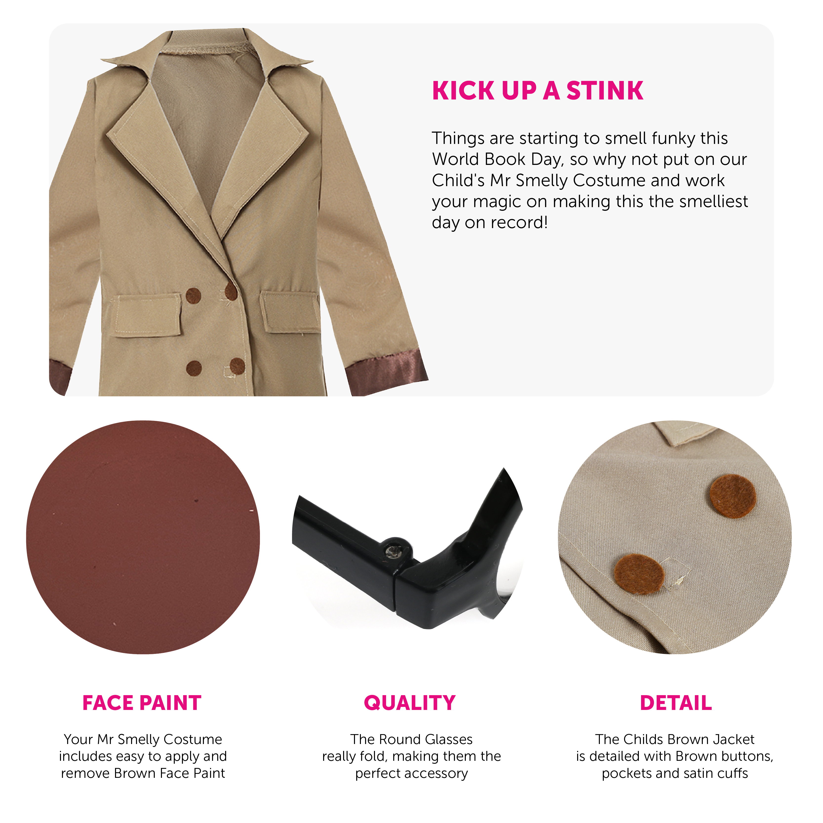 GREAT QUALITY COSTUME SET: The Child's Mr Smelly Outfit is a great quality Costume Set, with the Brown Jacket detailed with buttons, the Brown Face Paint being easy to apply and remove and the Inflatable Walking Stick measuring 34"/86cm in height, making it the perfect prop!