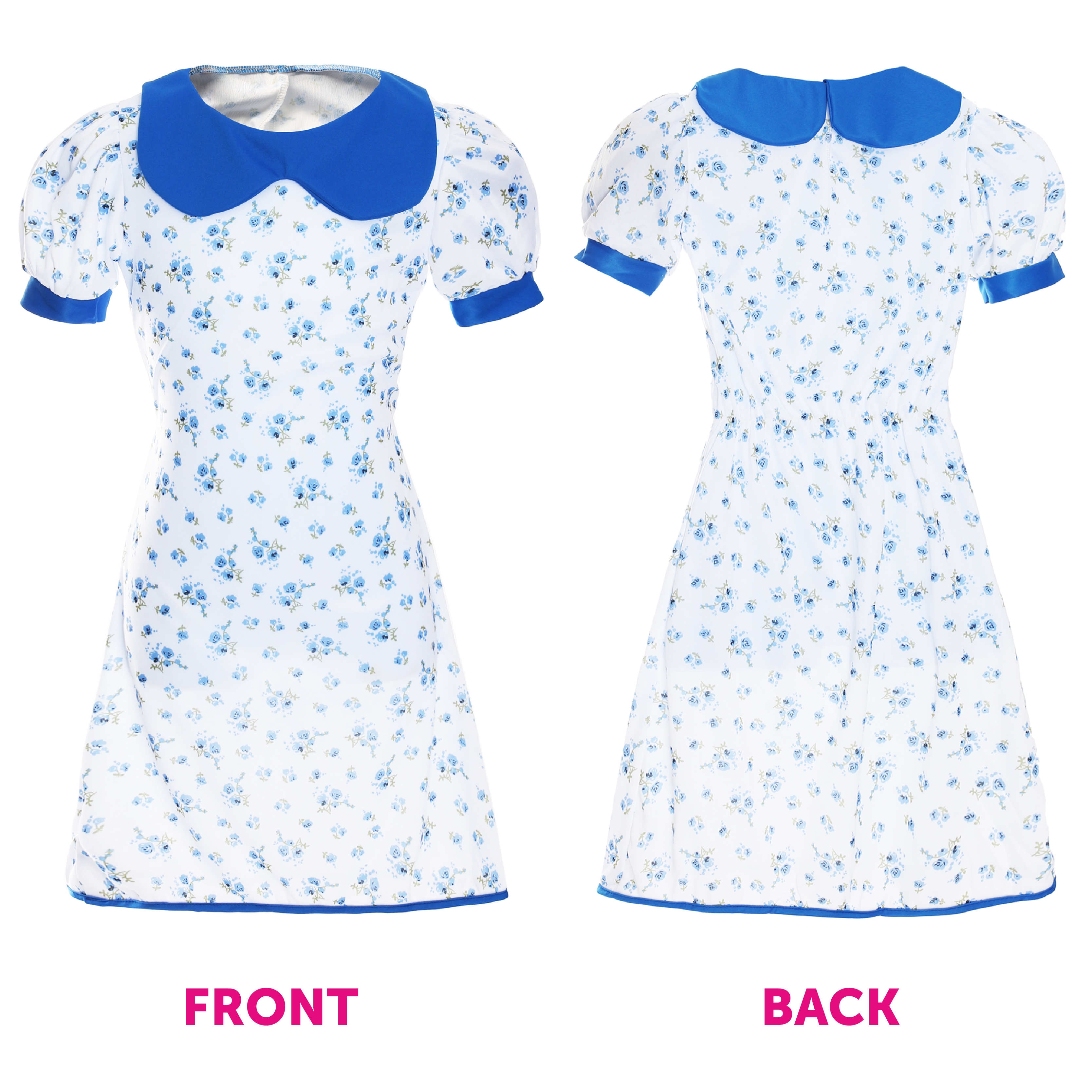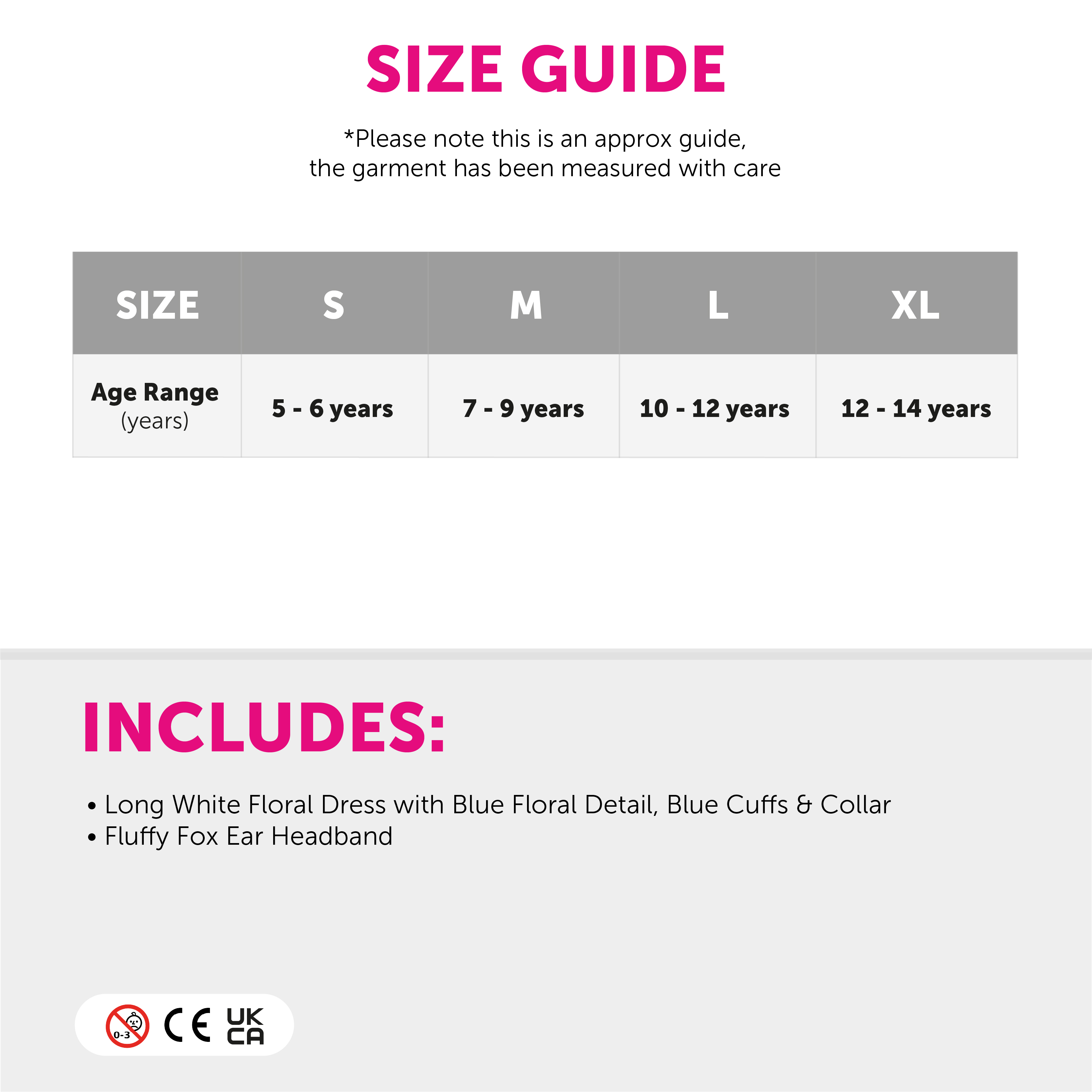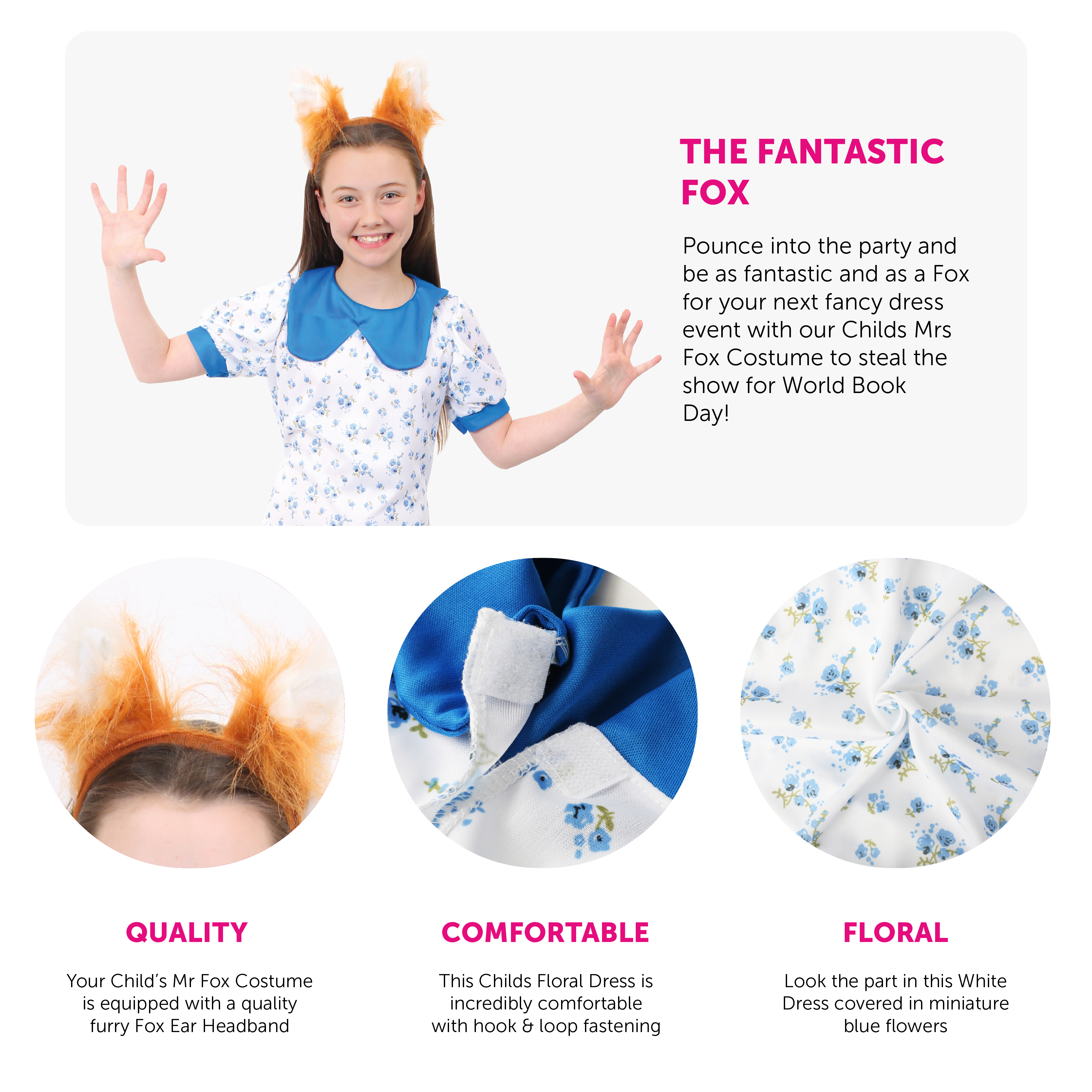 MRS FOX COSTUME DETAILS: Your Child’s Mrs Fox Costume includes a long White Floral  Dress with Blue Flowers detail, a blue collar, blue-edged sleeves and a fluffy Fox Ear Headband!