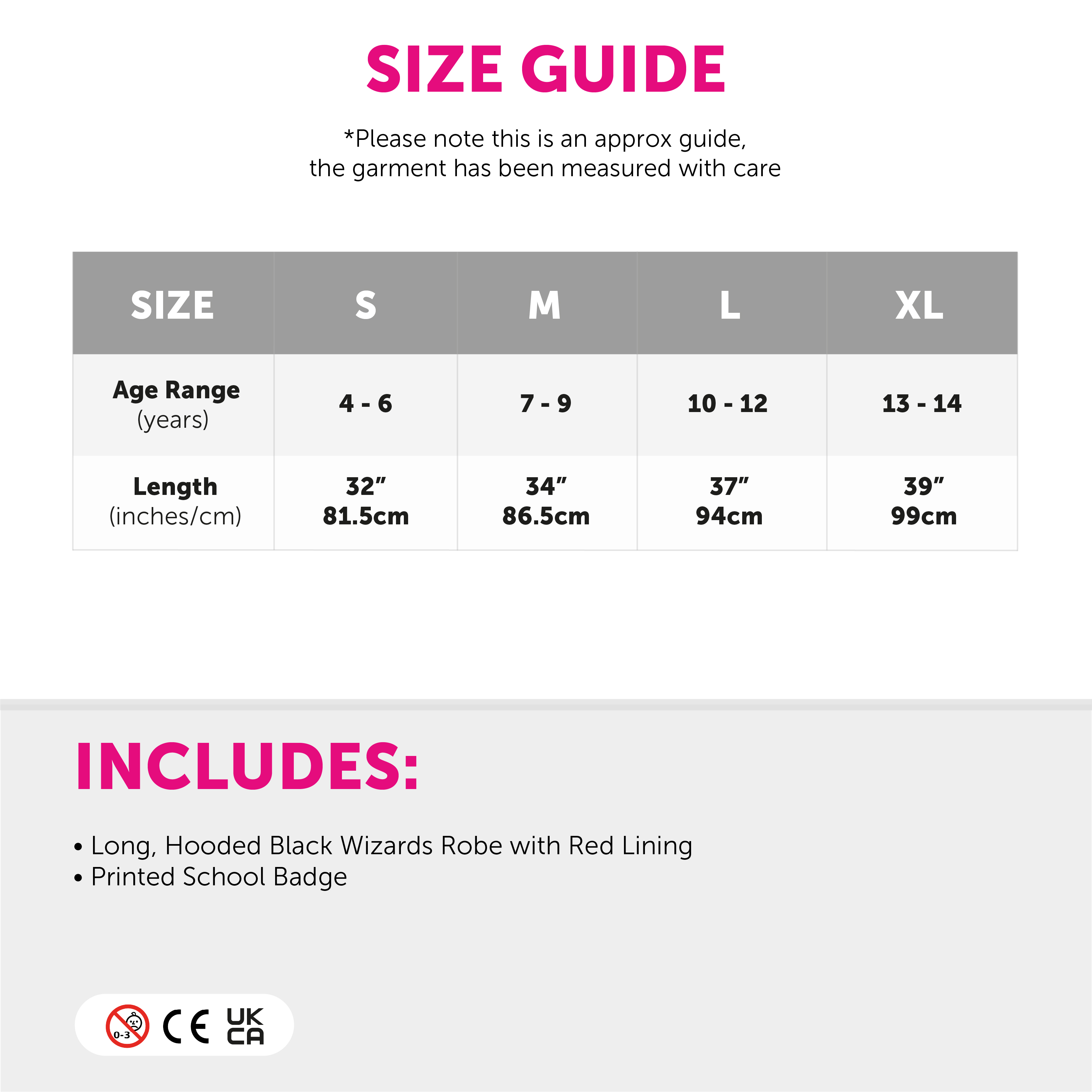 AVAILABLE IN MULTIPLE SIZES: Your Child’s Wizard Robe is available in multiple sizes from Small to X-Large: Small: Age: 4/6 Years - Length: 32"/81.5cm | Medium: Age: 7/9 Years - Length: 34"/86.5cm | Large: Age: 10/12 Years - Length: 37"/94cm | X Large: Age: 13/14 Years - Length: 39"/99cm