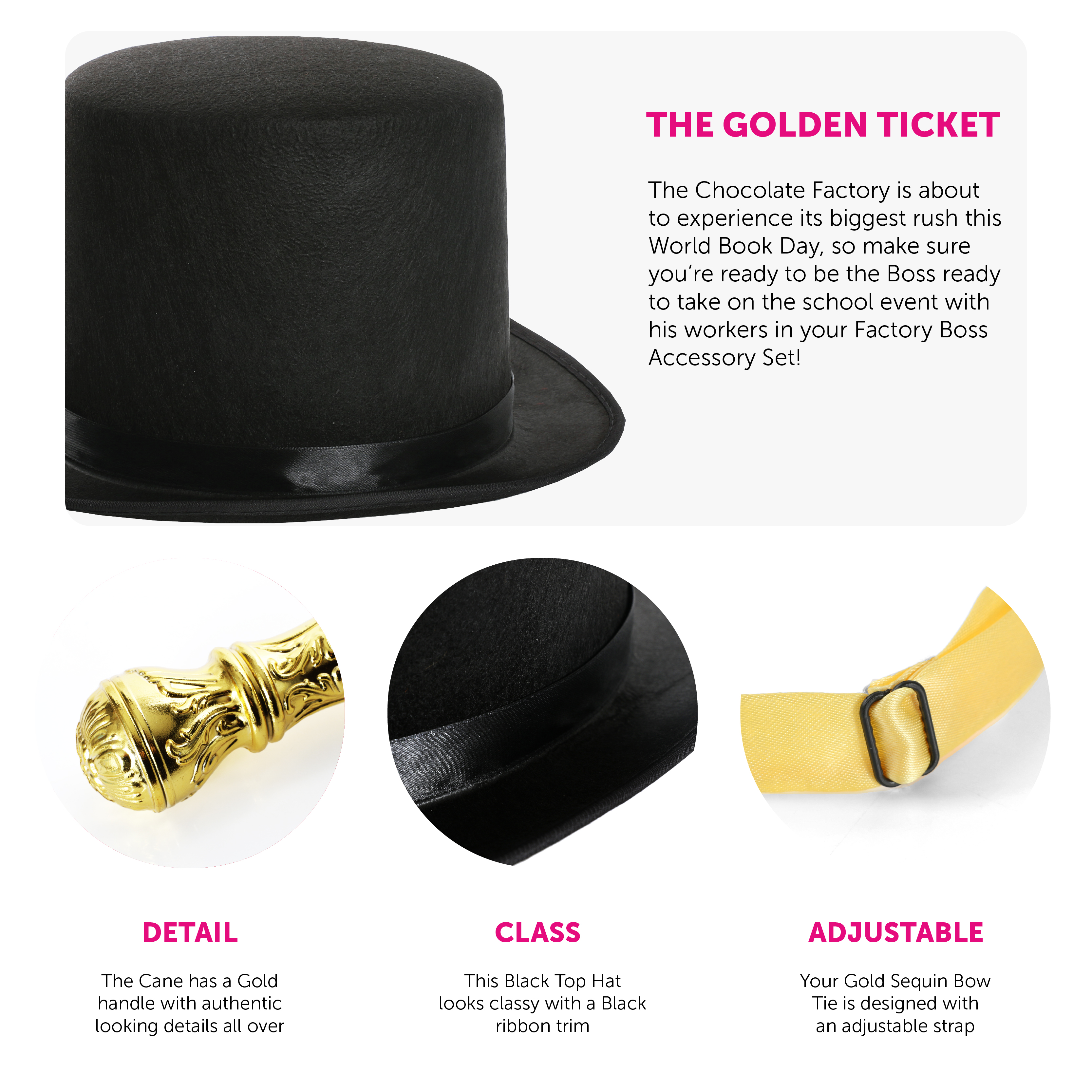 FACTORY BOSS SET INCLUDES: Your Factory Boss Set includes a Black Top Hat with a Black ribbon band, a 3 Piece Cane with a detailed Gold Handle and a Gold Sequin Bow Tie, to finish off your outfit!