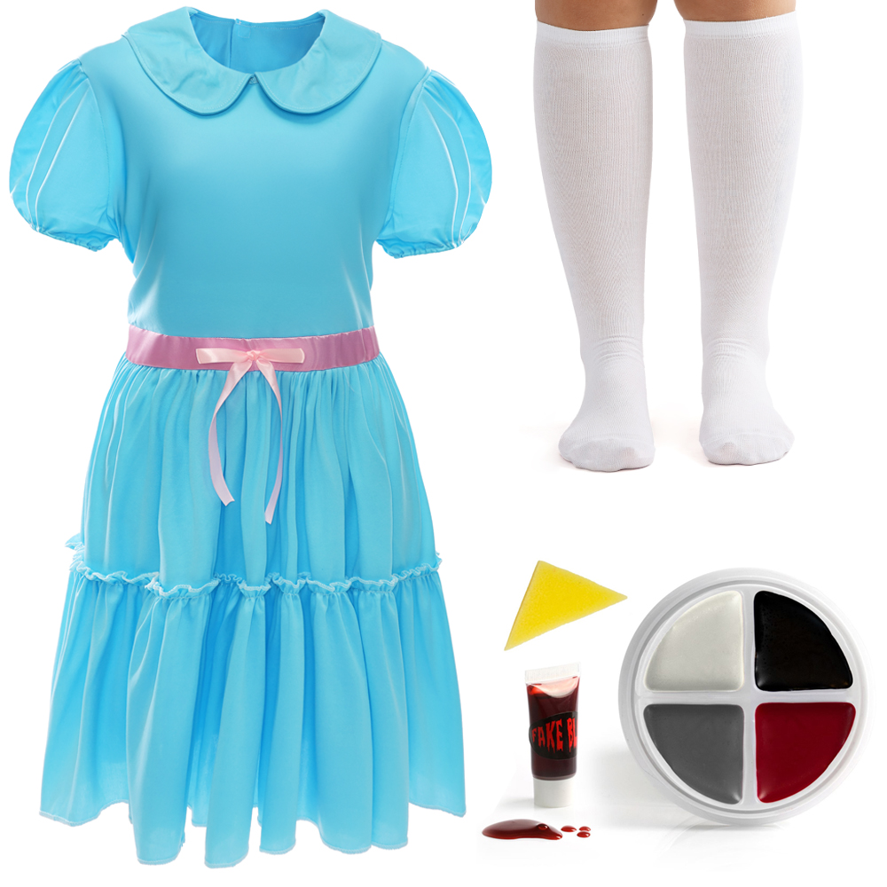Bring a beloved storybook character to life with our Girls Shining Sister Dress — a charming blue dress designed with puffed sleeves, a neat collar, and a sweet pink ribbon waist tie for the perfect finishing touch. To complete the look, this outfit also includes white long socks and a Red, Grey, Black & White Funki Face & Body Paint Kit with Fake Blood, giving you everything needed for a spooky or storybook-perfect transformation. Ideal for World Book Day, school plays, themed parties, Halloween, or imaginative dress-up at home.