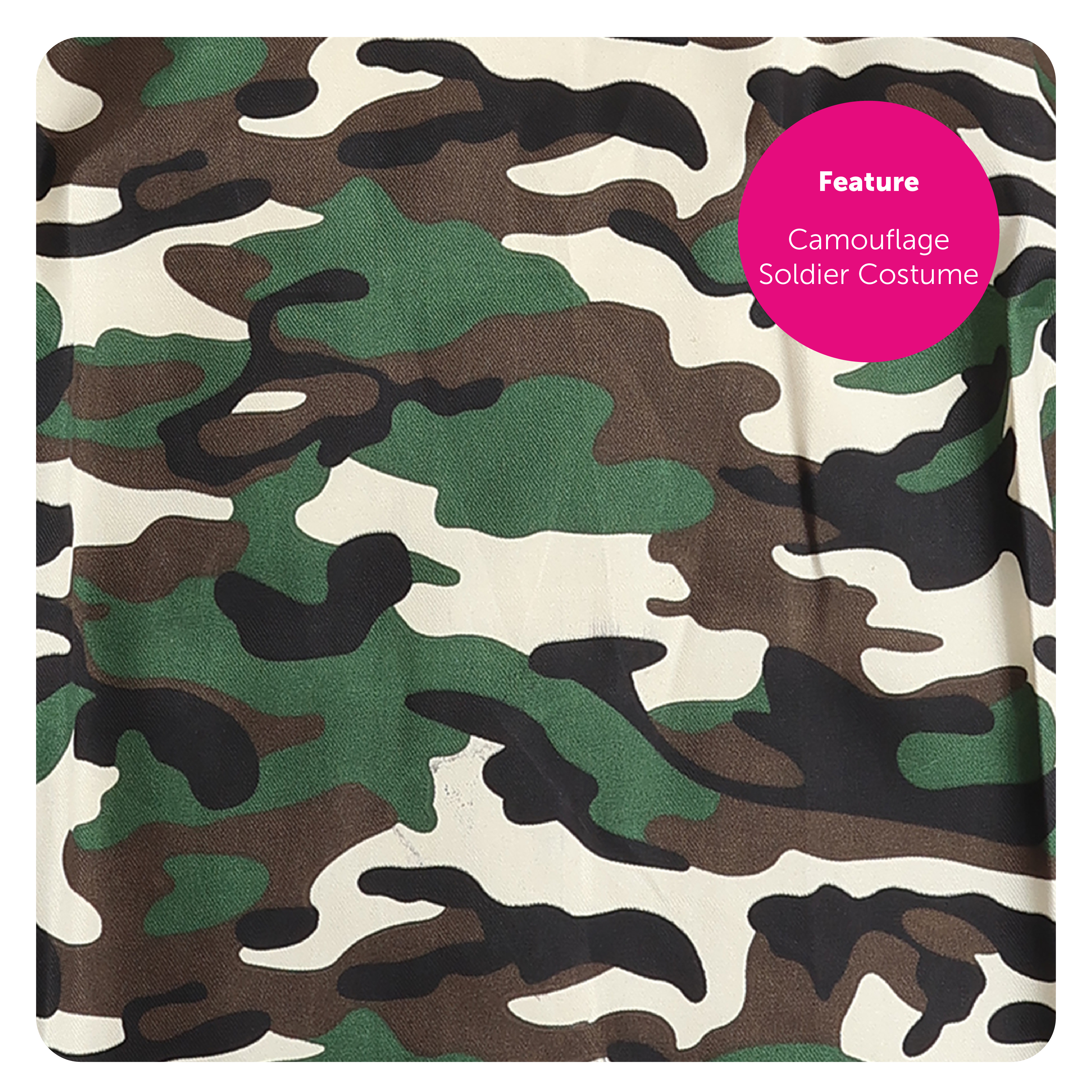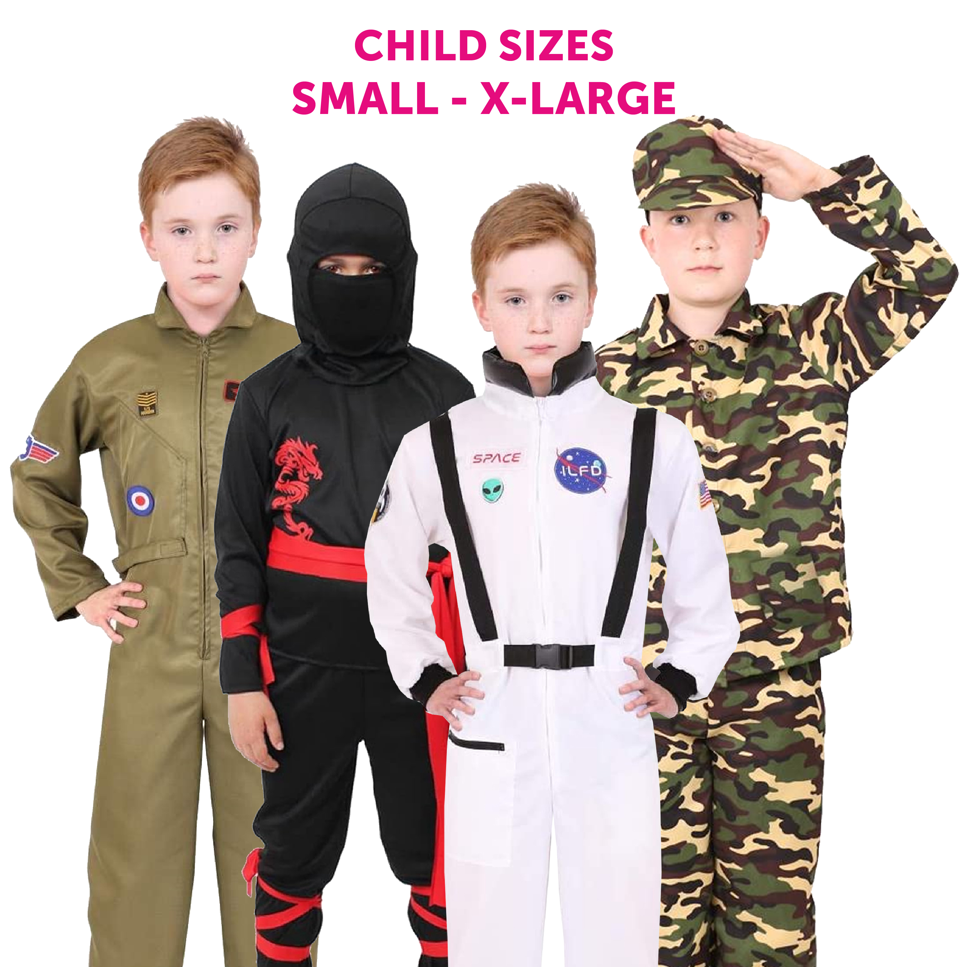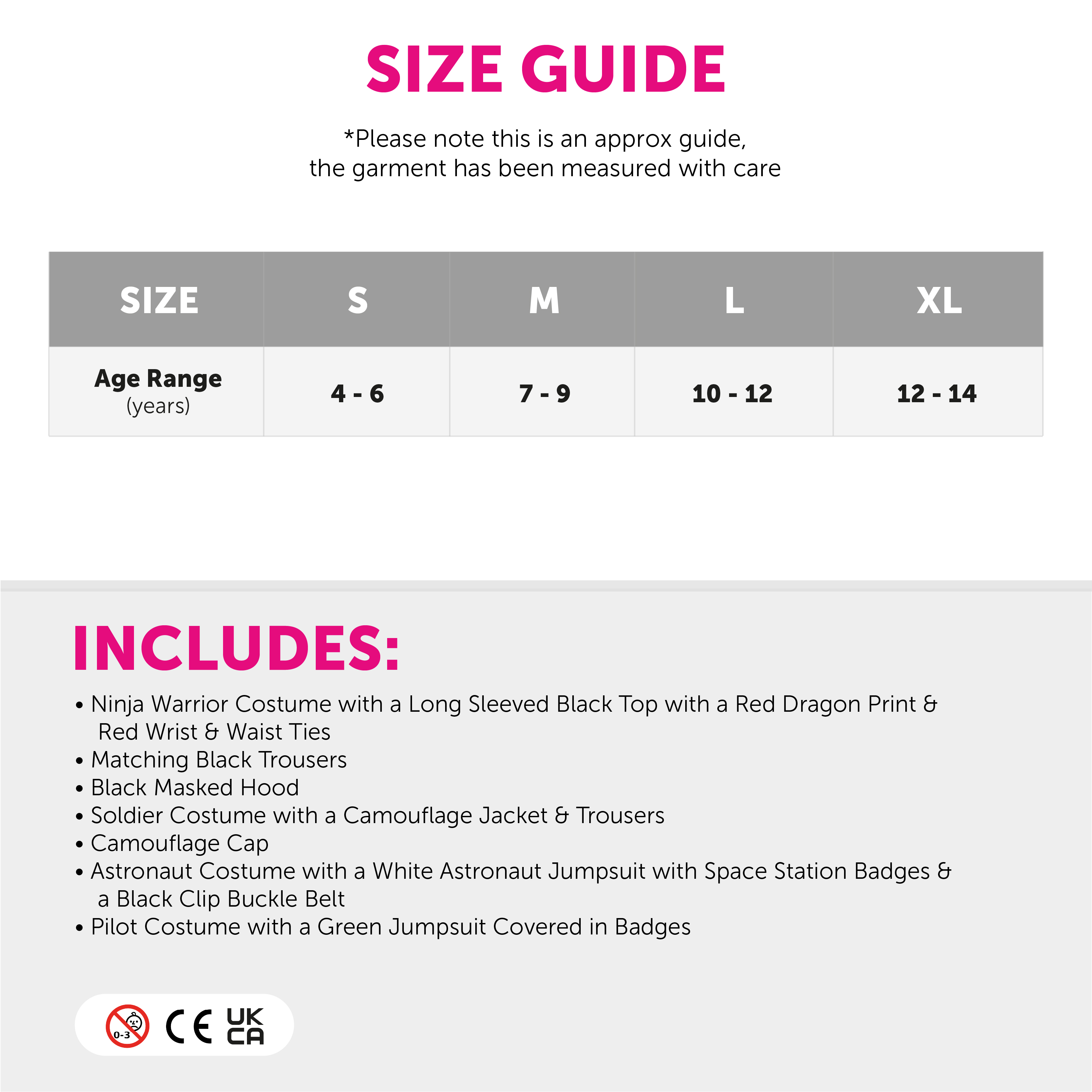 SET INCLUDES: This Dress Up Set includes 1x Ninja Warrior Costume with a Long Sleeved Black Top with a Red Dragon Print and Red Wrist and Waist Ties, matching Black Trousers and a Black Masked Hood, 1x Soldier Costume with a Camouflage Jacket, Trousers and Hat, 1x Astronaut Costume with a White Astronaut Jumpsuit, with space station badges sewn in, and a black clip buckle to tighten and secure the costume at the waist, and 1x Pilot Costume with a Green Jumpsuit covered in Badges!