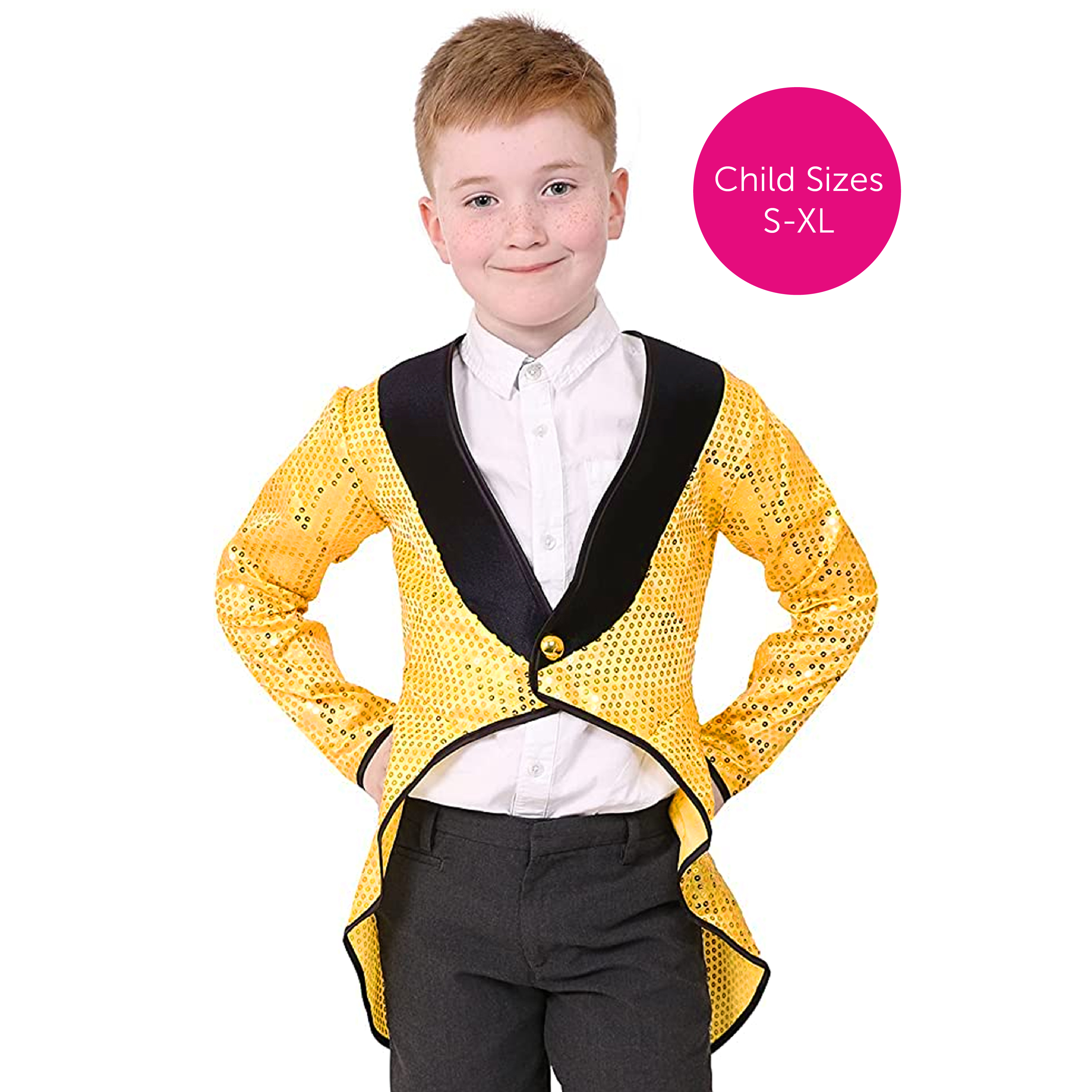 AVAILABLE IN MULTIPLE SIZES: Your Child's Gold Sequin Tailcoat is available in multiple sizes from Small to X-Large: Small - (5 - 6 Years) - Chest: 24/26" (61/66cm) | Medium - (7 - 9 Years) - Chest: 26/28" (66/71cm) | Large - (10 - 12 Years) - Chest: 28/30" (71/76cm) | X-Large - (12 - 14 Years) - Chest: 30/32" (76/81cm)
