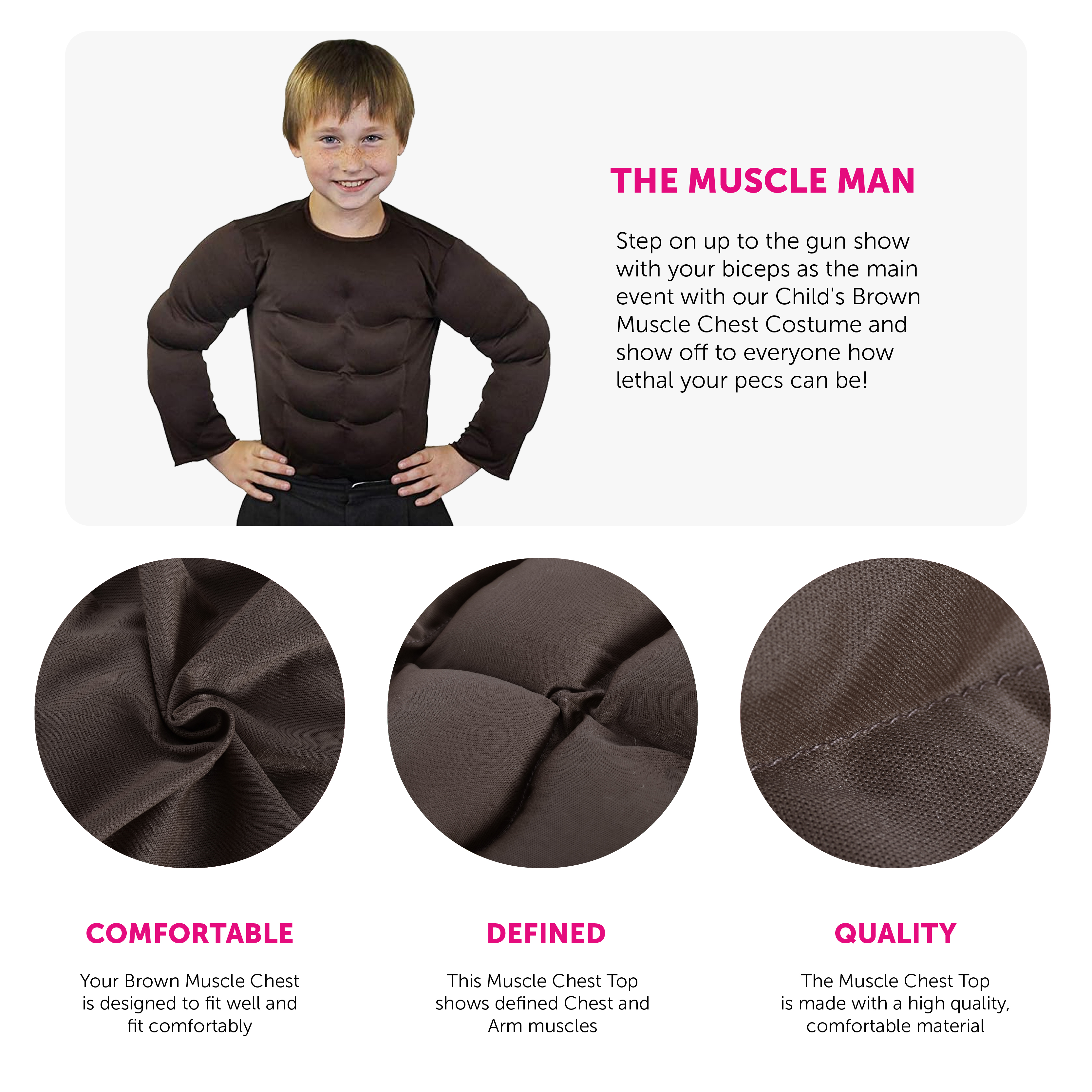PERFECT FOR TV, FILM, AND NOVELTY EVENTS: Whether you’re playing the role of your own loveable action hero, or for a novelty costume to dress up as, you’ll be the main event regardless, with our Child's Brown Muscle Chest Costume!
