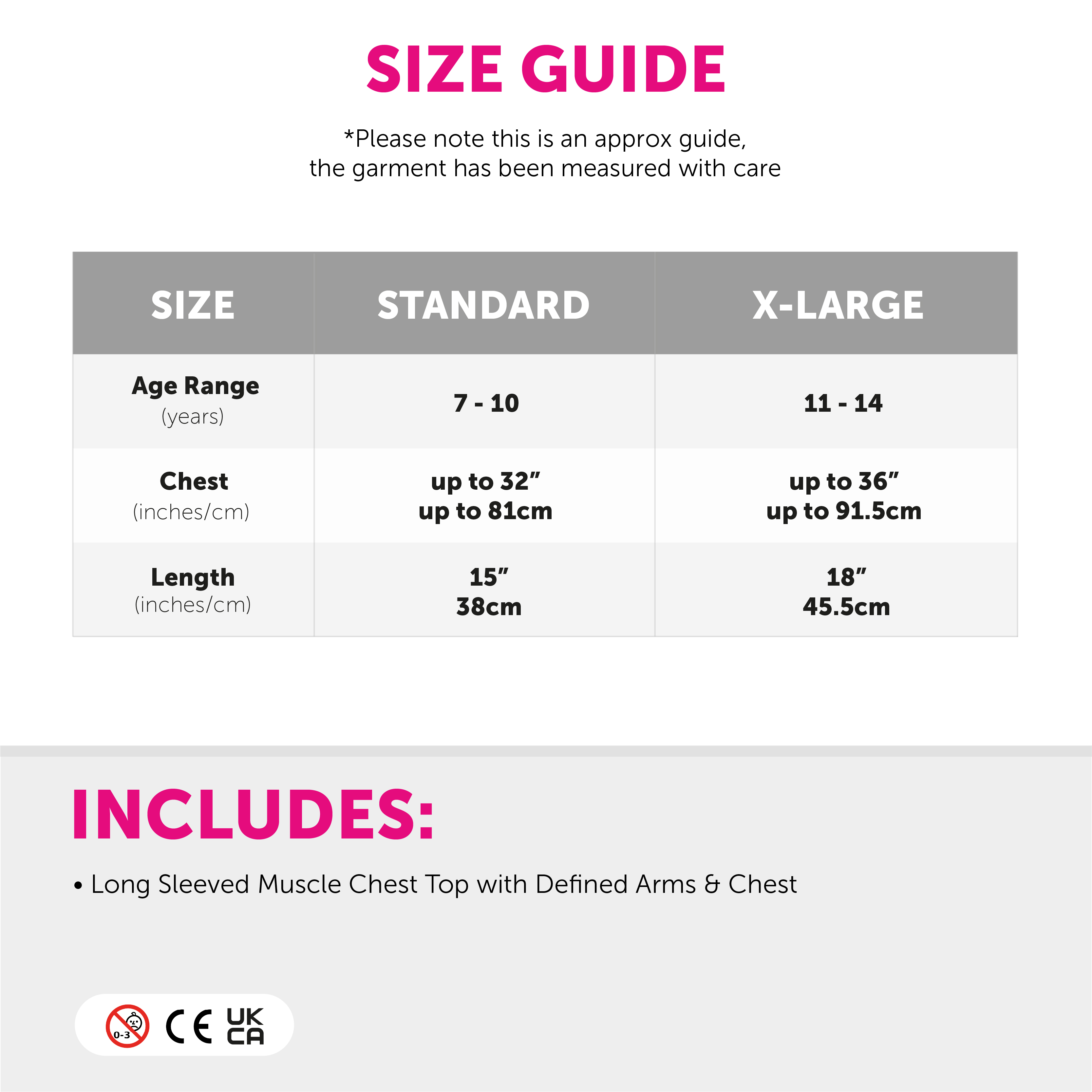 AVAILABLE IN TWO SIZES: Your Brown Muscle Chest Costumes will be available in two sizes, Standard and X-Large: Standard - (7 - 10 years), Chest Up to 32" (81cm), Length 15" (38cm) | X-Large - (11 - 14 years), Chest Up to 36" (91.5cm), Length 18" (45.5cm)