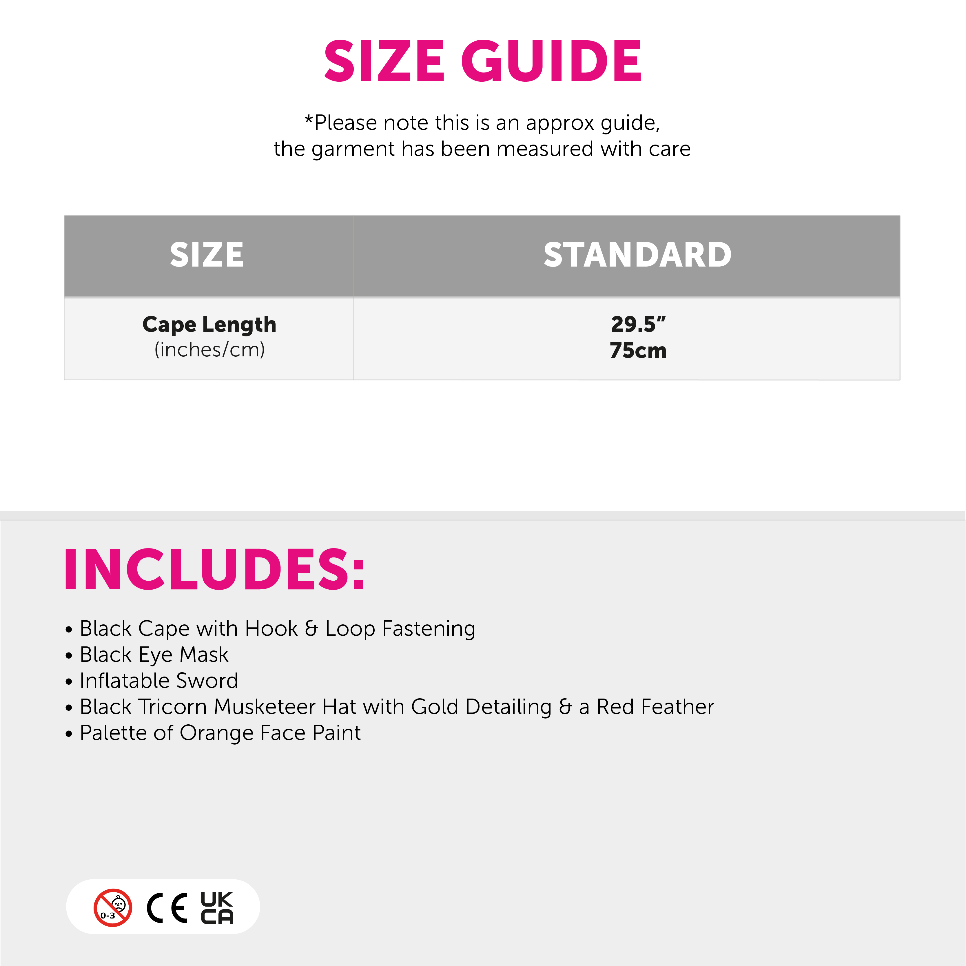 PERFECT SIZES: Your Child's Deluxe Cat Bandit Costume Set is designed to be a comfortable one size, making it easy to wear at any fancy dress event! The Child's Black Cape is 75cm (29.5") in length and the Child's Tricorn Hat is a head size of up to 55cm (21.5")