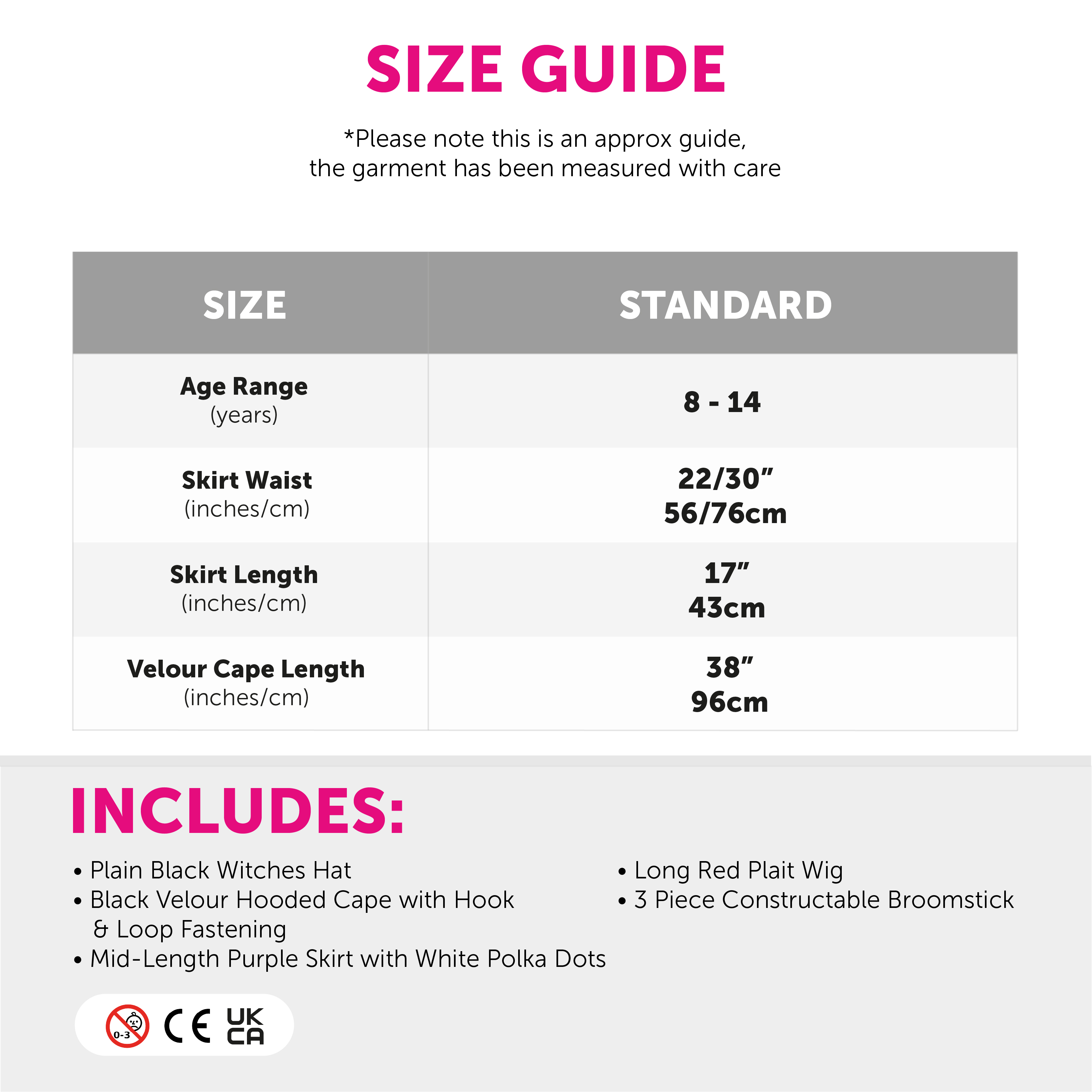 COSTUME INCLUDES: This Childs Kind Witch Costume includes a Black Witches Hat, a Red Plait Wig, a soft Black Velour Hooded Cape with hook and loop fastening, a Purple and White Polka Dot Skirt, and a 3 piece constructable Broomstick, the perfect look for World Book Day!