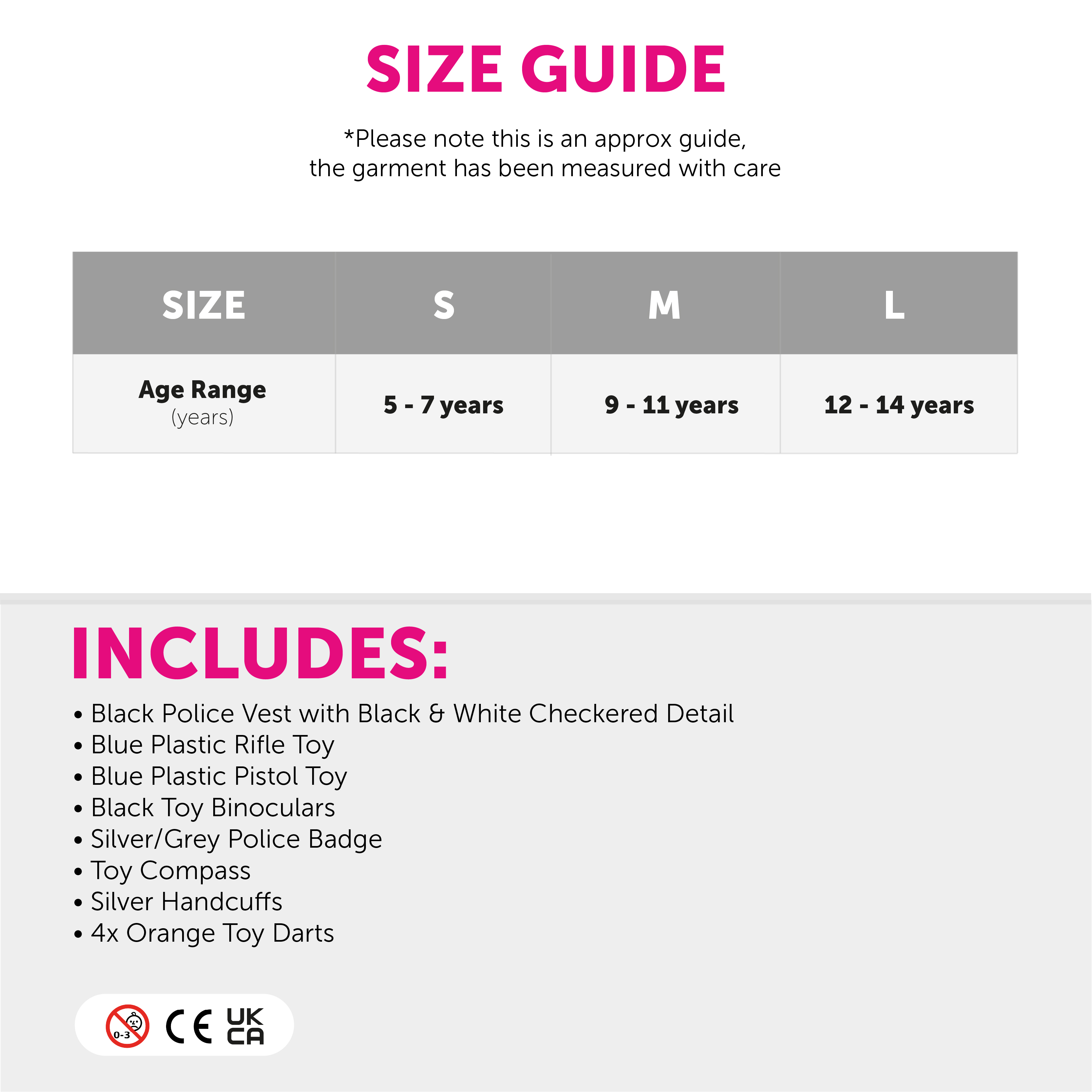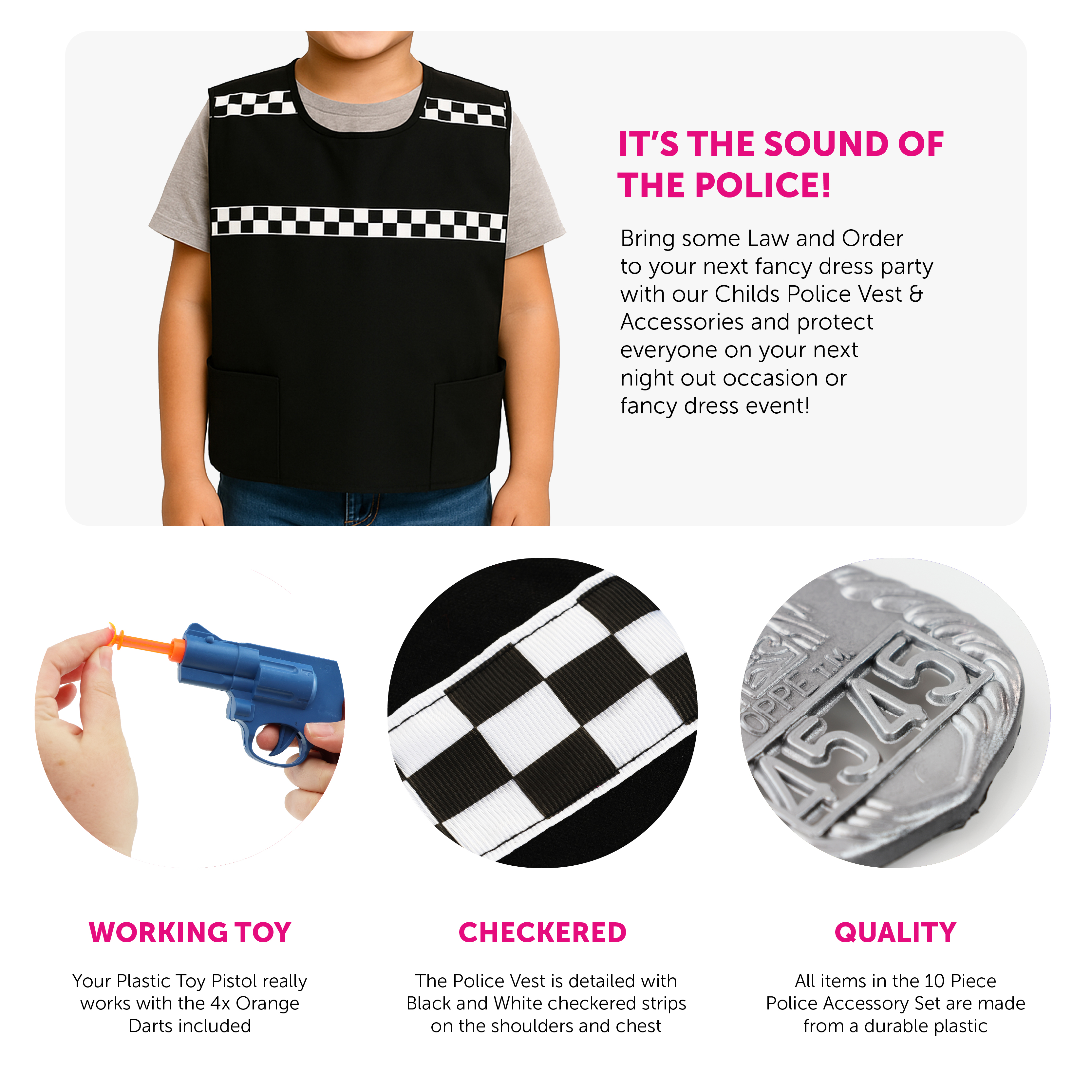 SET INCLUDES: This Childs Police Costume Set includes a Black Police Vest with Checkered Black and White details across the chest and shoulders, and a 10 Piece Police Set with 1x Blue Plastic Rifle, 1x Blue Plastic Pistol, 1x Black Binoculars, 1x Silver Police Badge, 1x Compass, 1x set of Silver Handcuffs, and 4x Orange Darts, the perfect look for your next fancy dress event!