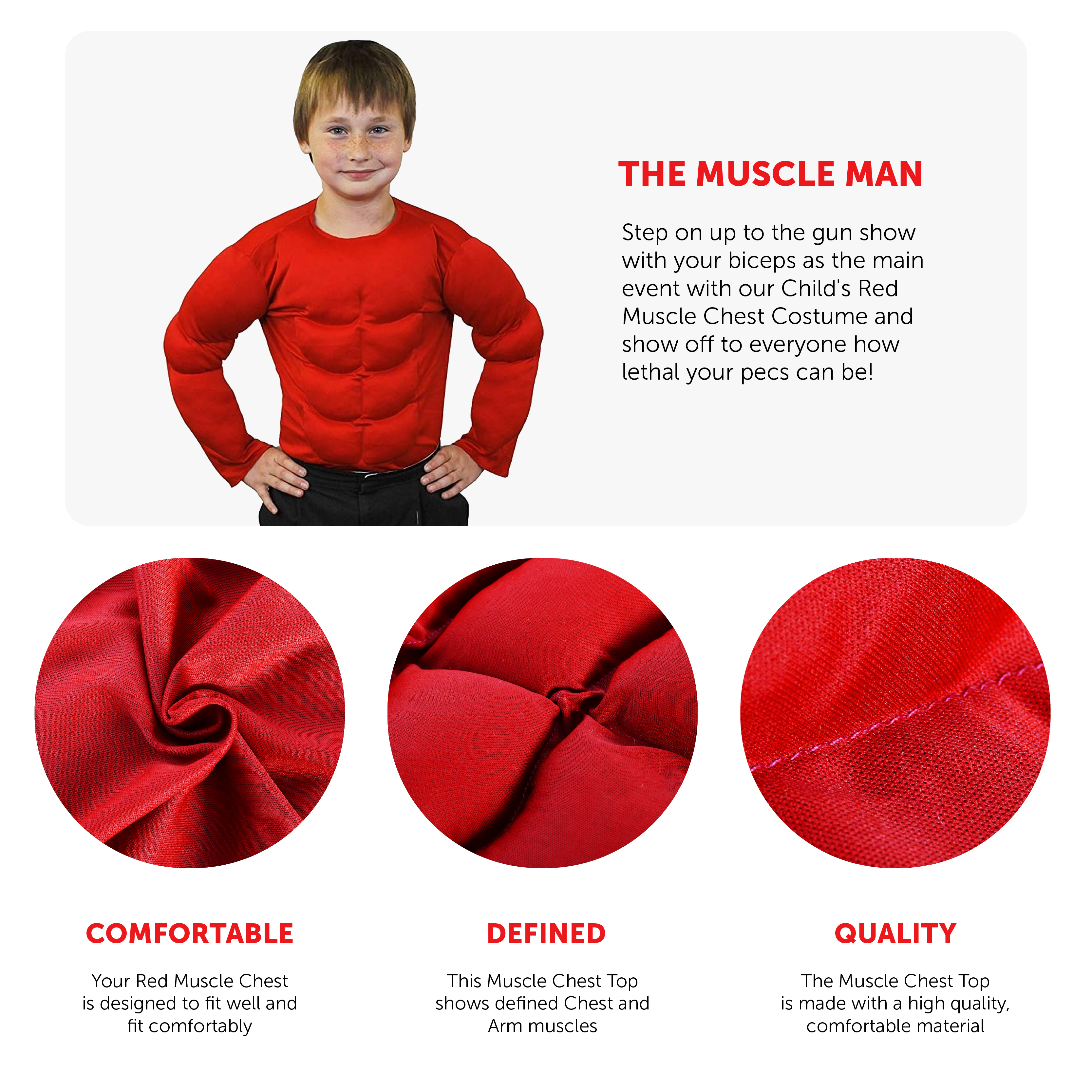 PERFECT FOR TV, FILM, AND NOVELTY EVENTS: Whether you’re playing the role of your own lovable action hero, or for a novelty costume to dress up as, you’ll be the main event regardless, with our Child's Red Muscle Chest Costume!