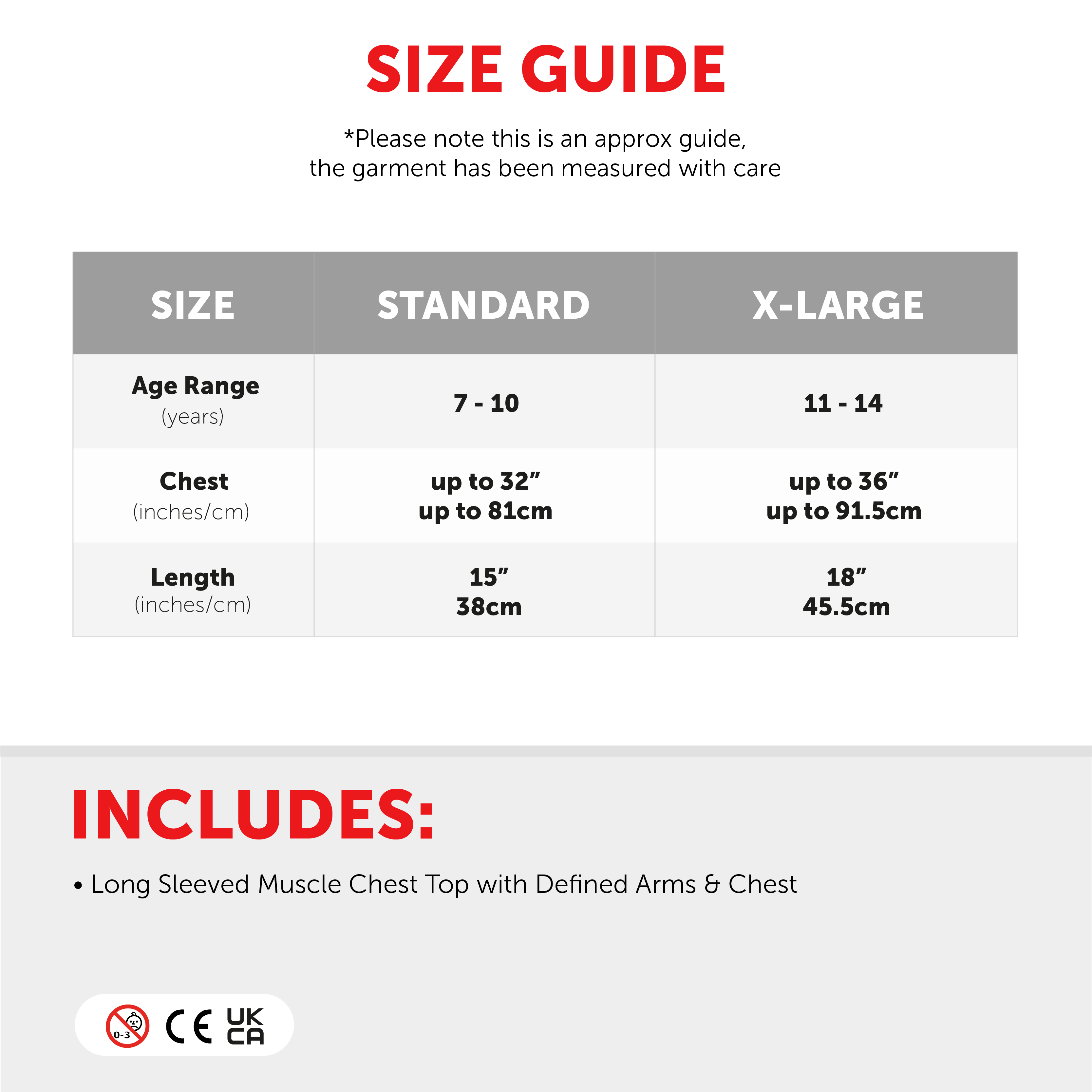 AVAILABLE IN TWO SIZES: Your Red Muscle Chest Costumes will be available in two sizes, Standard and X-Large: Standard - (7 - 10 years), Chest Up to 32" (81cm), Length 15" (38cm) | X-Large - (11 - 14 years), Chest Up to 36" (91.5cm), Length 18" (45.5cm)