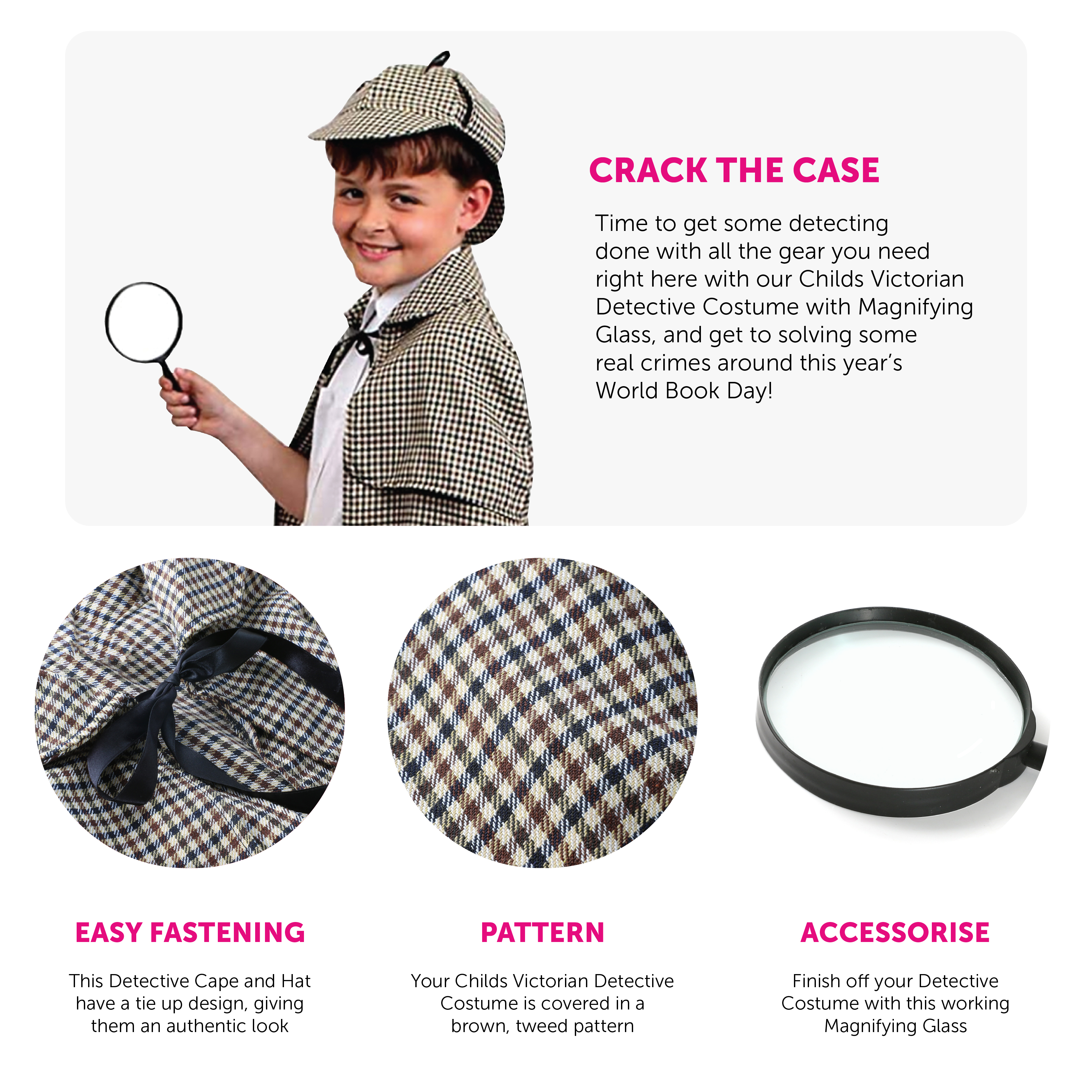 CHILDS VICTORIAN DETECTIVE COSTUME WITH MAGNIFYING GLASS: Time to get some detecting done with all the gear you need right here with our Childs Victorian Detective Costume with Magnifying Glass, and get to solving some real crimes around this year’s World Book Day!