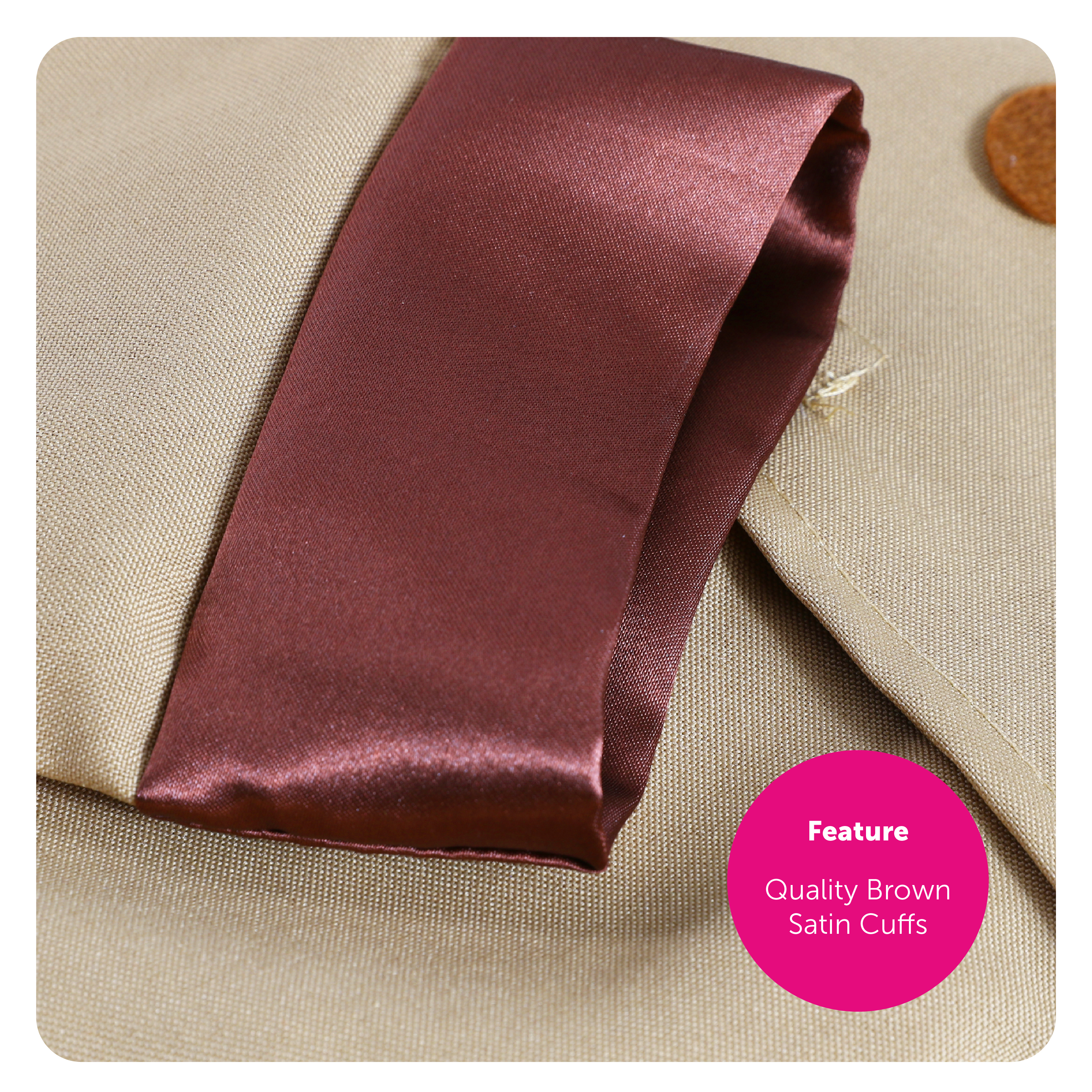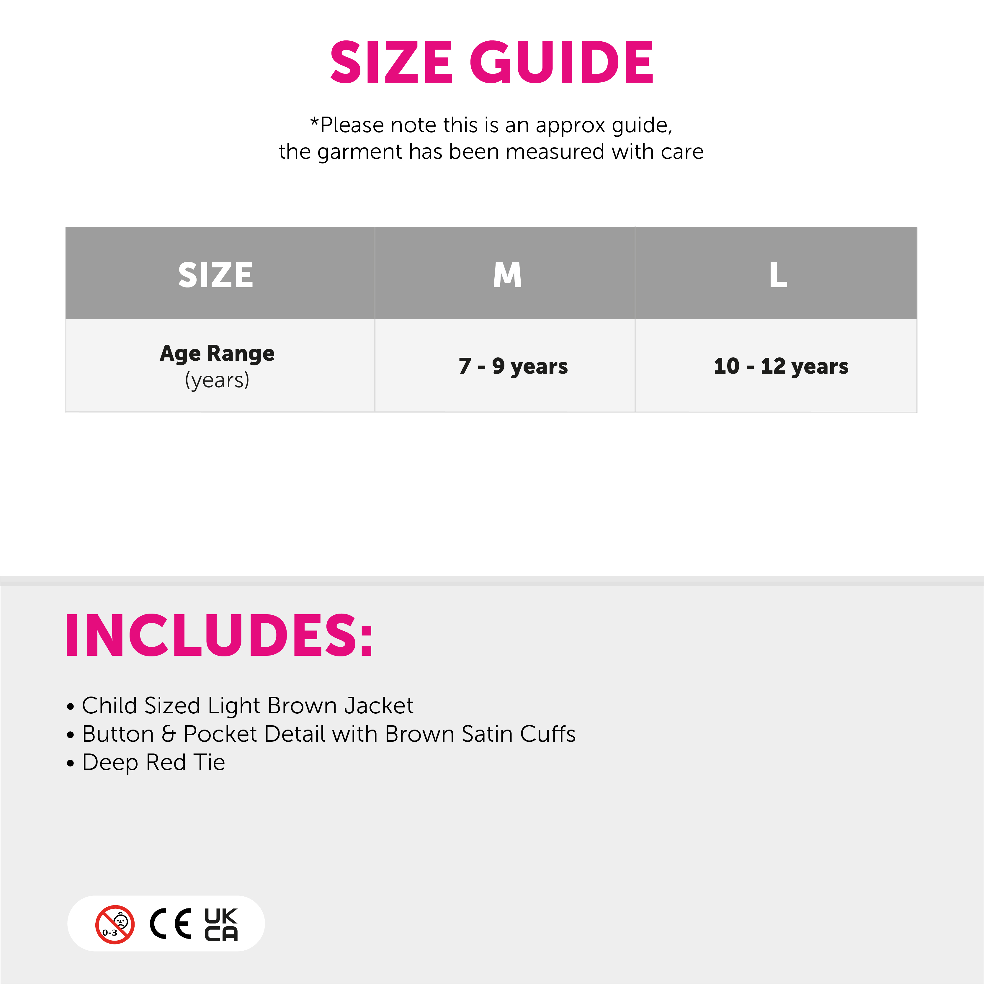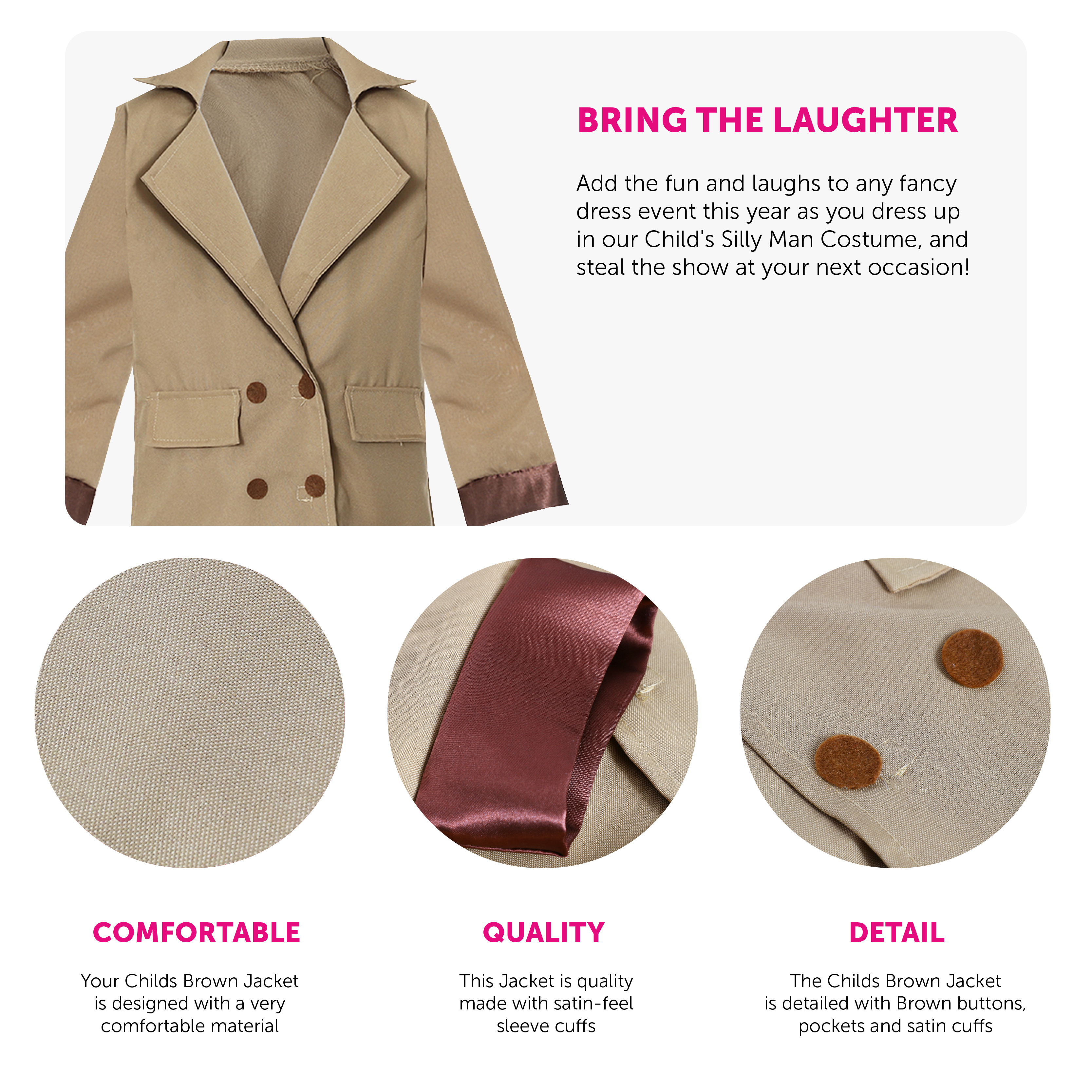 CHILD'S SILLY MAN COSTUME DETAILS: Your Child's Silly Man Costume includes a deep Red Tie and a comfortable light brown Jacket, detailed with Brown Buttons, Pockets and dark Brown Satin Sleeve Cuffs, to finish off your look!