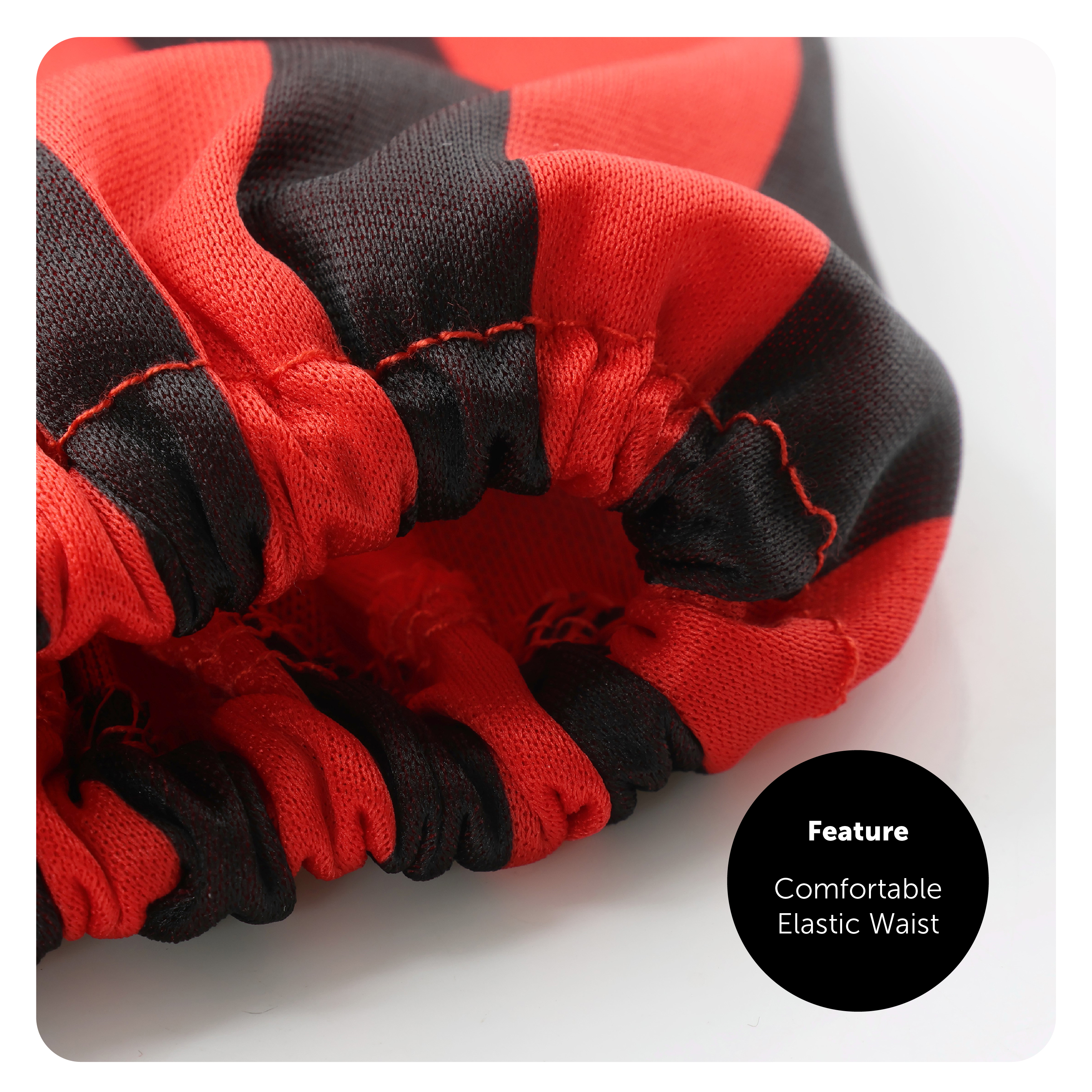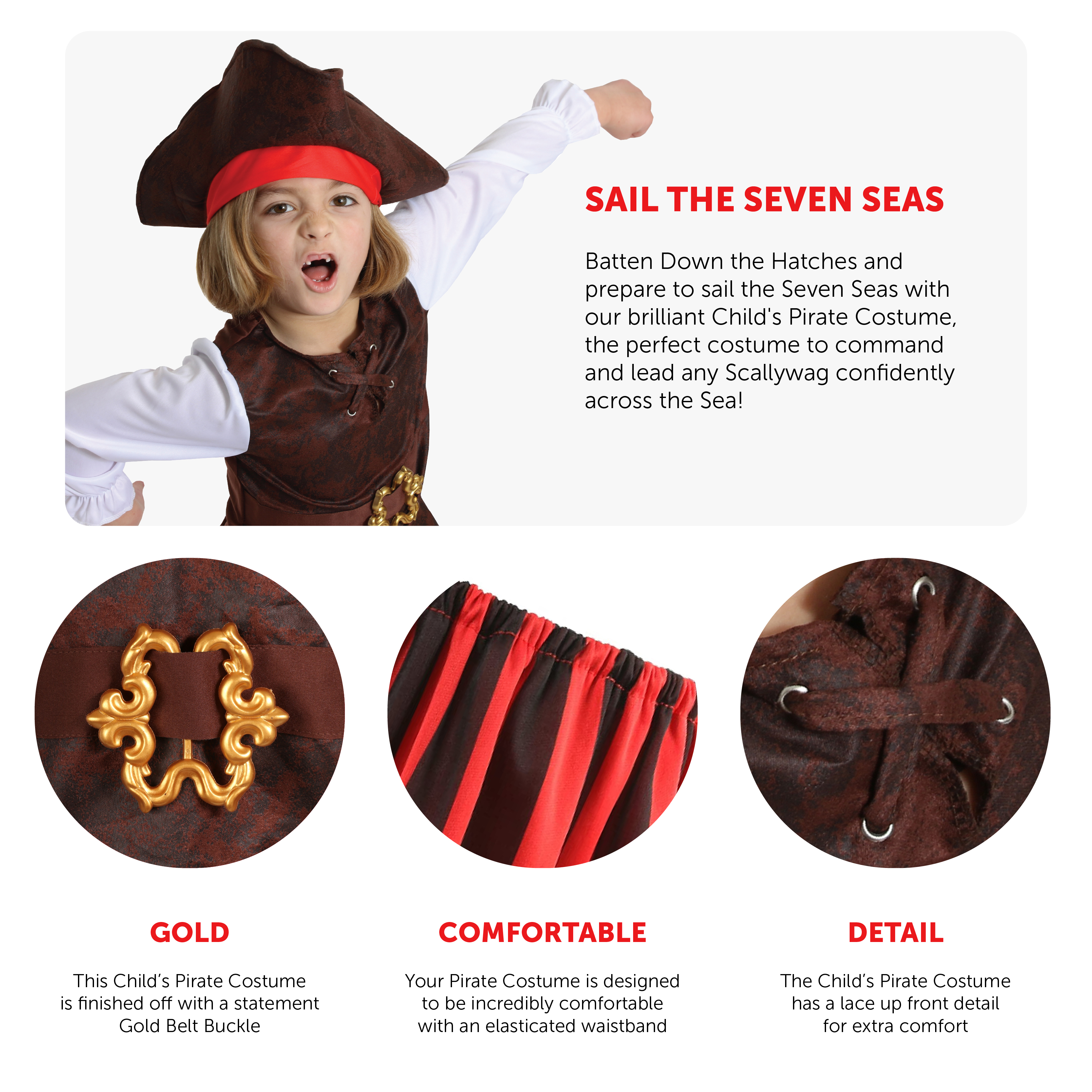CHILD'S PIRATE COSTUME INCLUDES: Your Child's Pirate Costume includes a Brown Leather-Look vest with an Attached White Shirt, a pair of Red and Black Striped Trousers with an elasticated waistband, and a Brown Leather-Look Pirate Hat with a Red Band! Plus, a 5pc Pirate Accessory Set featuring a Hat, Hook, Eyepatch, Earring, and Cutlass to complete the ultimate swashbuckling look!