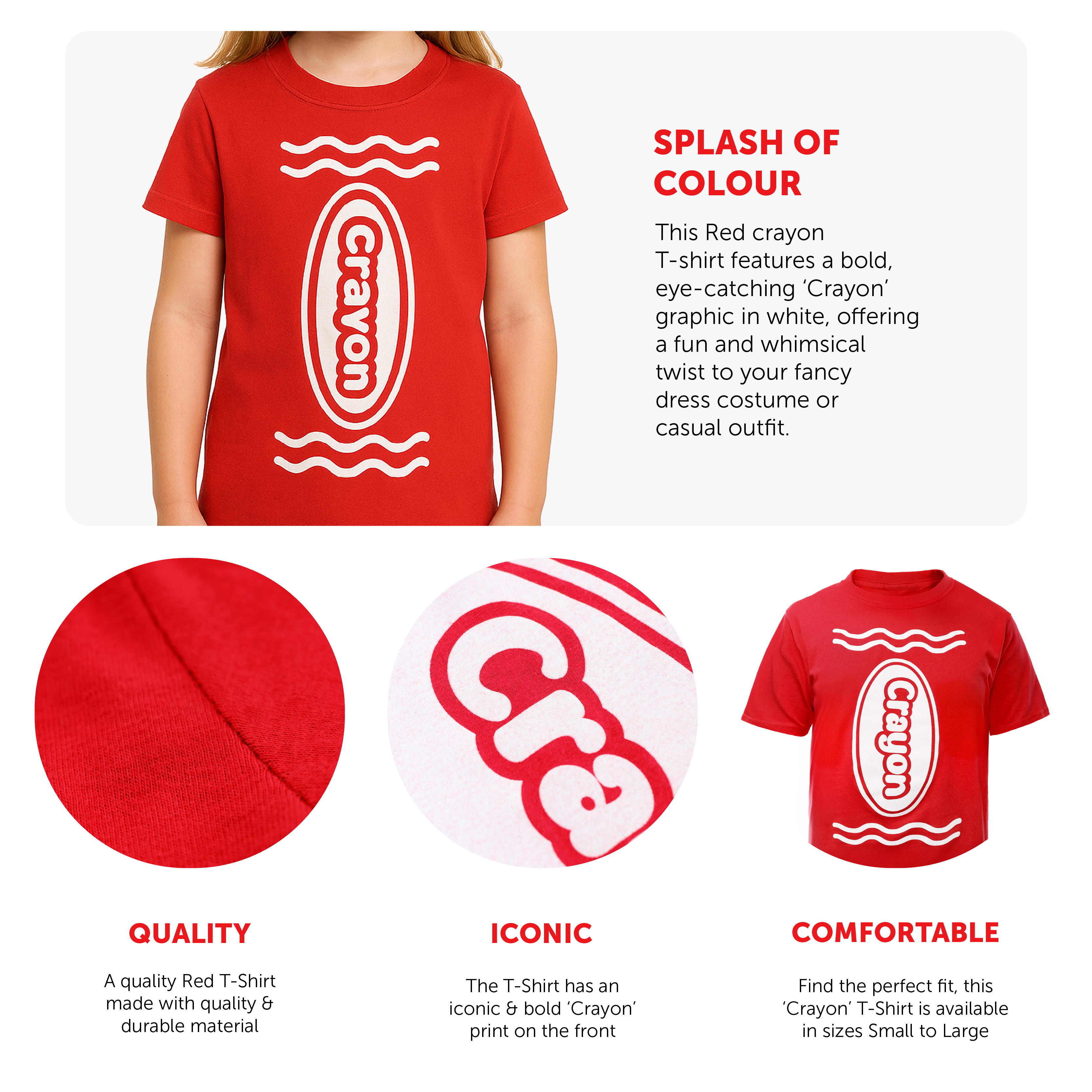 FUN AND CREATIVE DESIGN: This red crayon T-shirt features a bold, eye-catching "Crayon" graphic in white, offering a fun and whimsical twist to your fancy dress costume or casual outfit.