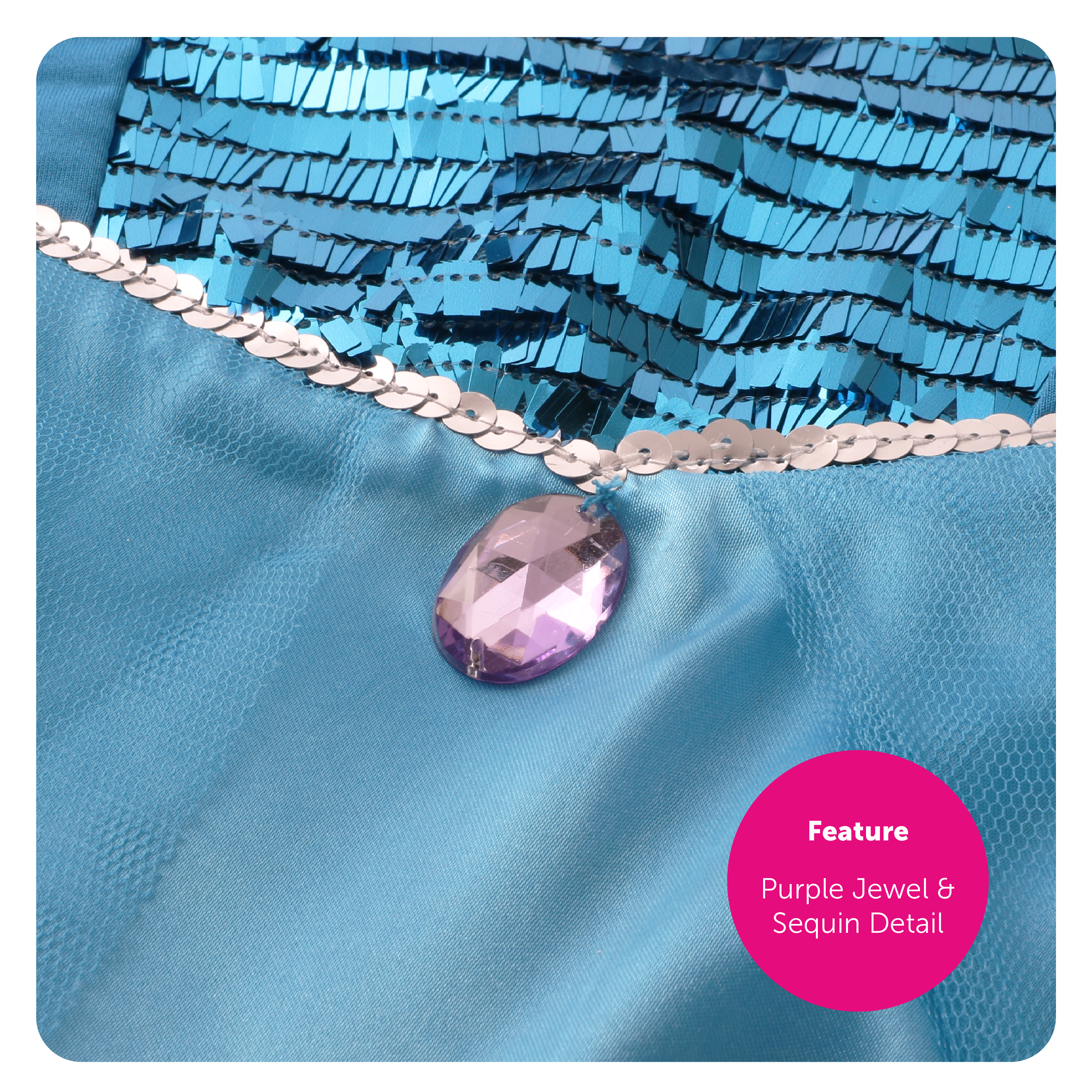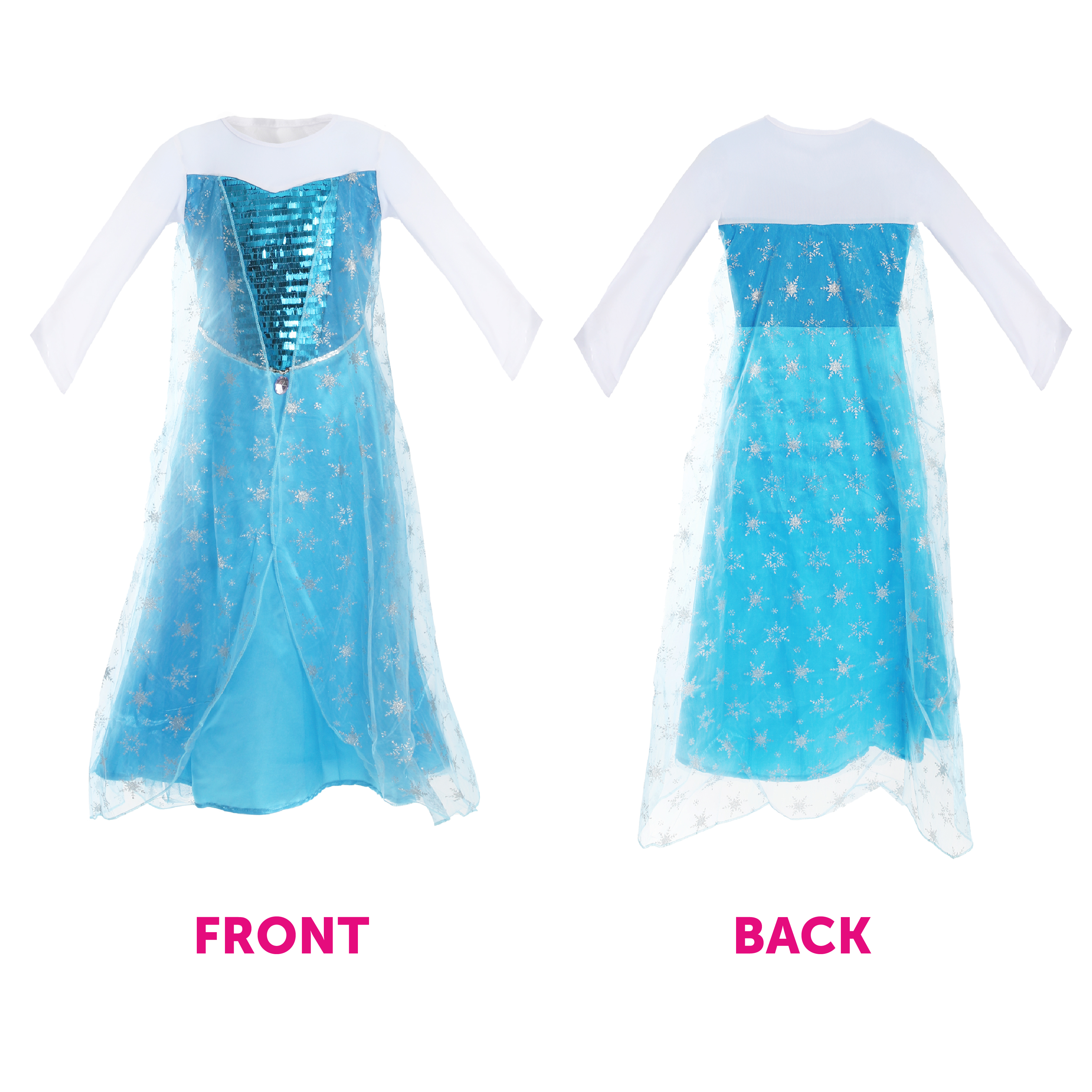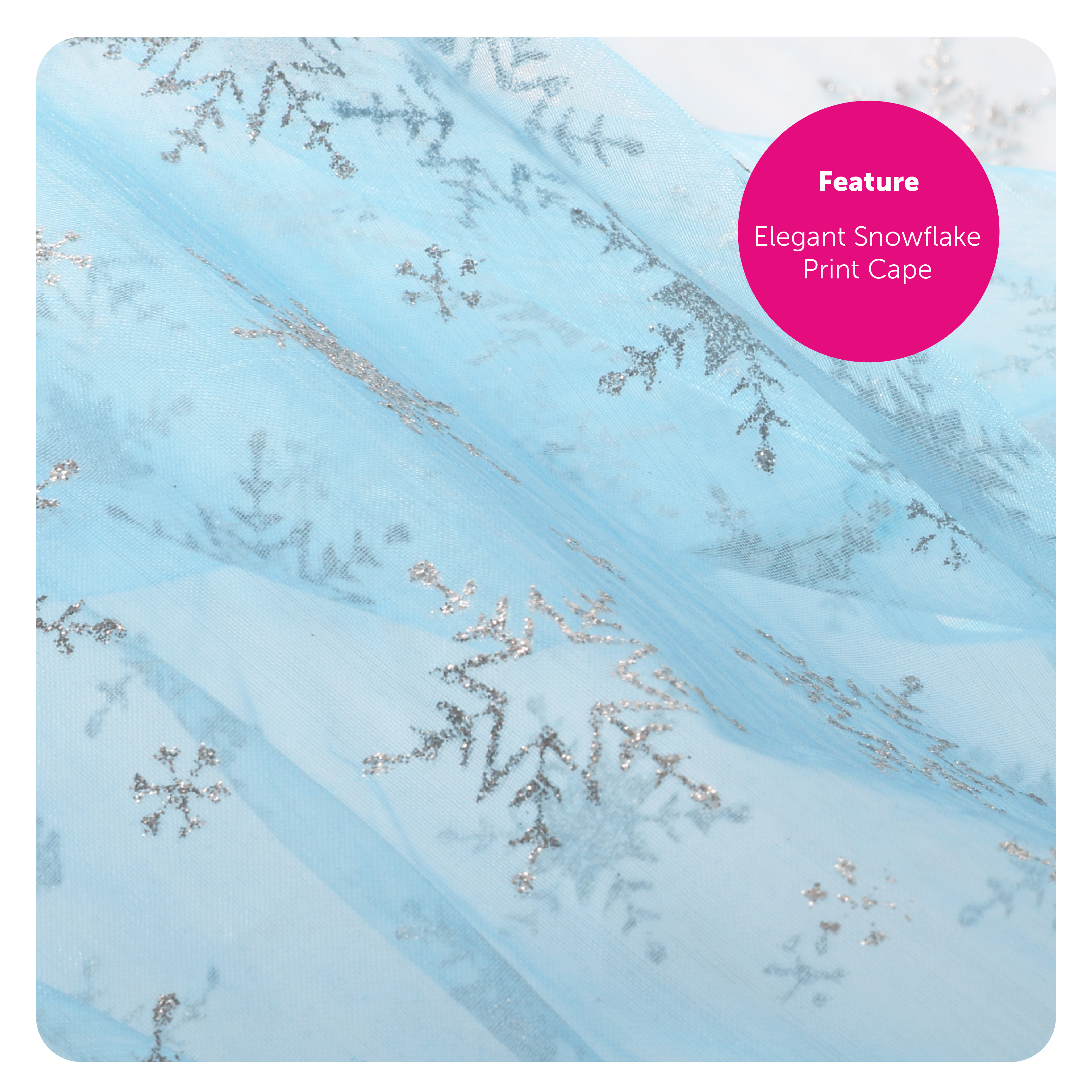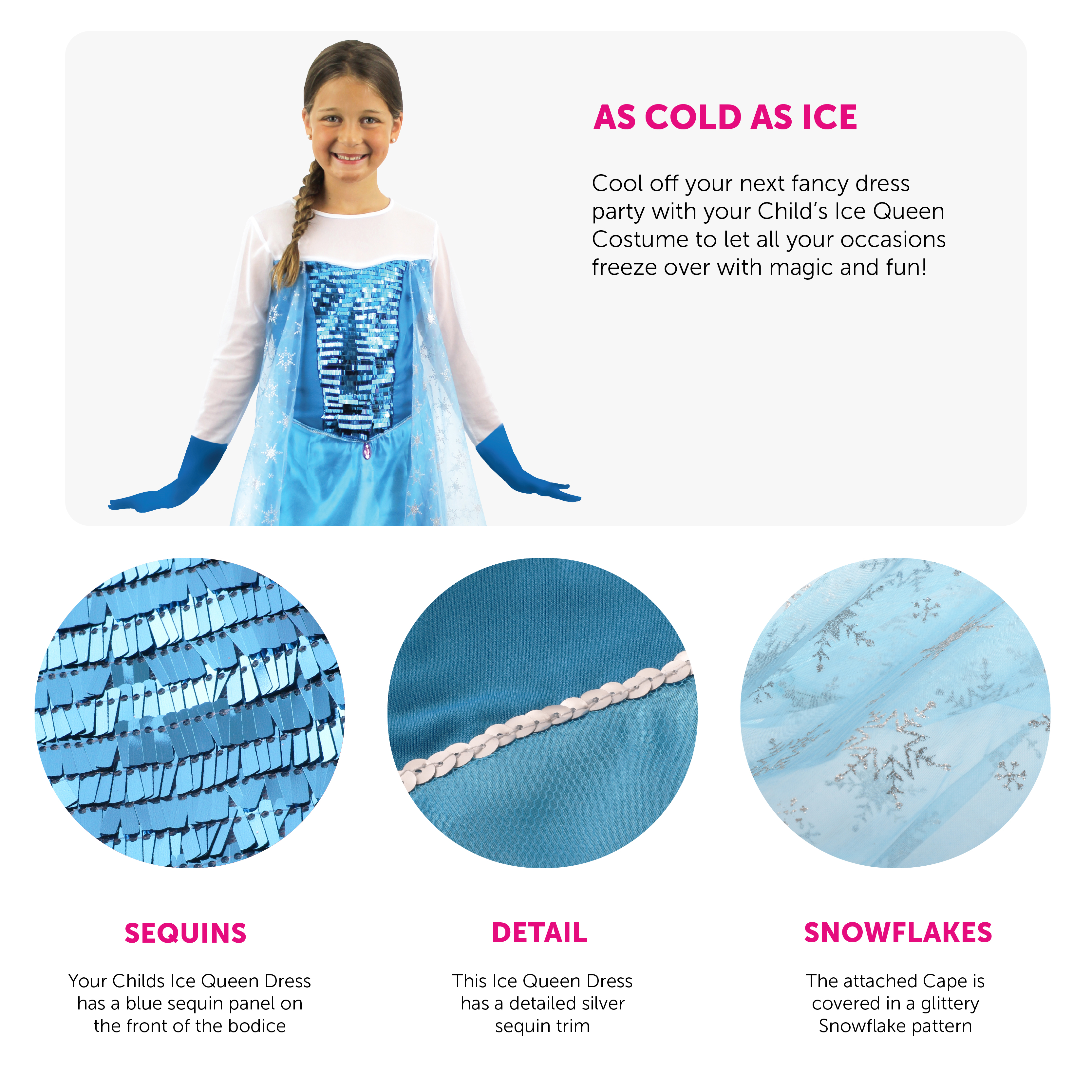 ICE QUEEN COSTUME INCLUDES: Your Child’s Ice Queen Costume includes a Blue Satin Dress with a Blue Sequin Bodice, and an Attached Snowflake Print Cape to complete your iconic princess look!