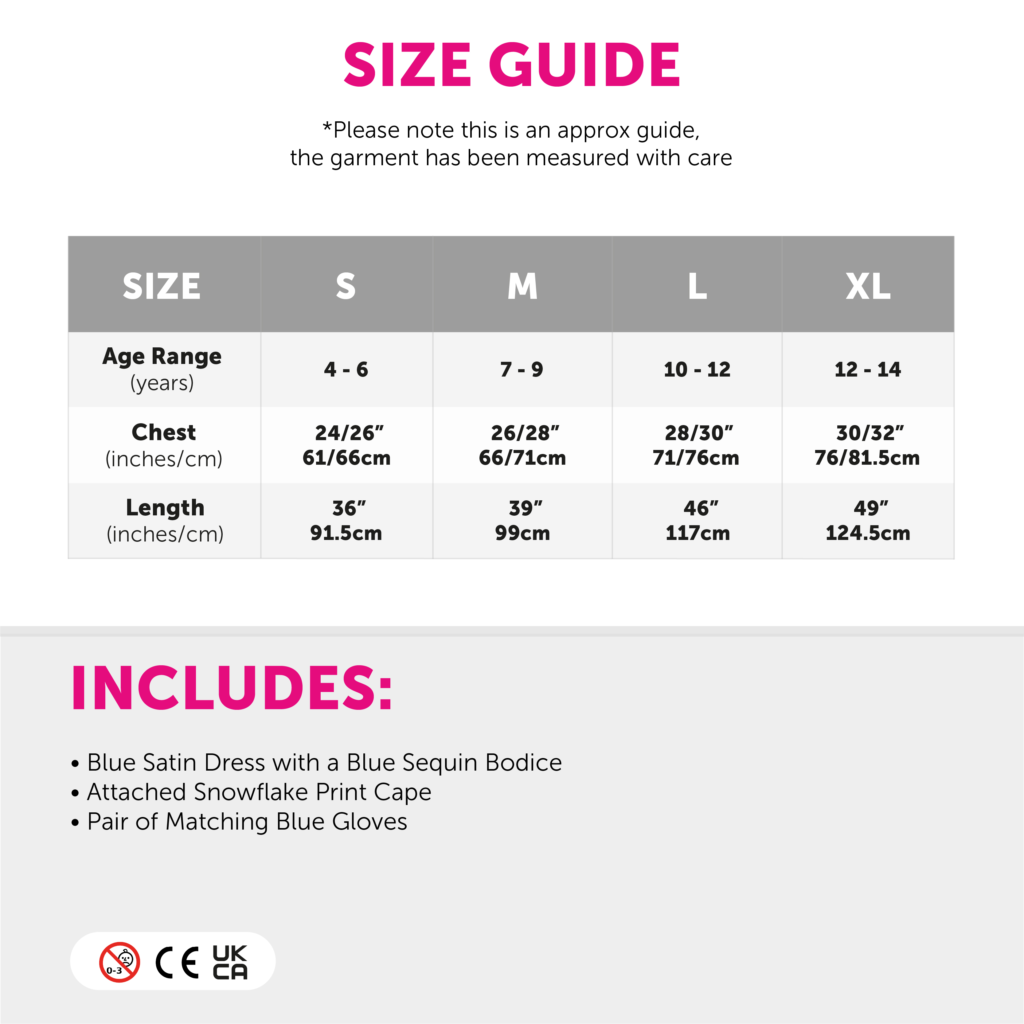 AVAILABLE IN MULTIPLE SIZES: Your Child’s Ice Queen Costume is available in multiple sizes from Small to X-Large: Small: Age: 4/6 Years - Chest: 24-26"/61-66cm - Length: 36"/91.5cm
