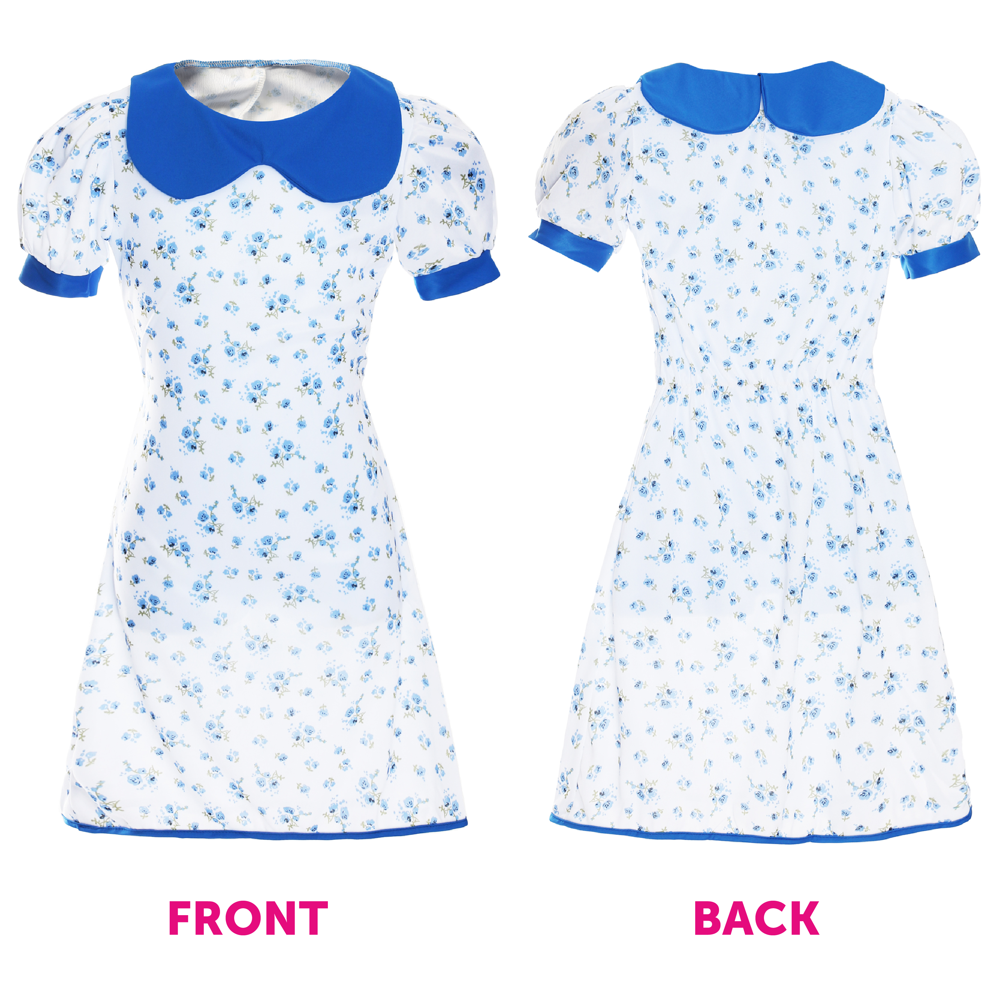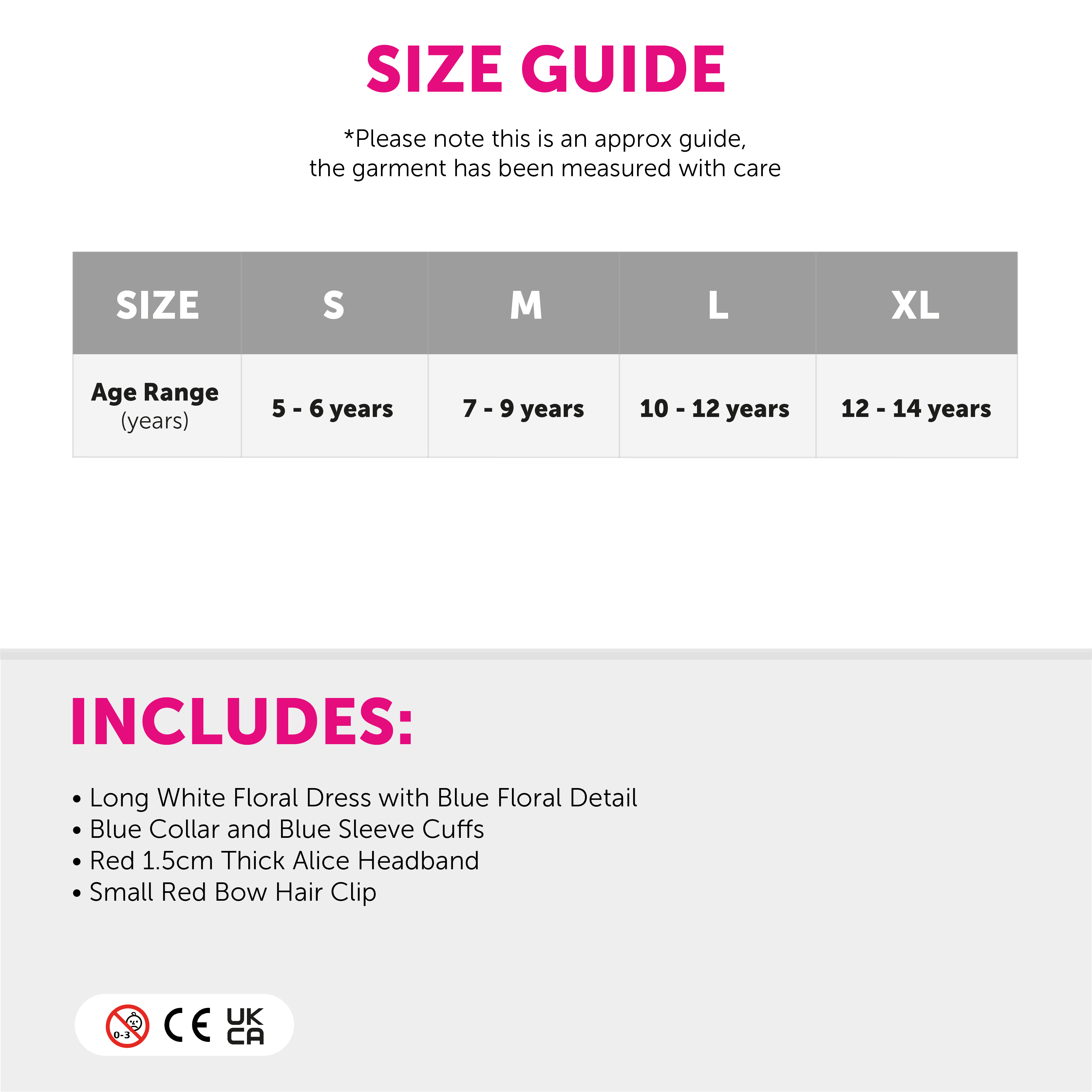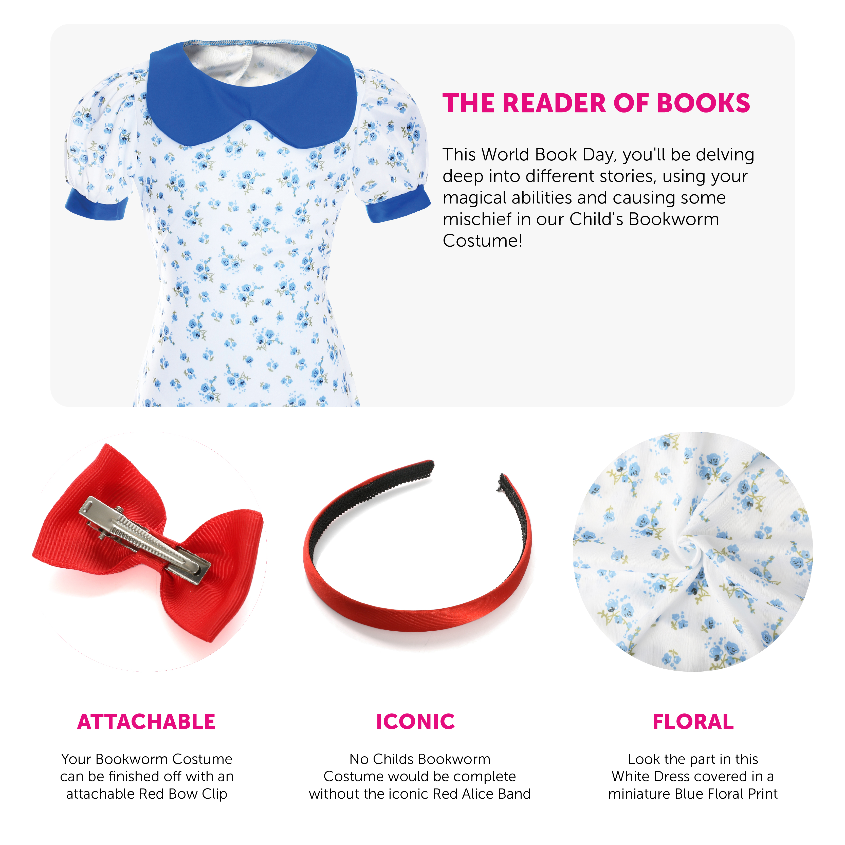 BOOKWORM COSTUME INCLUDES: Your Child's Bookworm Costume includes a long White Dress with Blue Floral detail, matching Blue Collar and Cuffs, a silk-like Red Headband and a small Red Bow Hair Clip, to finish off your outfit!