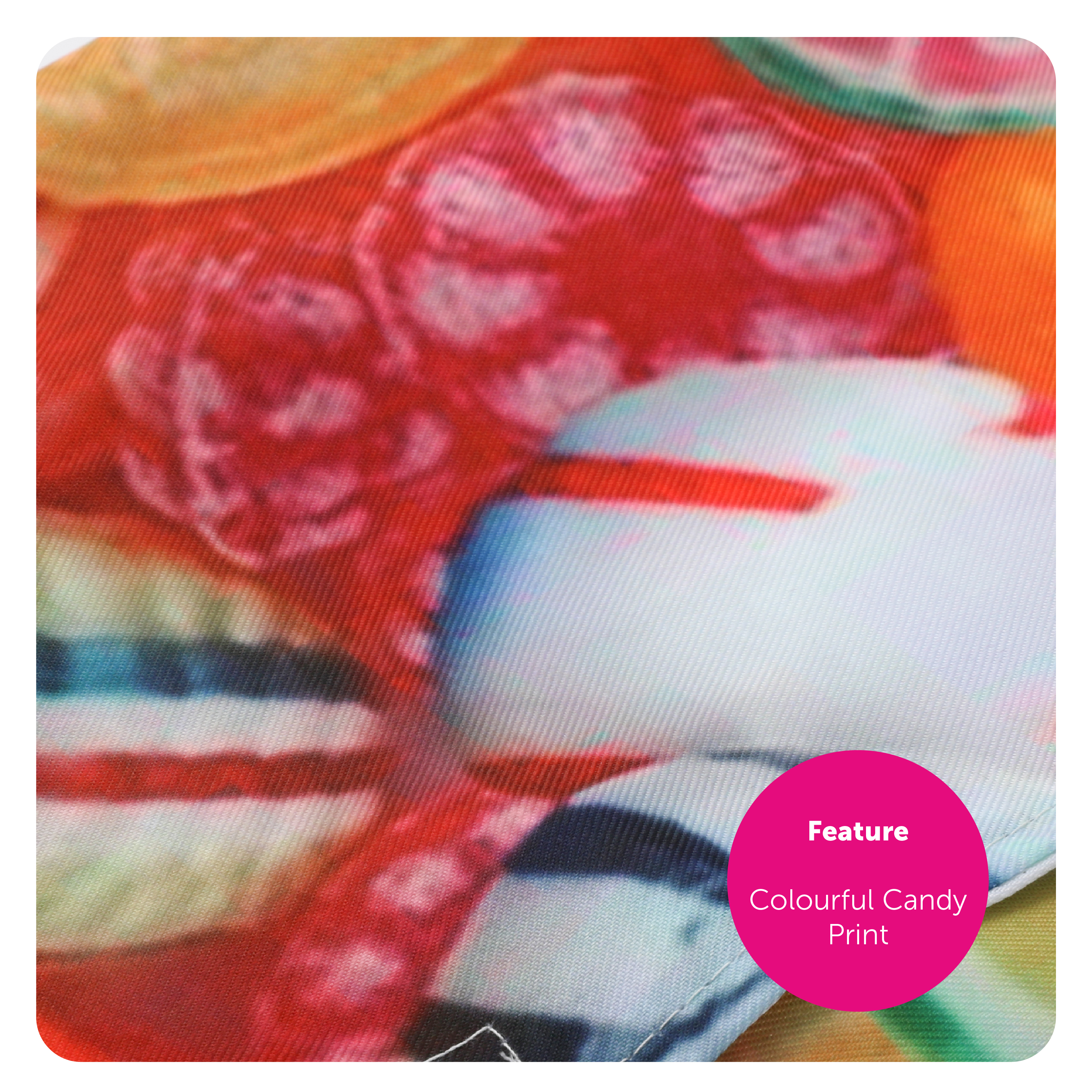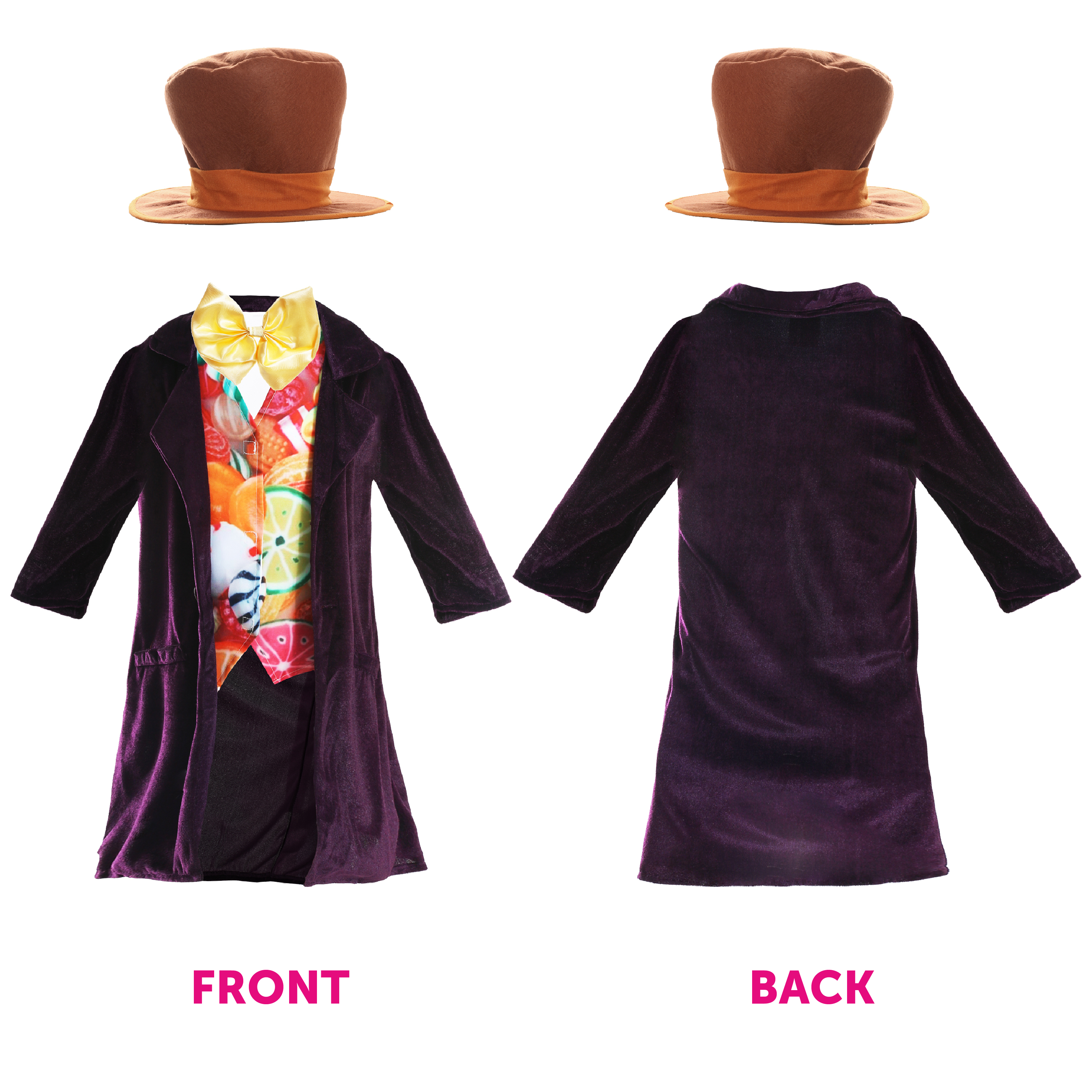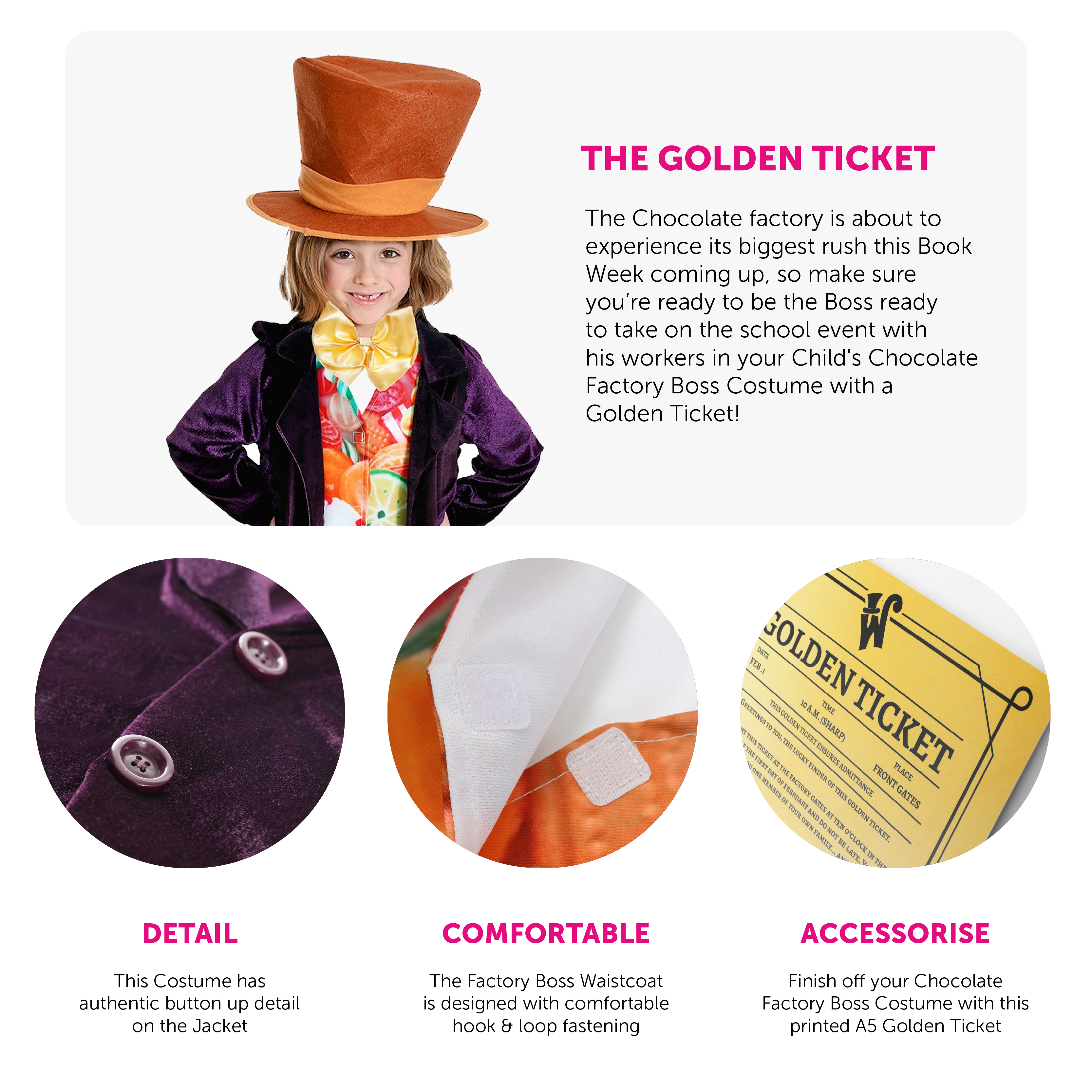 COSTUME INCLUDES: Your Child's Chocolate Factory Boss Costume includes a Deep Purple Velvet Coat, a Bright Candy Print Waistcoat with Buttons, a Large Silk Golden Bow Tie, and an Oversized Brown Hat with Orange Band, the perfect look for World Book Day!