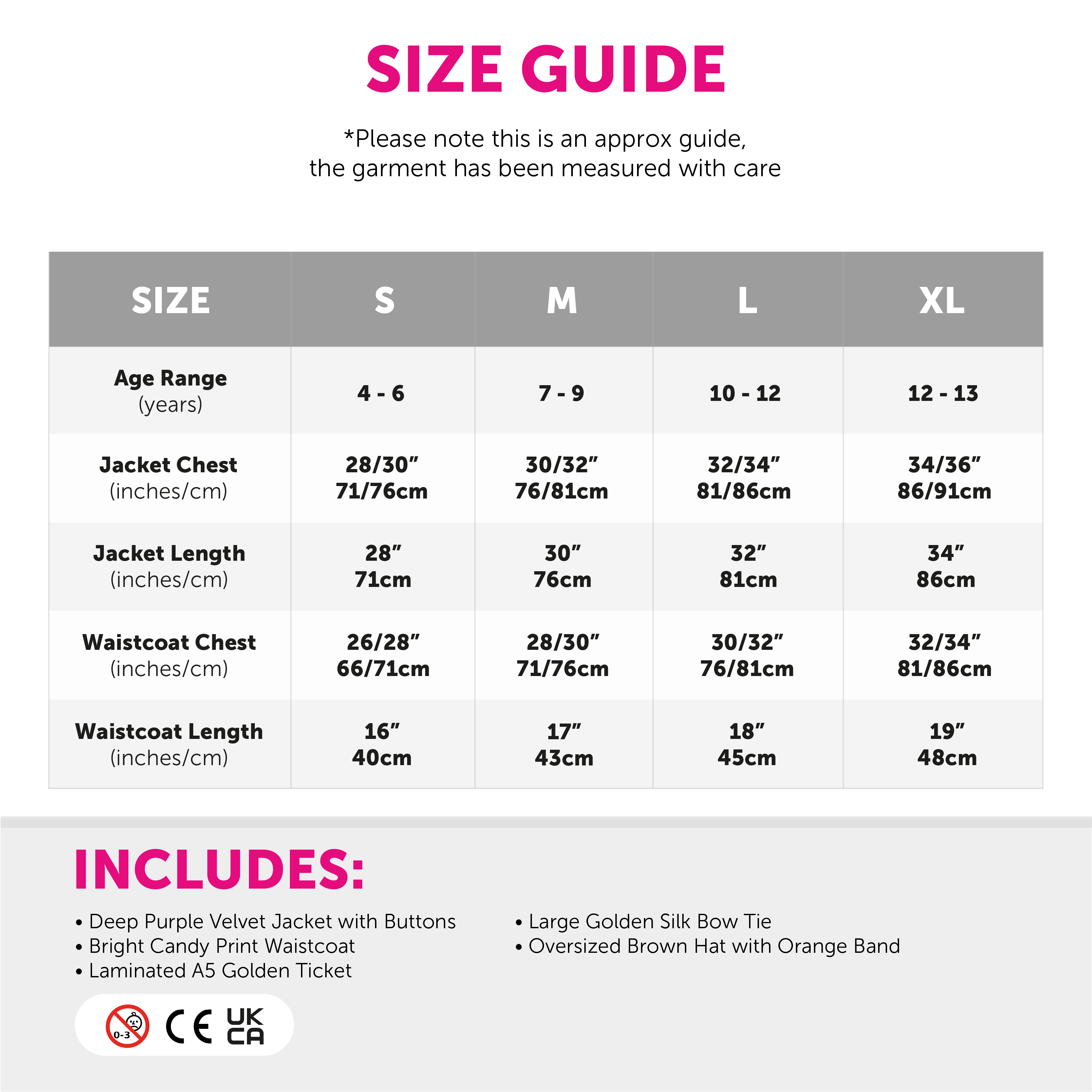 AVAILABLE IN MULTIPLE SIZES: This Child's Chocolate Factory Boss Costume is available in multiple sizes from Small to X-Large: Small (4 - 6 years), Jacket Chest: 28/30" (71/76cm), Jacket Length: 28" (71cm), Waistcoat Chest: 26/28" (66/71cm), Waistcoat Length: 16" (40cm) | Medium (7 - 9 years), Jacket Chest: 30/32" (76/81cm), Jacket Length: 30" (76cm), Waistcoat Chest: 28/30" (71/76cm), Waistcoat Length: 17" (43cm) | Large (10 - 12 years), Jacket Chest: 32/34" (81/86cm), Jacket Length: 32" (81cm), Waistcoat Chest: 30/32" (76/81cm), Waistcoat Length: 18" (45cm) | X-Large (12 - 13 years), Jacket Chest: 34/36" (86/91cm), Jacket Length: 34" (86cm), Waistcoat Chest: 32/34" (81/86cm), Waistcoat Length: 19" (48cm)