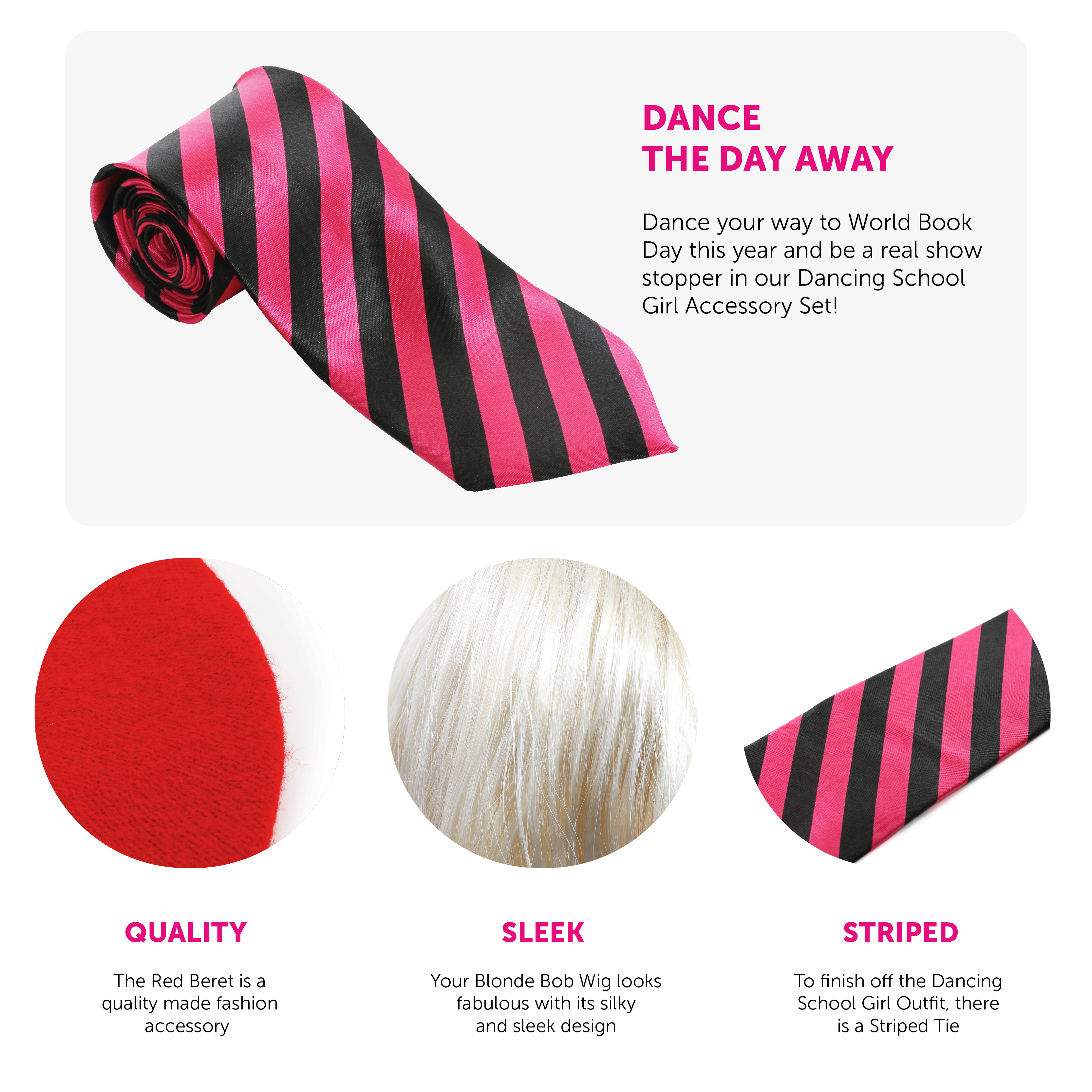 DANCING SCHOOL GIRL SET INCLUDES: Your Dancing School Girl Set includes a soft Red Beret, a silky Blonde Bob Wig and a Black and Pink Striped Tie, to finish off your outfit!