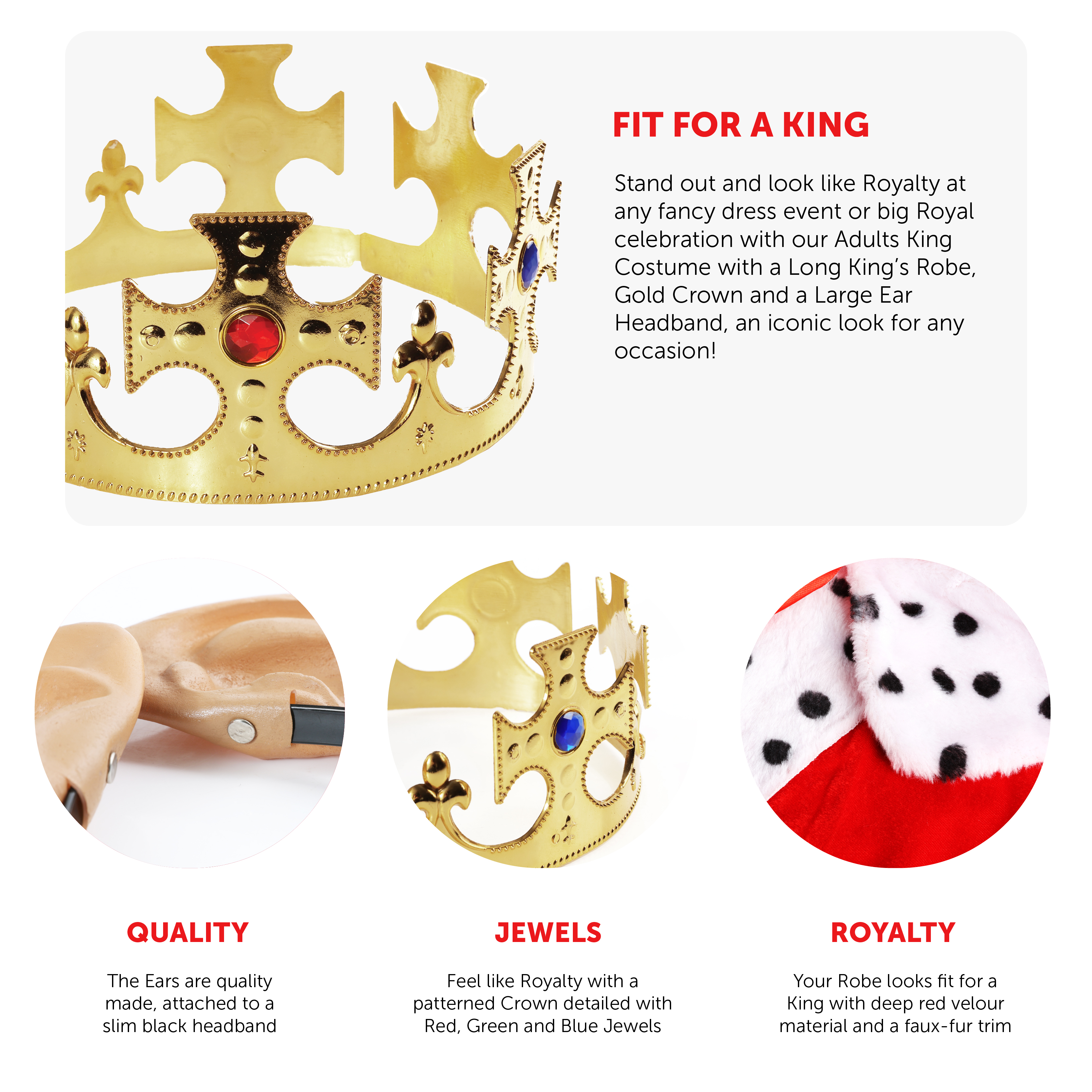 COSTUME DETAILS: Your Adults King Costume includes a long, tie-up Red Velour Robe with White & Black Faux Fur Trim, an adjustable Gold Plastic Crown with Blue, Green and Red Jewels attached and a comfortable headband with Large Ears attached to either side, the perfect addition to any King Outfit!