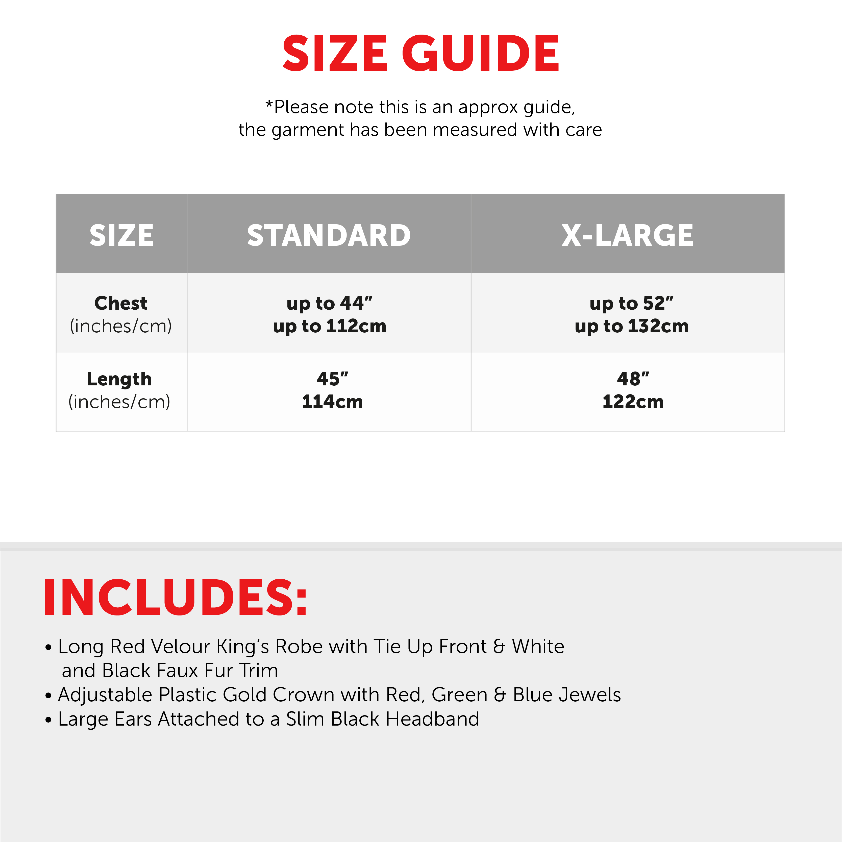 AVAILABLE IN TWO SIZES: This Adults King Costume is available in two sizes, Standard and X-Large: Standard - Chest: up to 44" (112cm), Length: 45" (114cm) | X-Large - Chest: up to 52" (132cm), Length: 48" (122cm)