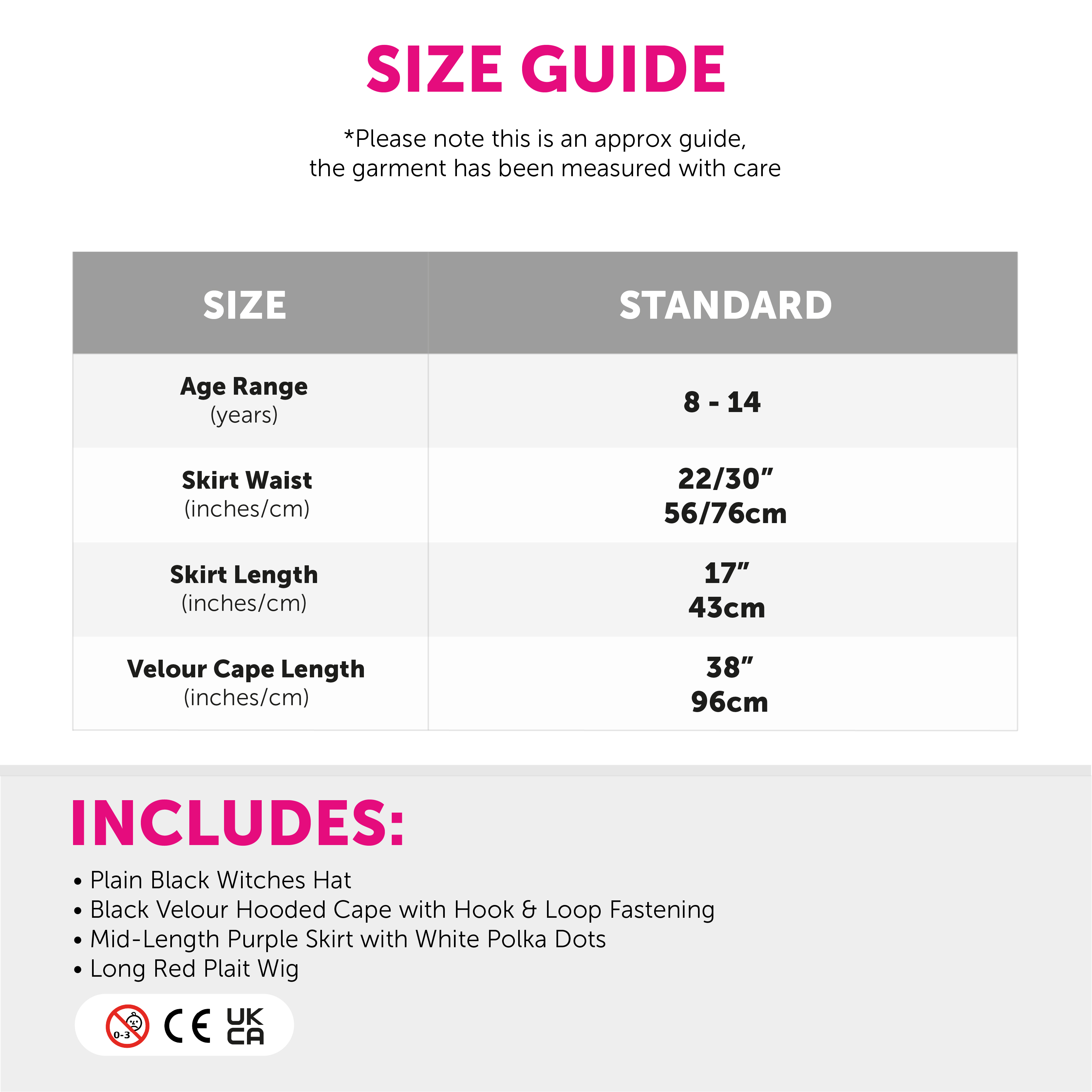 COSTUME INCLUDES: This Childs Kind Witch Costume includes a Black Witches Hat, a Red Plait Wig, a soft Black Velour Hooded Cape with hook and loop fastening, and a Purple and White Polka Dot Skirt, the perfect look for World Book Day!