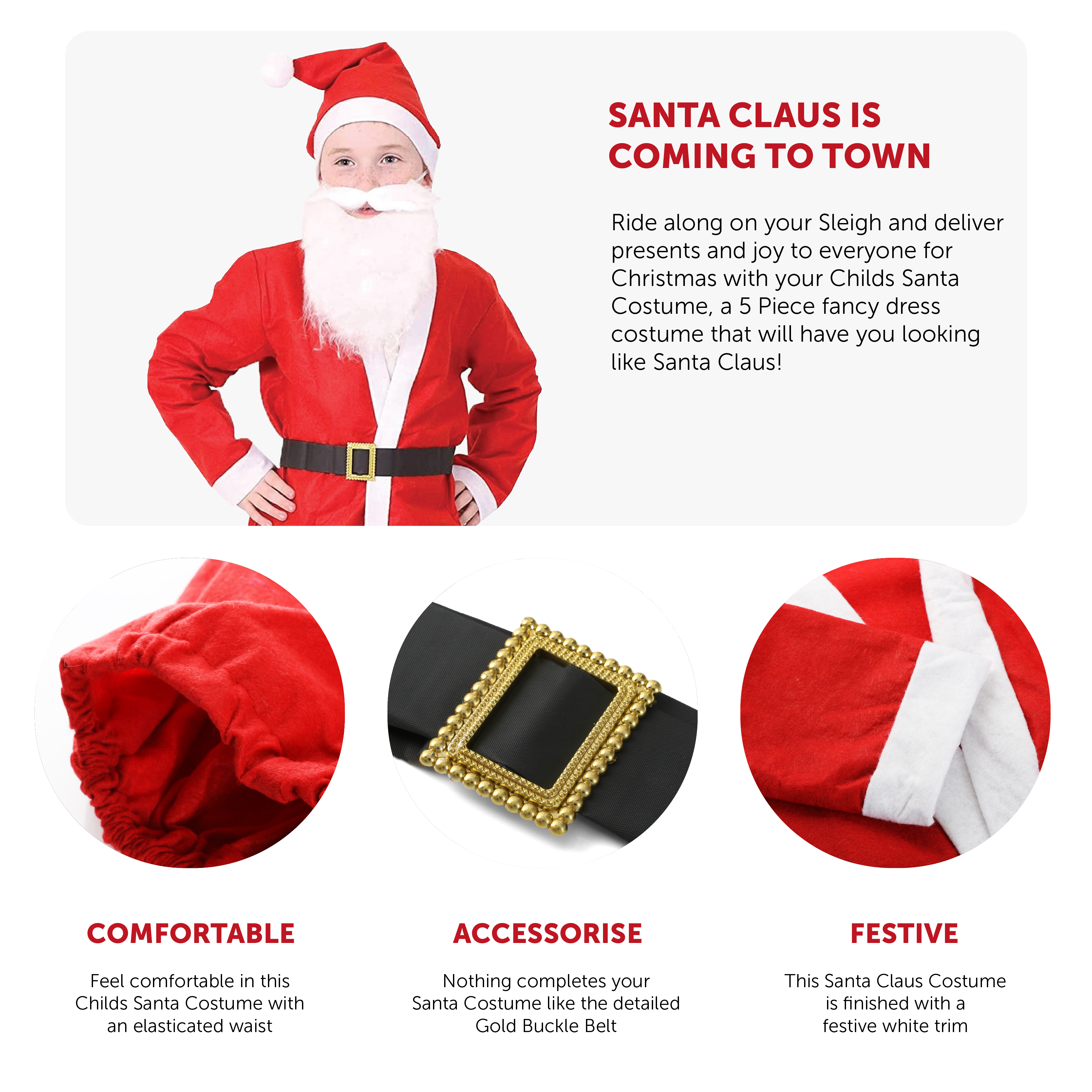 AVAILABLE IN MULTIPLE SIZES: Your Childs 5 Piece Santa Costume is available in multiple sizes from Small to X-Large: Small (4/6 Years) - Chest - 24/26", Waist - 22/24", Medium (7/9 Years) - Chest - 28/30", Waist - 24/26", Large (10/12 Years) - Chest - 30/32", Waist - 26/28", X-Large (12/13 Years) - Chest - 32/34", Waist - 28/30"