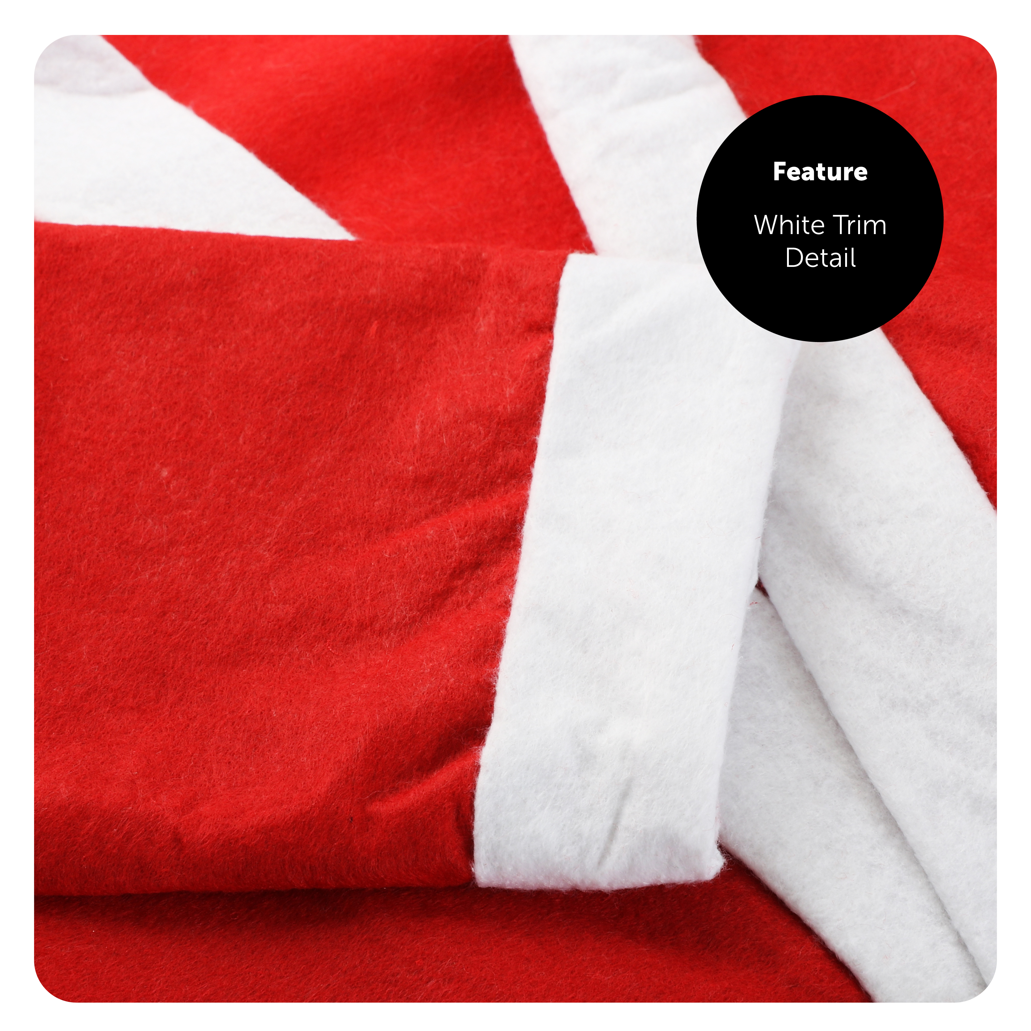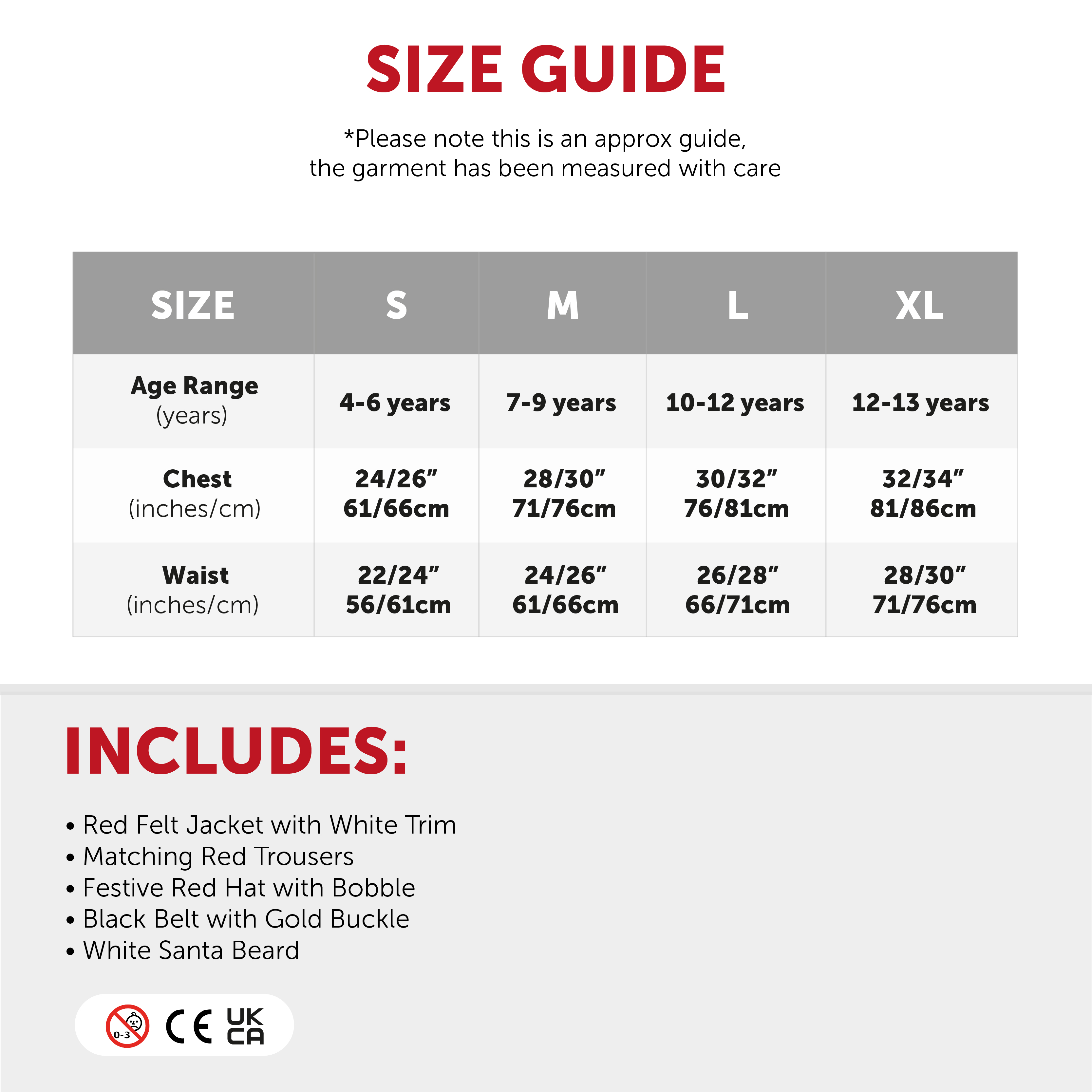 COSTUME INCLUDES: Your Childs Santa Costume includes a Red Felt Jacket with White Trim, Matching Red Trousers, Festive Red Hat with Bobble, a Black Belt, and a White Santa Beard!