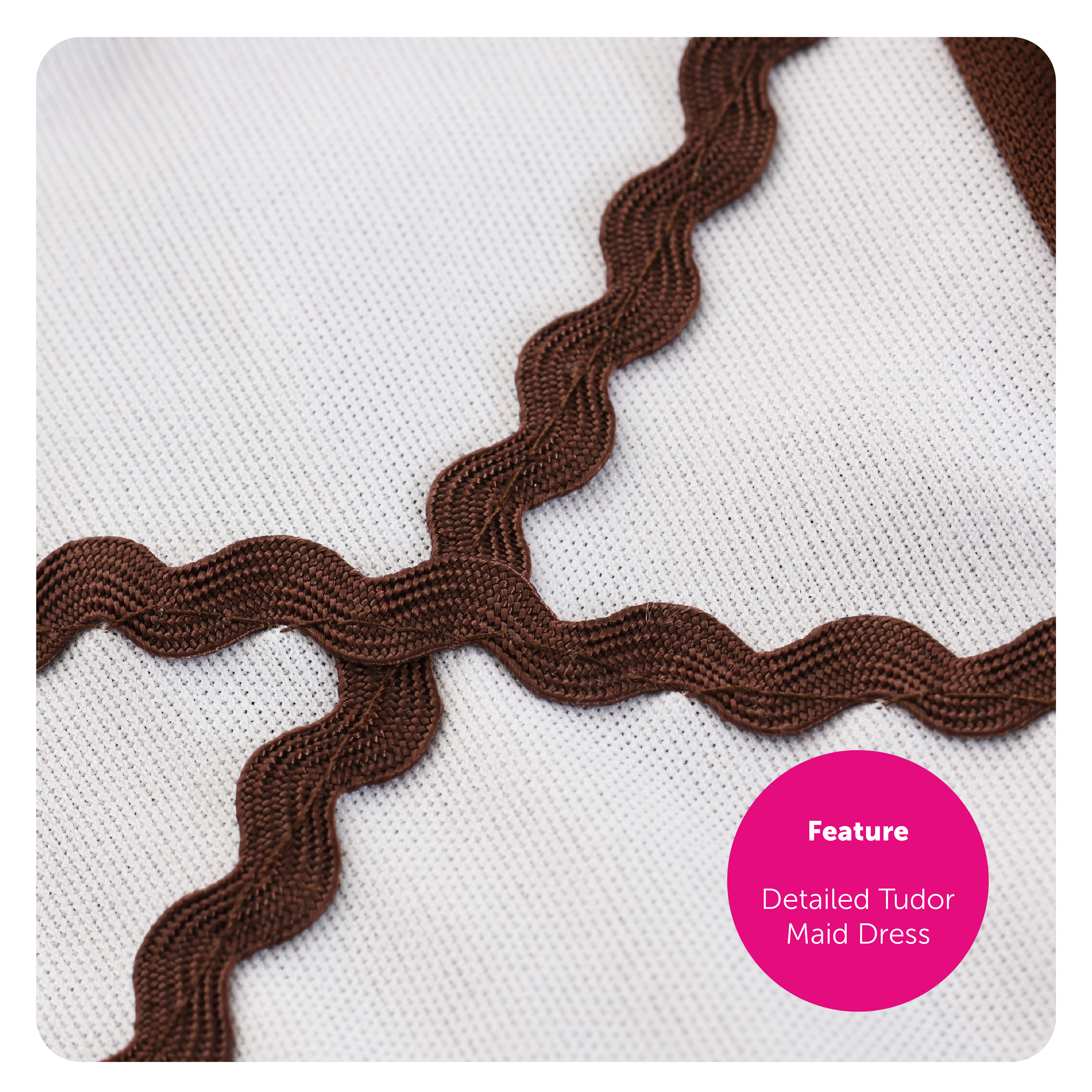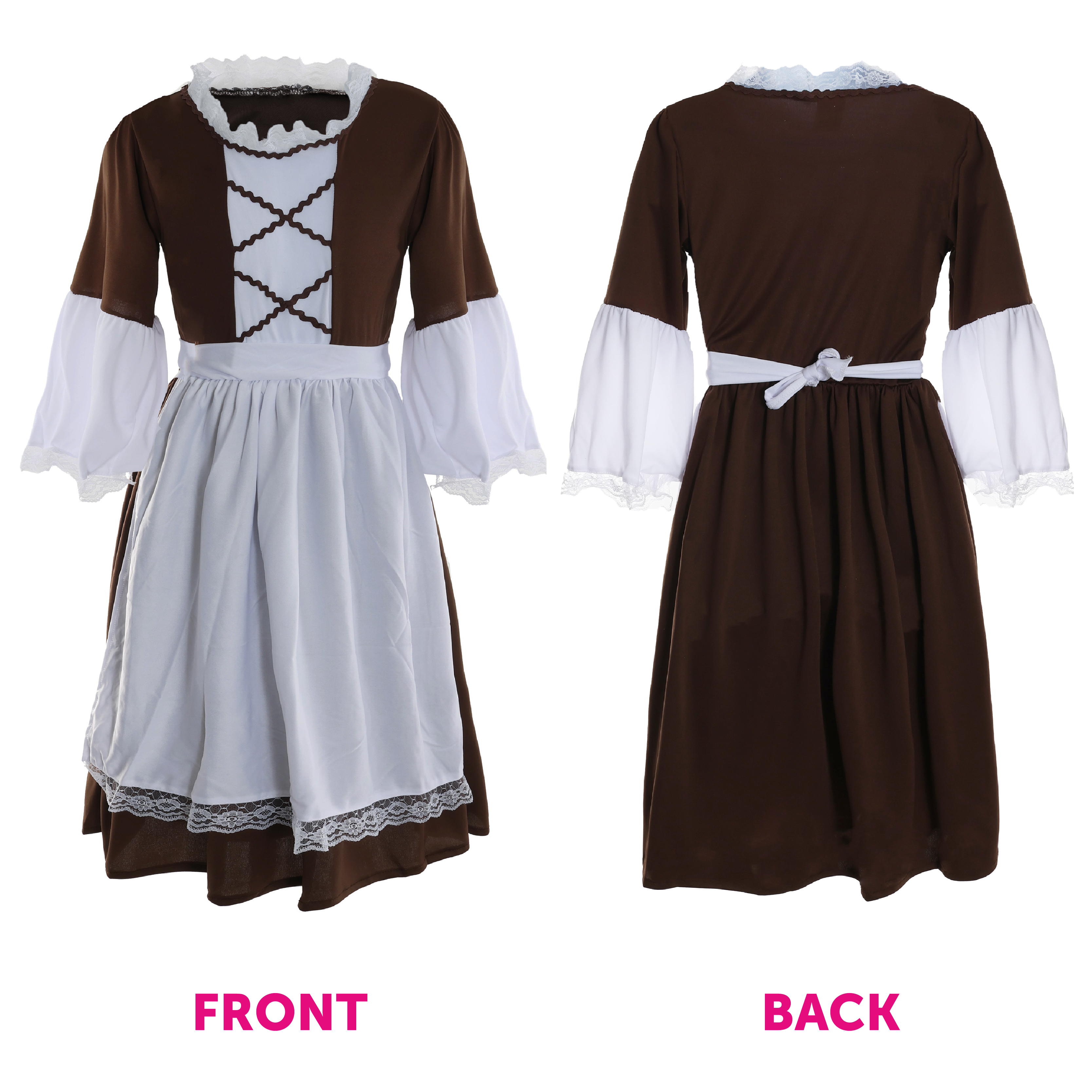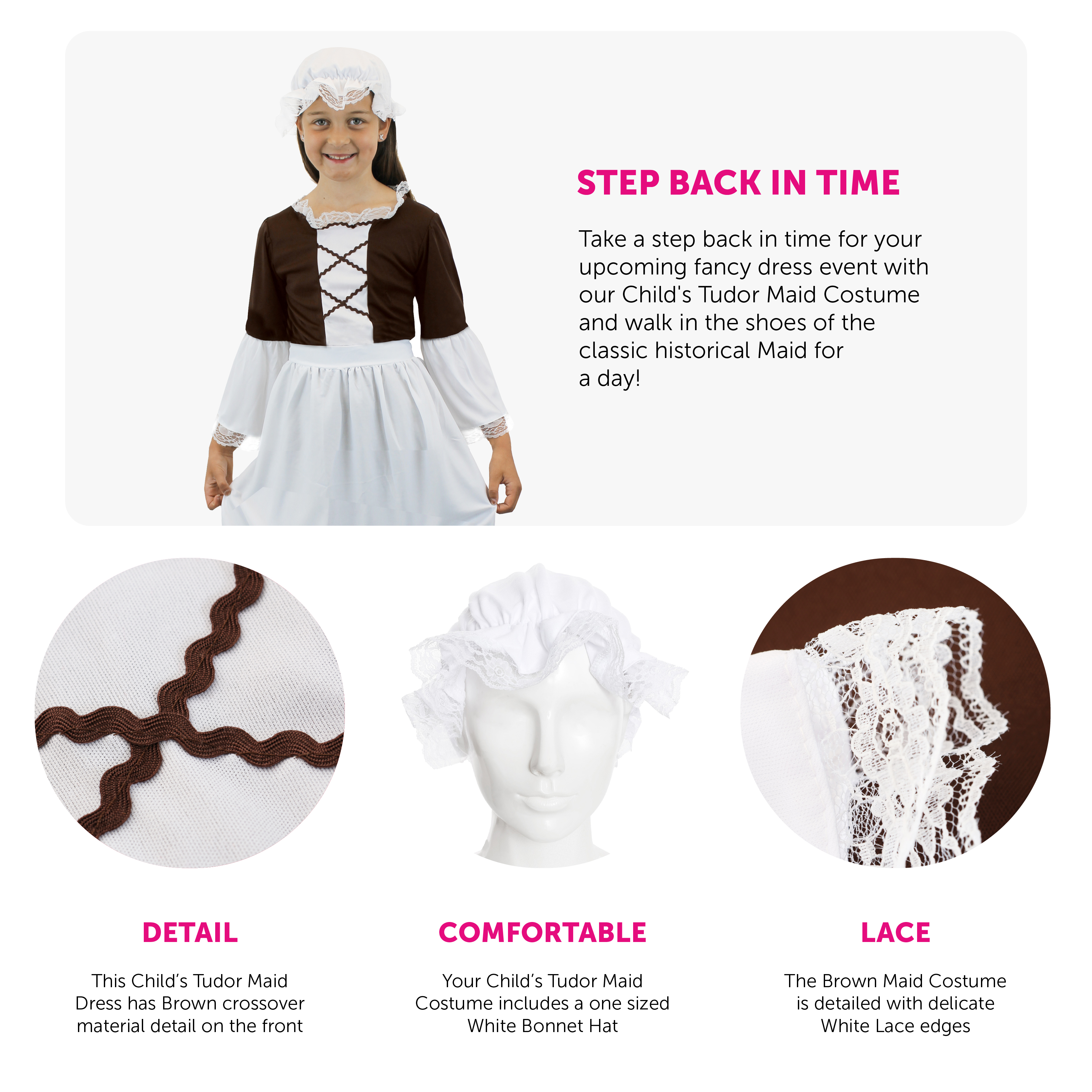 COSTUME INCLUDES: Your Child's Tudor Maid Costume includes a White Bonnet Hat, a Dark Brown Dress with a Lace Neckline, White Sleeves detailed with delicate Lace edging and a matching detailed White Apron, the perfect Costume for any event!
