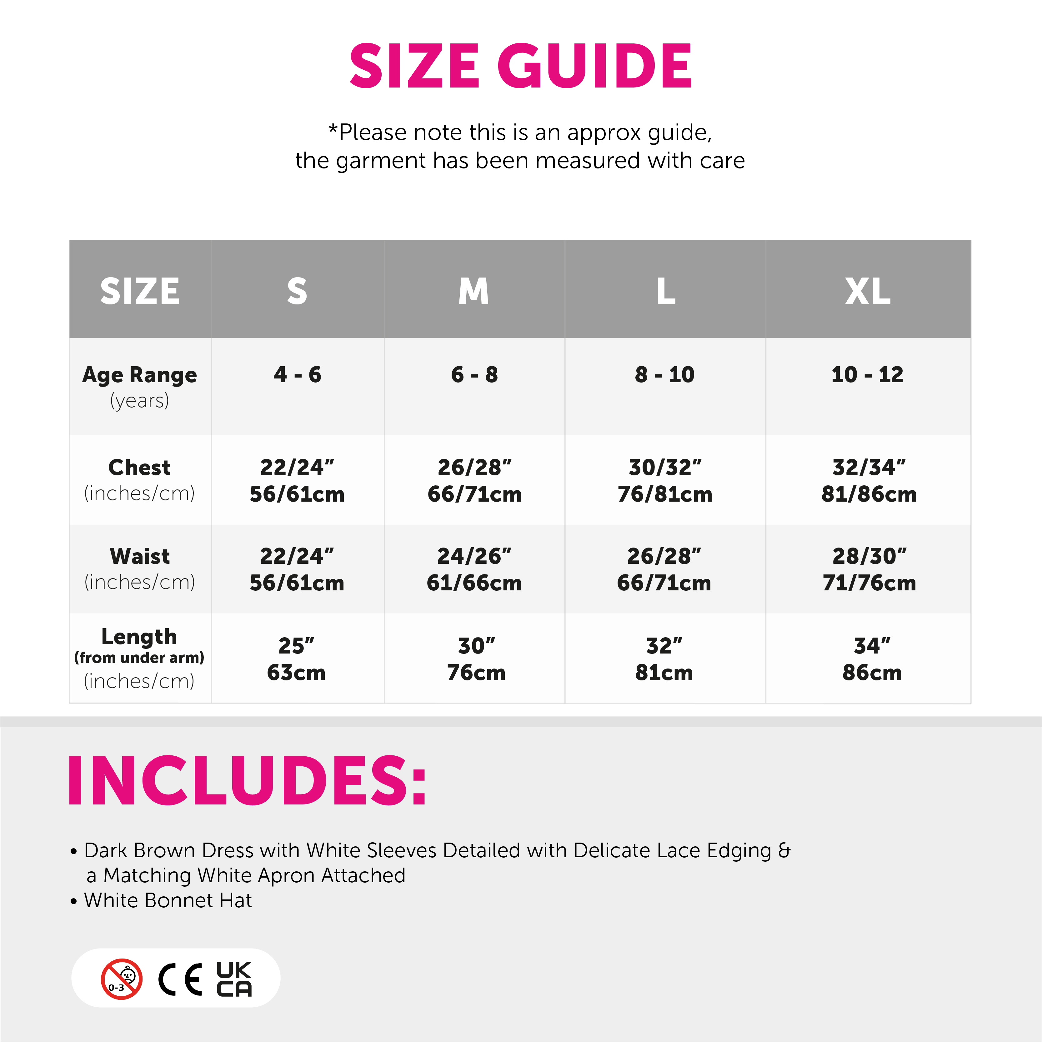 AVAILABLE IN MULTIPLE SIZES: Your Child's Tudor Maid Costume is available in multiple sizes, Small - X-Large: Small (4 - 6 years), Chest 22/24" (56/61cm), Waist 22/24" (56/61cm), Length (from under arm) 25" (63cm) | Medium (6 - 8 years), Chest 26/28" (66/71cm), Waist 24/26" (61/66cm), Length (from under arm) 30" (76cm) | Large (8 - 10 years), Chest 30/32" (76/81cm), Waist 26/28" (66/71cm), Length (from under arm) 32" (81cm) | X-Large (10 - 12 years), Chest 32/34" (81/86cm), Waist 28/30" (71/76cm), Length (from under arm) 34" (86cm)