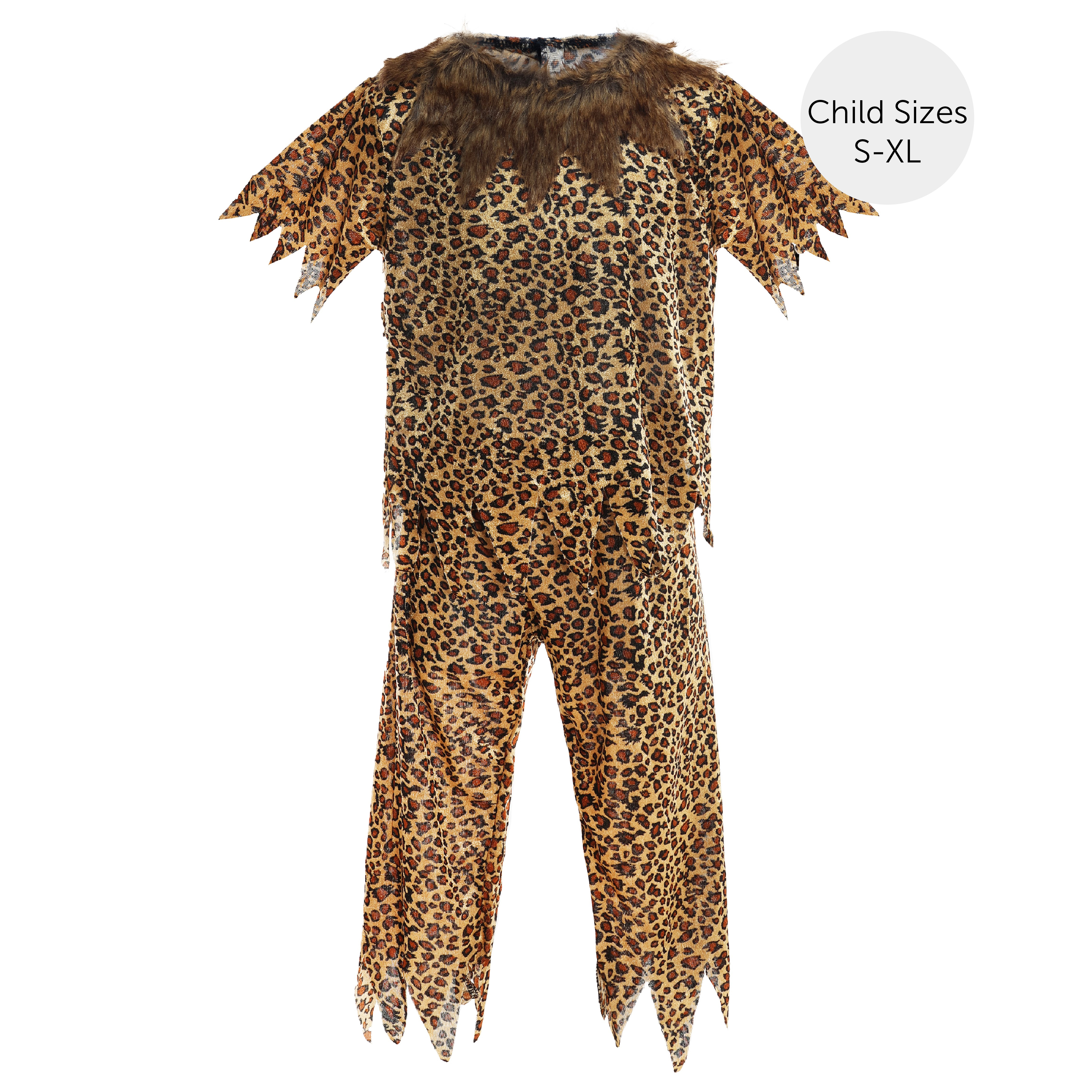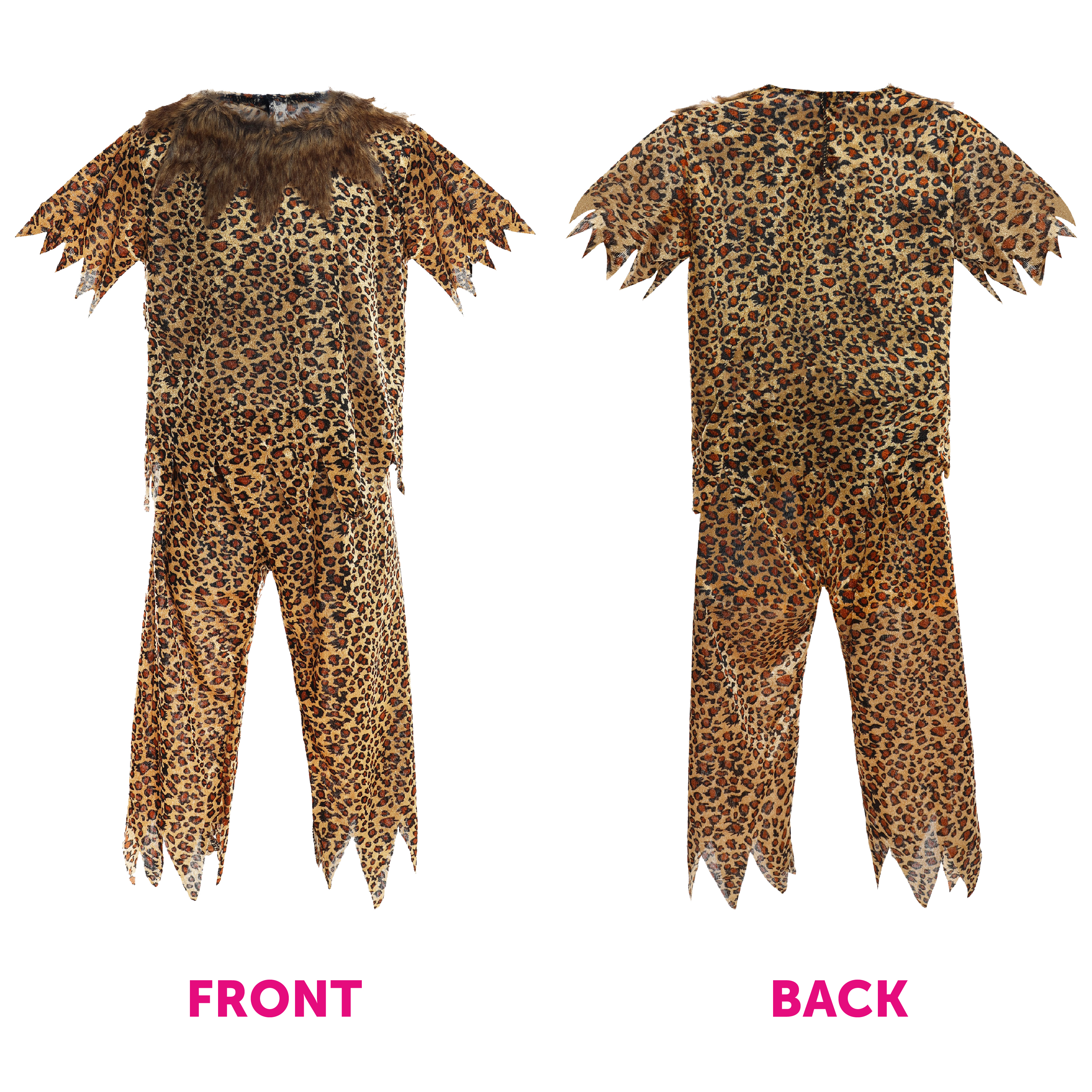 COSTUME DETAILS: This Child's Cave Dweller Costume is a soft-feeling Leopard Print Top with tattered edges and a Faux Fur Collar, and a matching pair of Leopard Print Trousers!