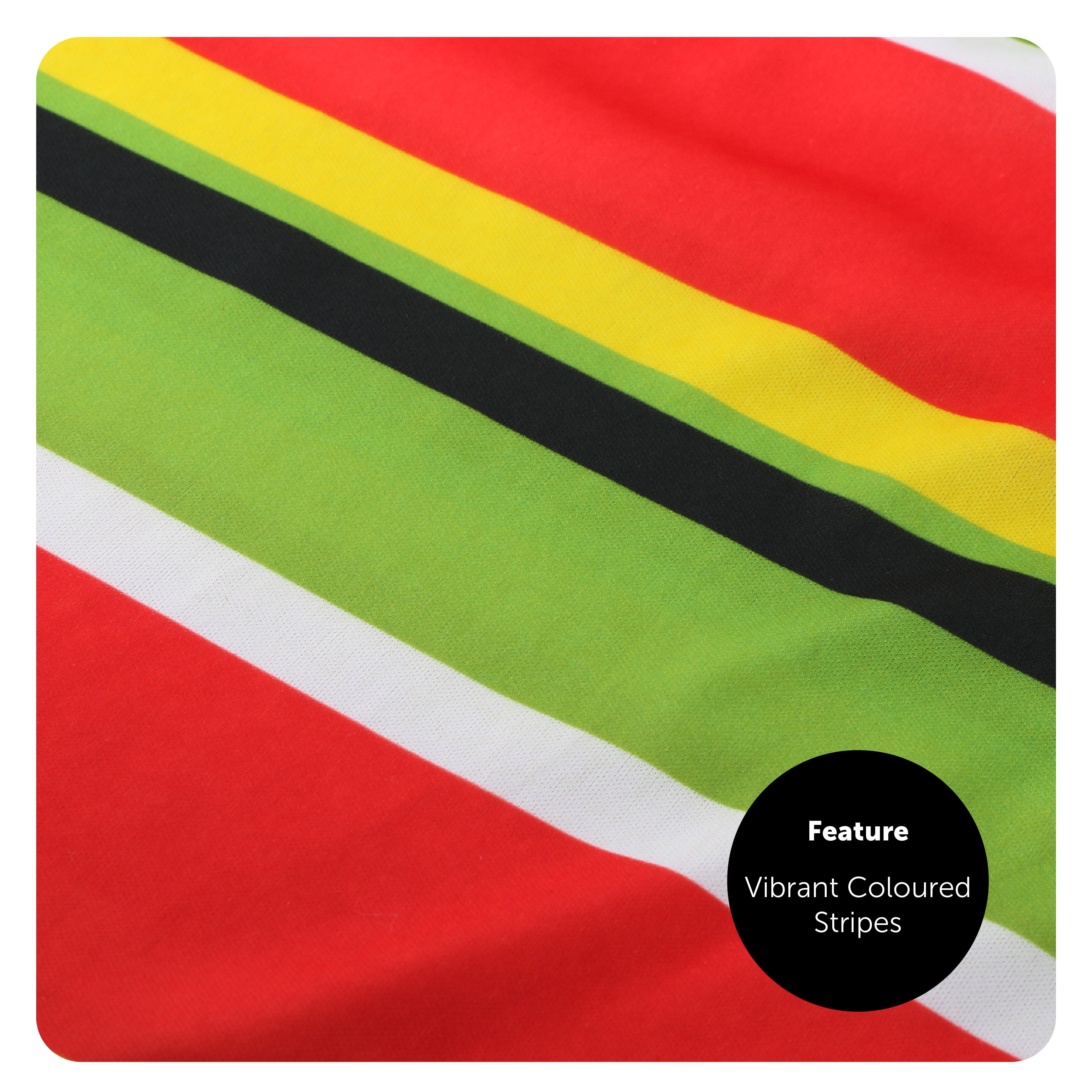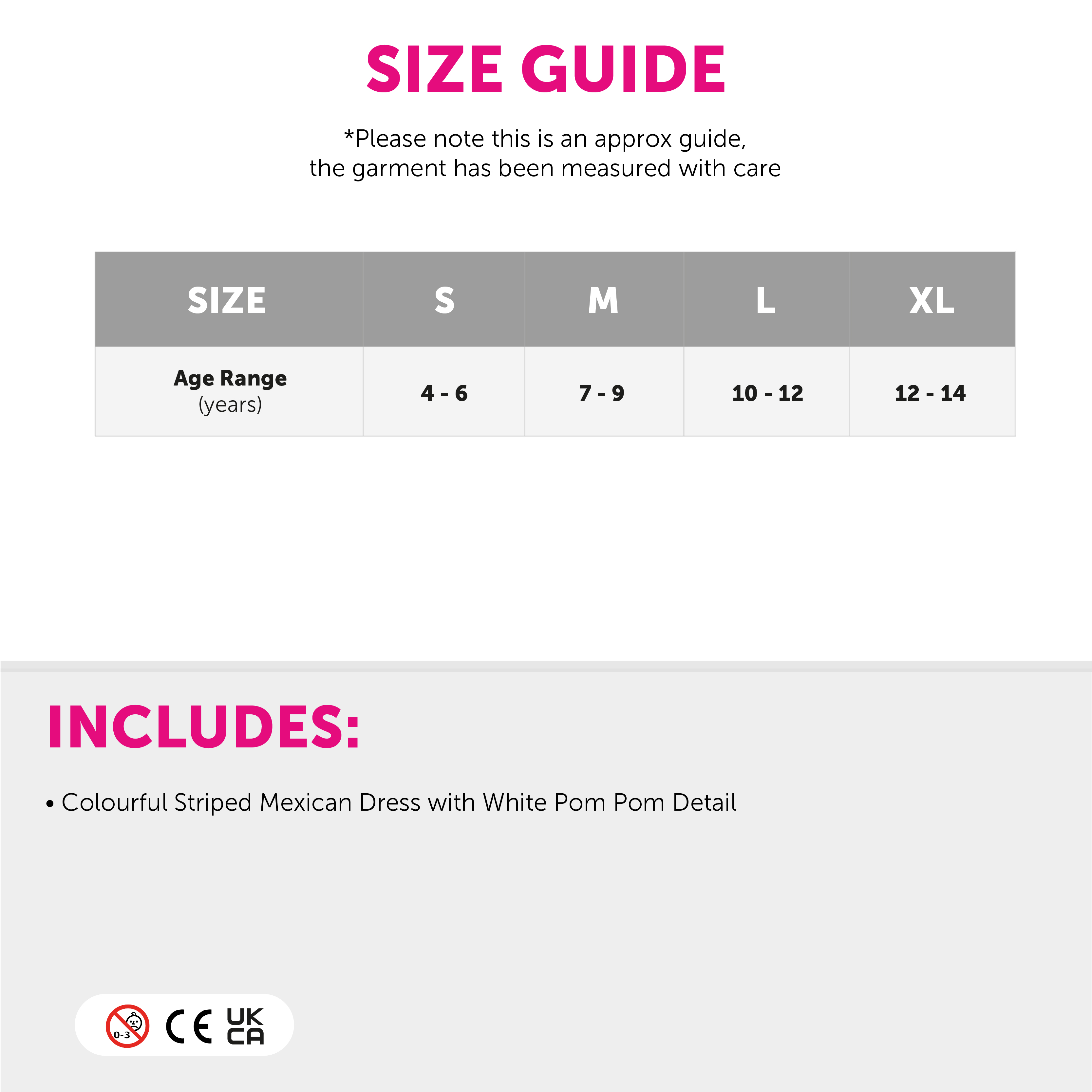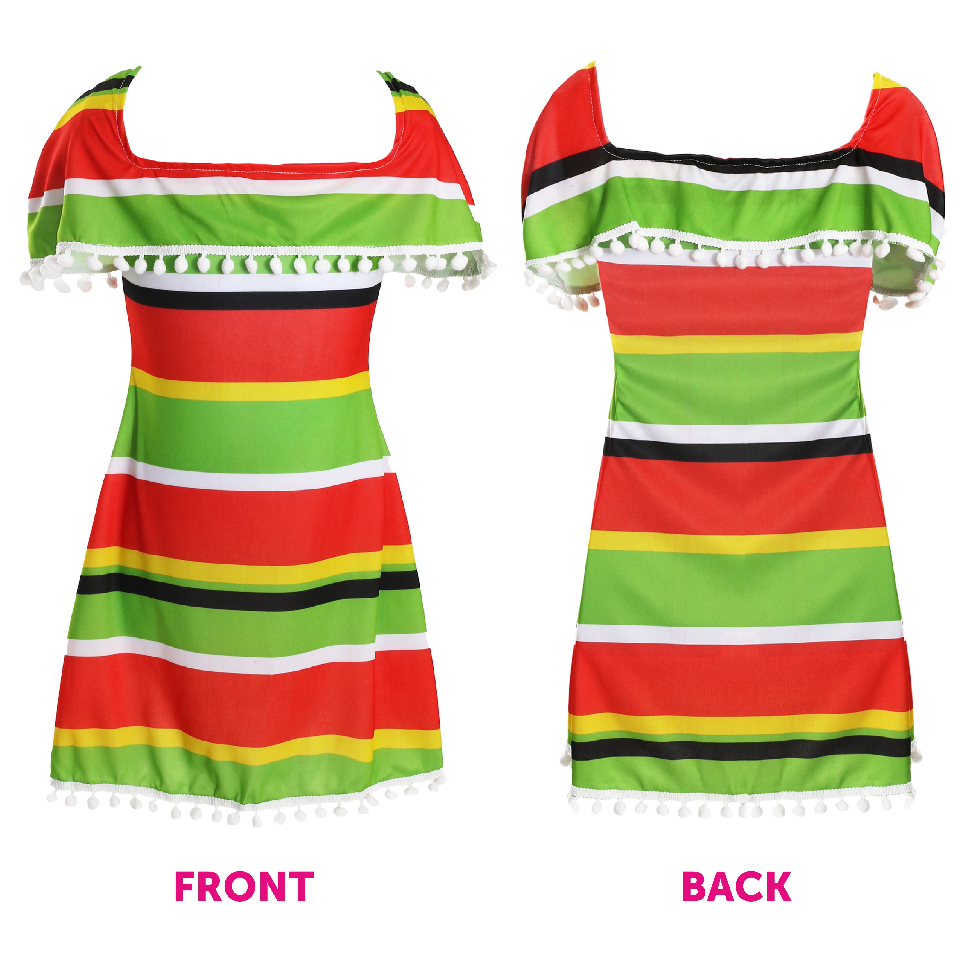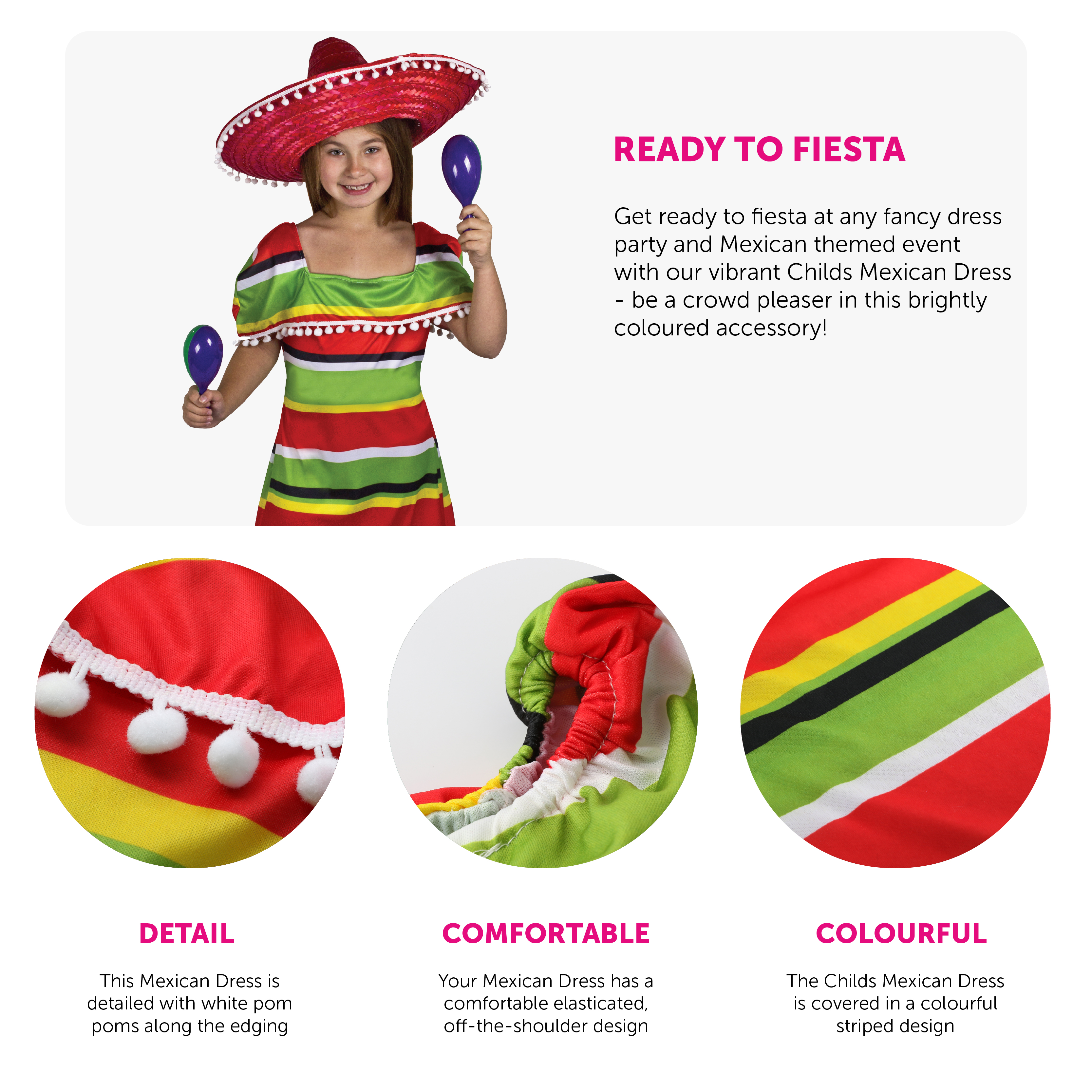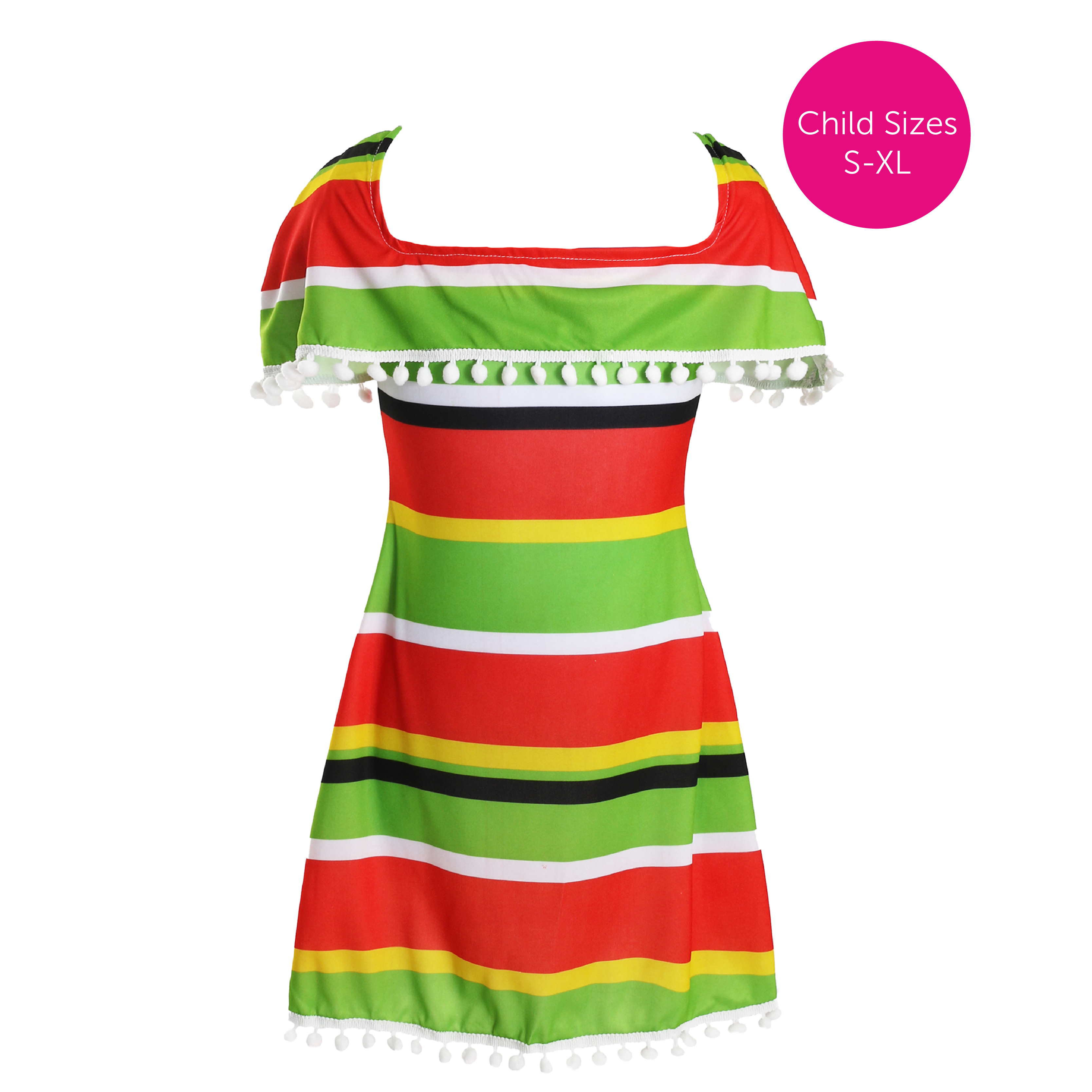MEXICAN DRESS DETAILS: Your Girls Mexican Dress is a striped Off-the-Shoulder dress with Pom-Pom layers and edging, with a multicoloured pallet of Green, Red, Yellow, Black, and White to make your dress stand out with style in traditional colours!