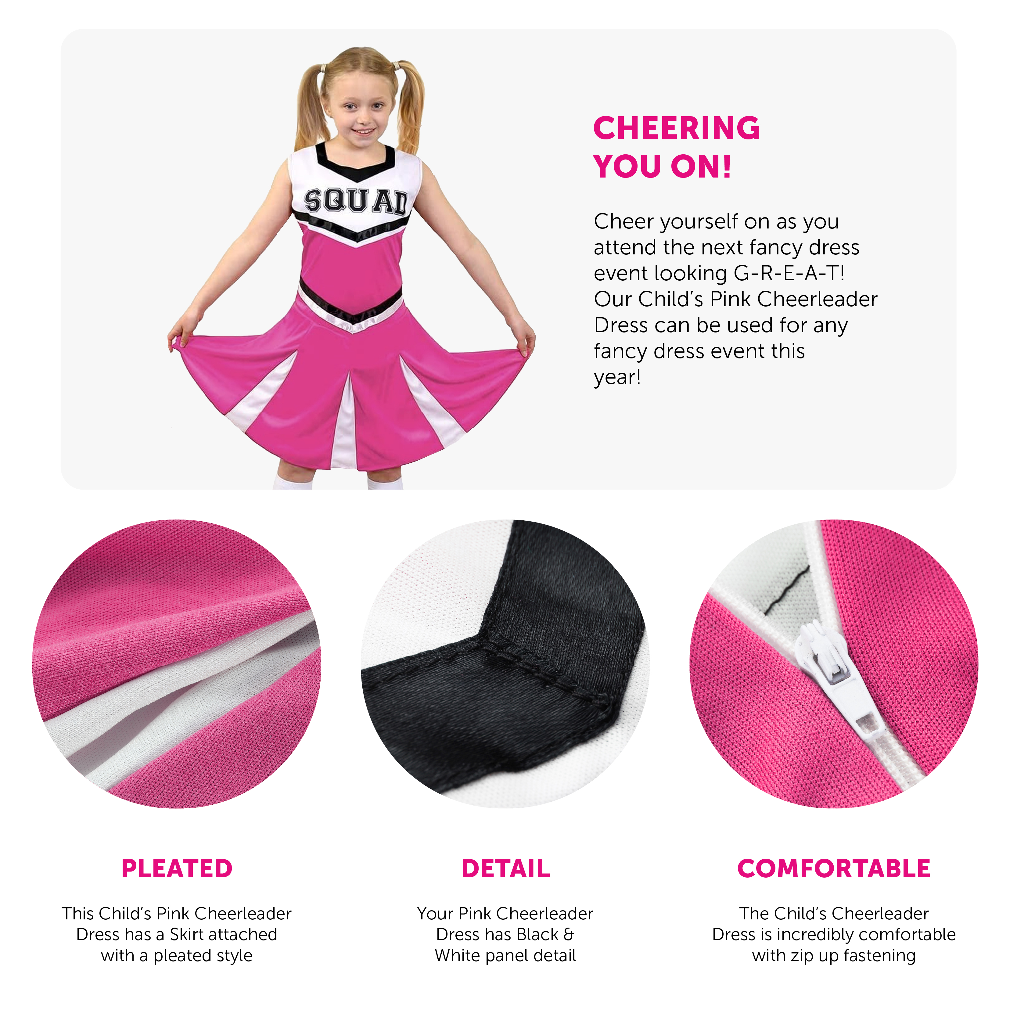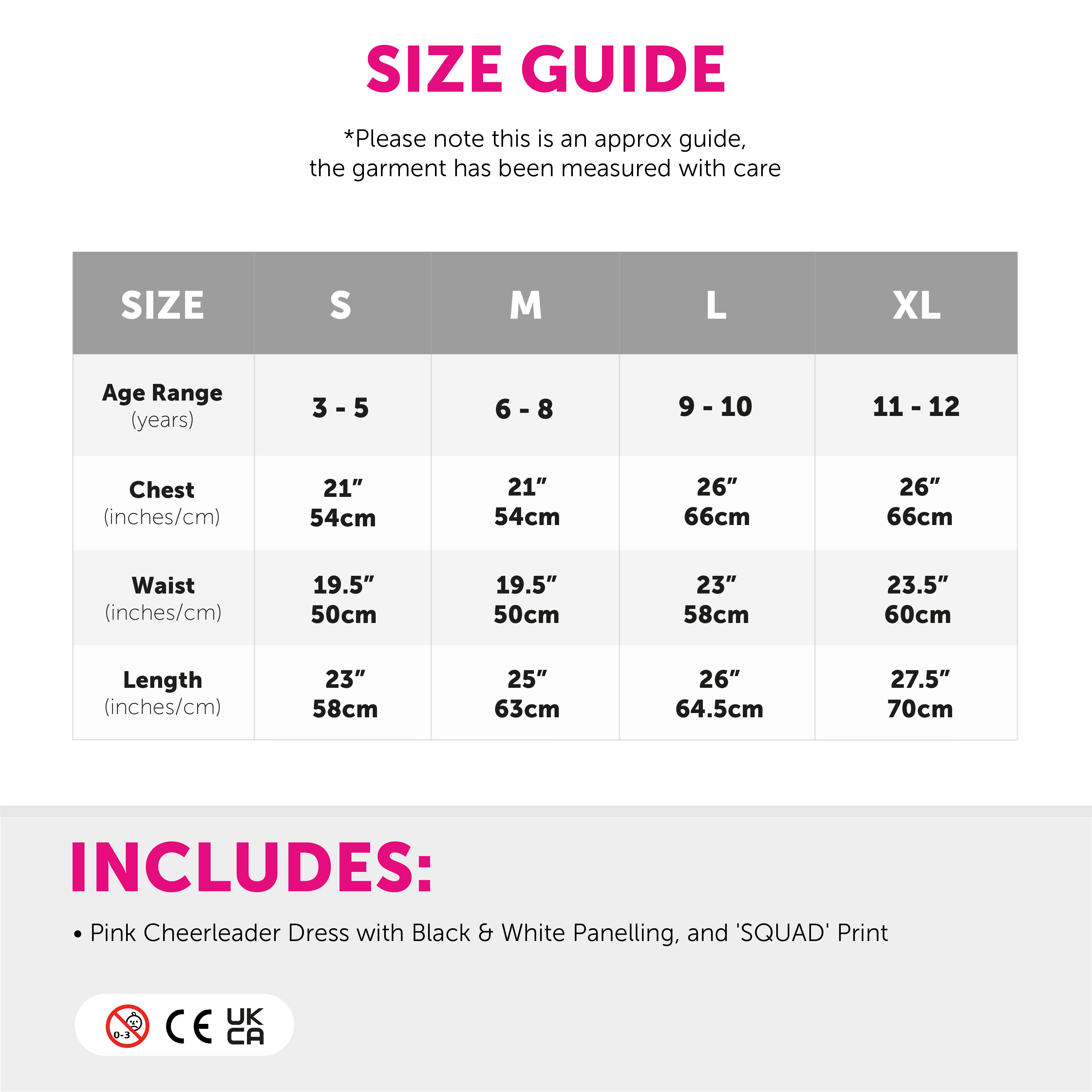 COSTUME INCLUDES: Your Child's Cheerleader Costume is a bright Pink Short Dress with a Pleated Skirt, Black and White panelling, and 'SQUAD' Printed on the front in a Large Black Font, the perfect Costume for any fancy dress event!