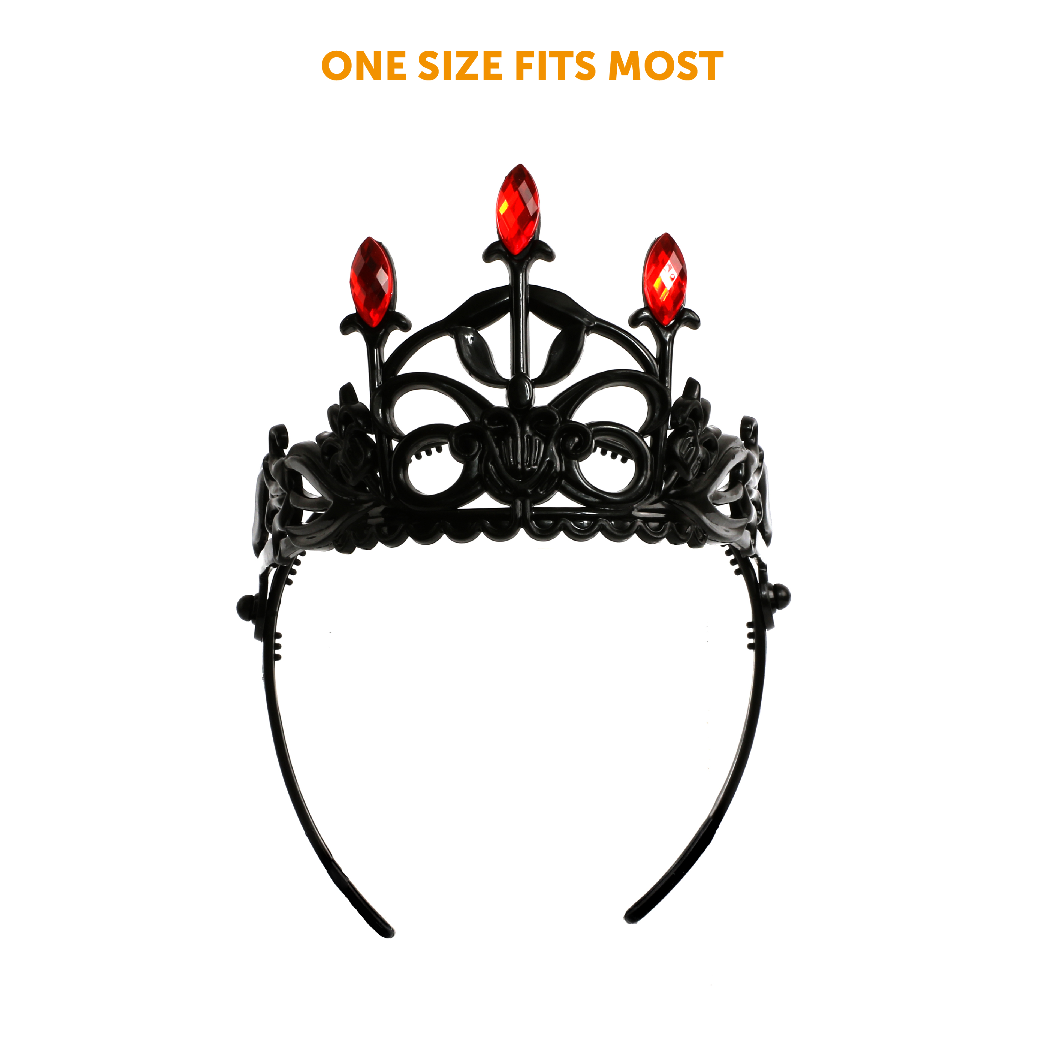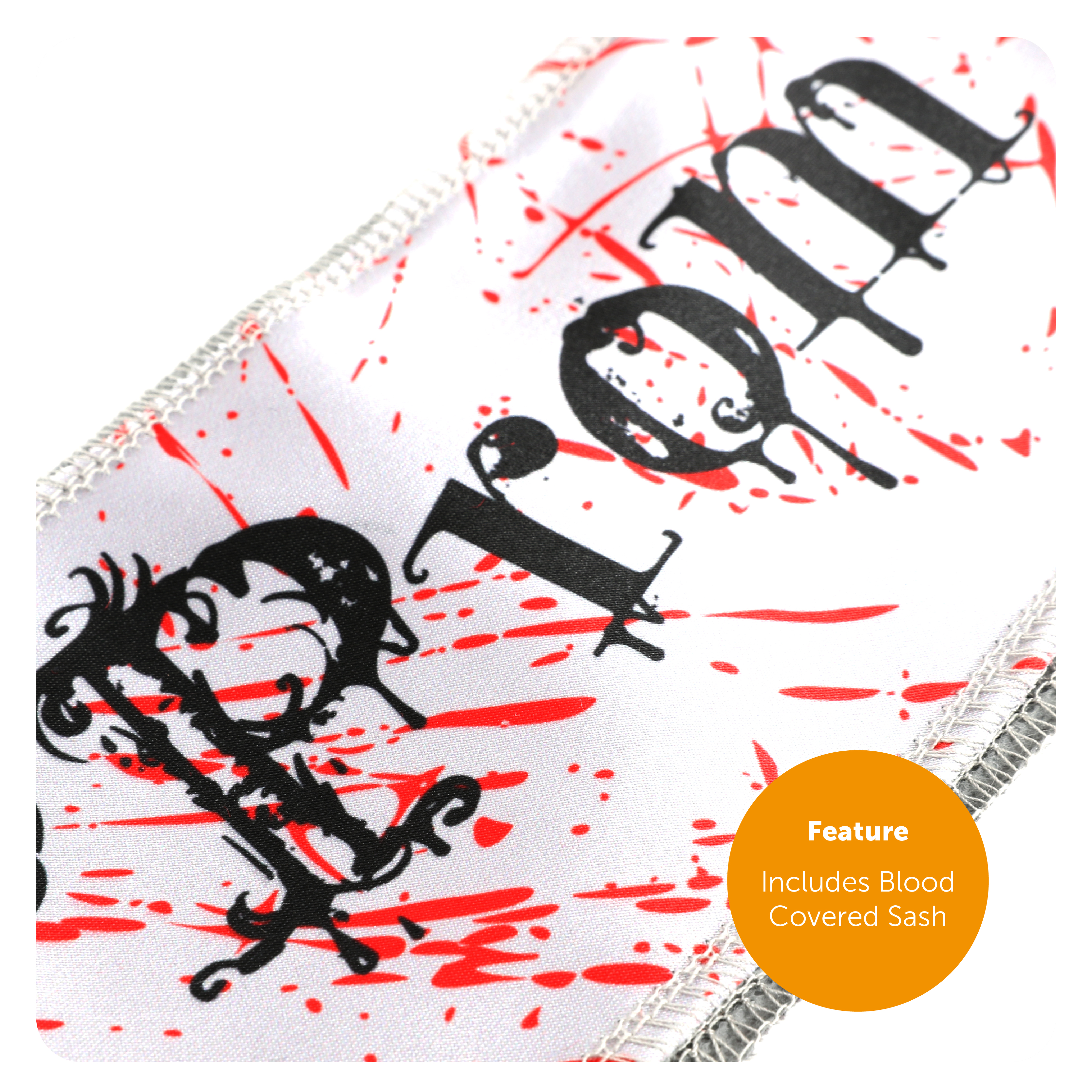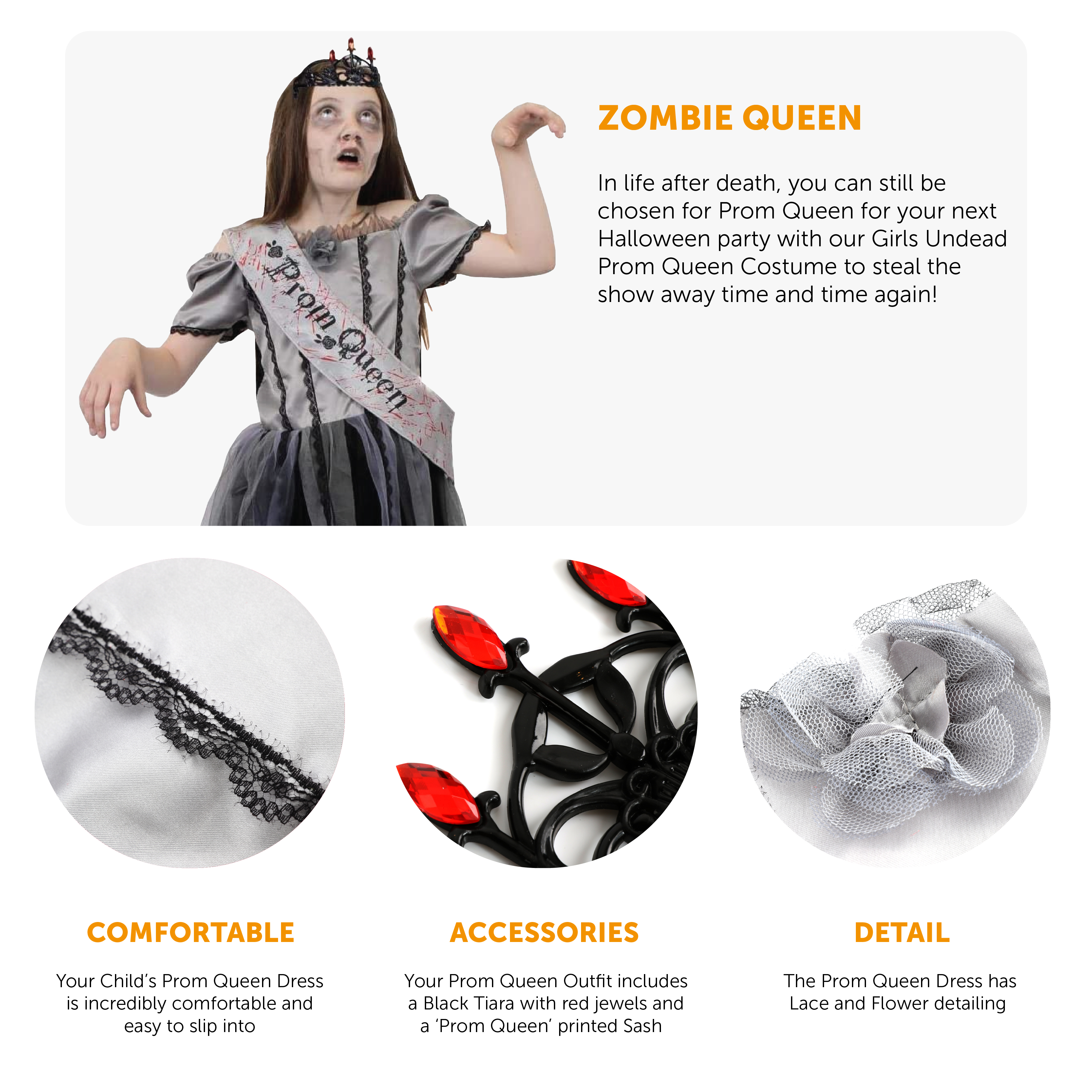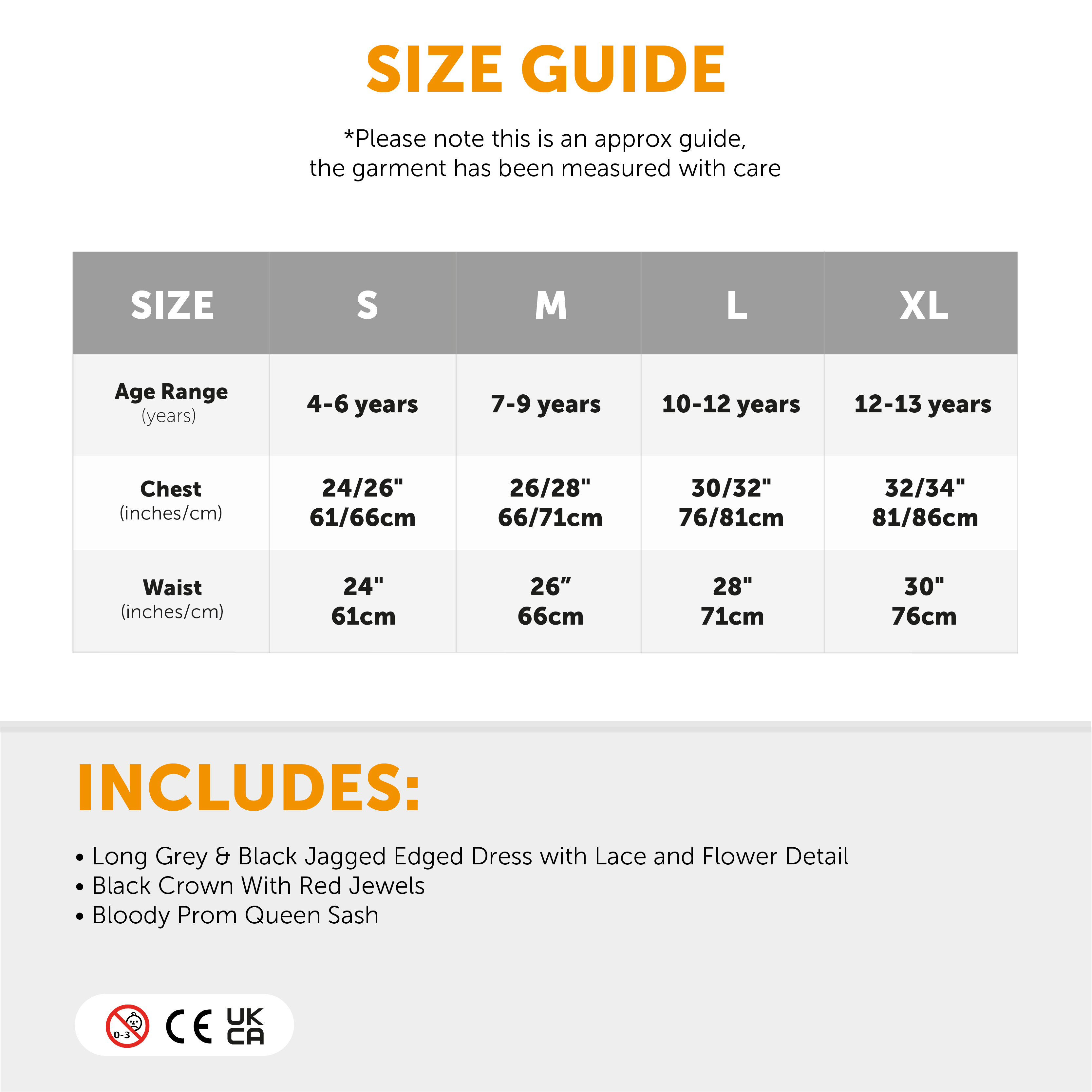 GIRLS UNDEAD PROM QUEEN DETAILS: Your Girls Prom Queen Costume includes a Long Jagged Edged Dress with Lace and Flower detailing, a Black Crown with red jewels, and a bloody Prom Queen sash to complete your look!