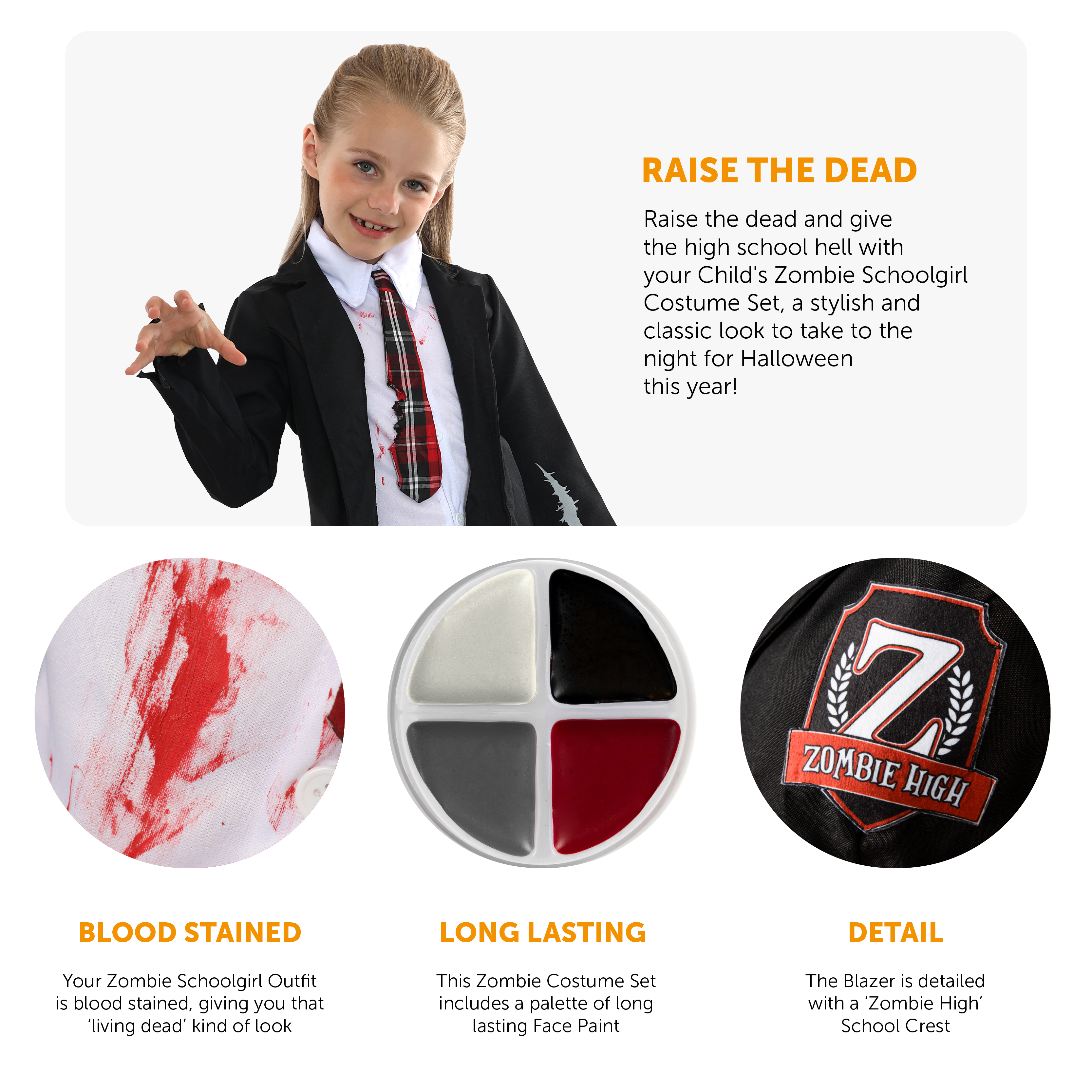 Girls Zombie Schoolgirl Halloween Costume With Bloody Tights, Facepaint, Blood & Boater £18.99