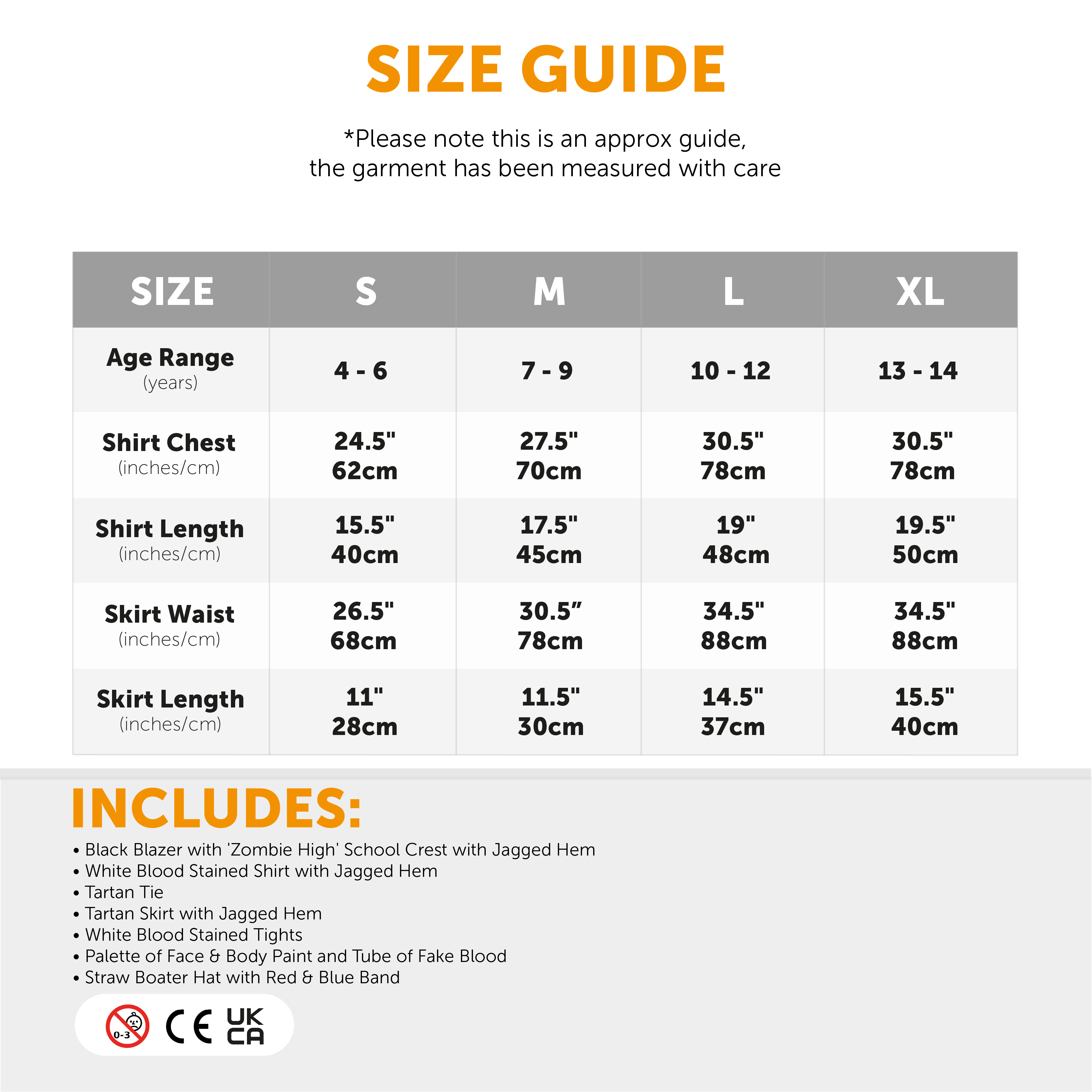 AVAILABLE IN MULTIPLE SIZES: Your Child's Zombie Schoolgirl Costume is available in multiple sizes from Small to X-Large: Small (4 - 6 years) Shirt Chest 24.5" (62cm), Shirt Length 15.5" (40cm), Skirt Waist 26.5" (68cm), Skirt Length 11" (28cm) | Medium (7 - 9 years) Shirt Chest 27.5" (70cm), Shirt Length 17.5" (45cm), Skirt Waist 30.5" (78cm), Skirt Length 11.5" (30cm) | Large (10 - 12 years) Shirt Chest 30.5" (78cm), Shirt Length 19" (48cm), Skirt Waist 34.5" (88cm), Skirt Length 14.5" (37cm) | X-Large (13 - 14 years) Shirt Chest 30.5" (78cm), Shirt Length 19.5" (50cm), Skirt Waist 34.5" (88cm), Skirt Length 15.5" (40cm)