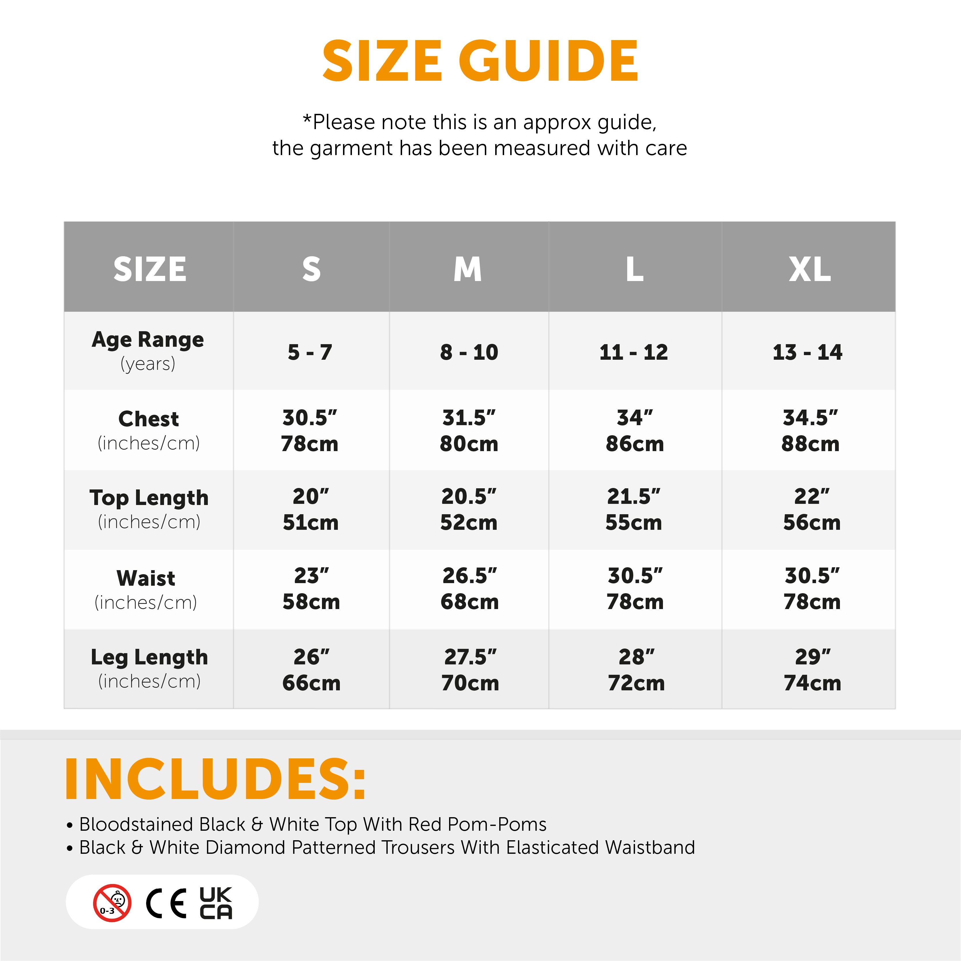 AVAILABLE IN MULTIPLE SIZES: Your Child Killer Clown Halloween Costumes are available in multiple sizes from Small to X-Large: Small (5 - 7 years) Chest 30.5" (78cm), Top Length 20" (51cm), Waist 23" (58cm), Leg Length 26" (66cm) | Medium (8 - 10 years) Chest 31.5" (80cm), Top Length 20.5" (52cm), Waist 26.5" (68cm), Leg Length 27.5" (70cm) | Large (11 - 12 years) Chest 34" (86cm), Top Length 21.5" (55cm), Waist 30.5" (78cm), Leg Length 28" (72cm) | X-Large (13 - 14 years) Chest 34.5" (88cm), Top Length 22" (56cm), Waist 30.5" (78cm), Leg Length 29" (74cm)