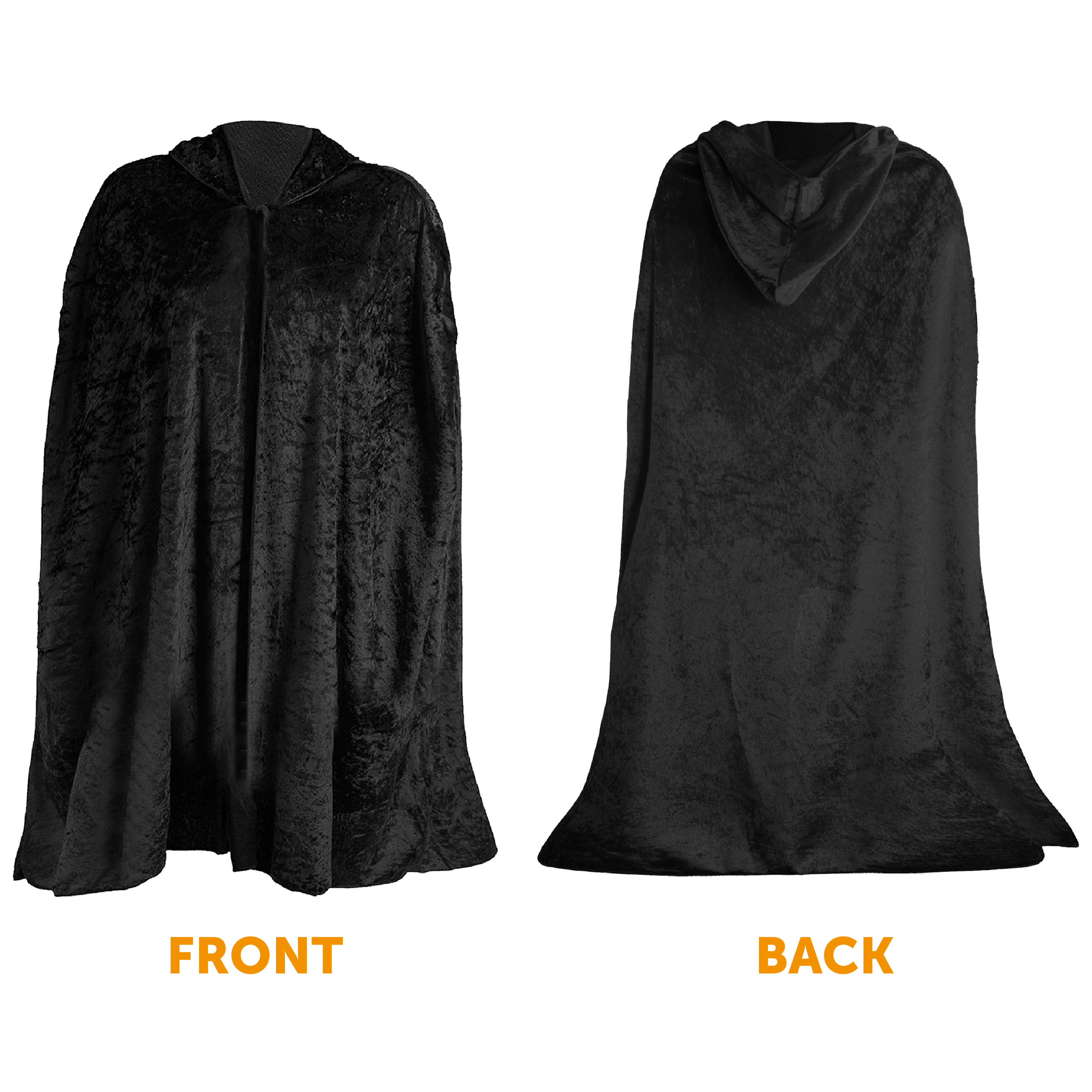 CHILDS LONG VELOUR CAPE DETAILS: Your Childs Black Velour Cape is a long, calve-length cape, with an attached hood on the cape, and a Black drawstring to tie the cape across your neck comfortably!